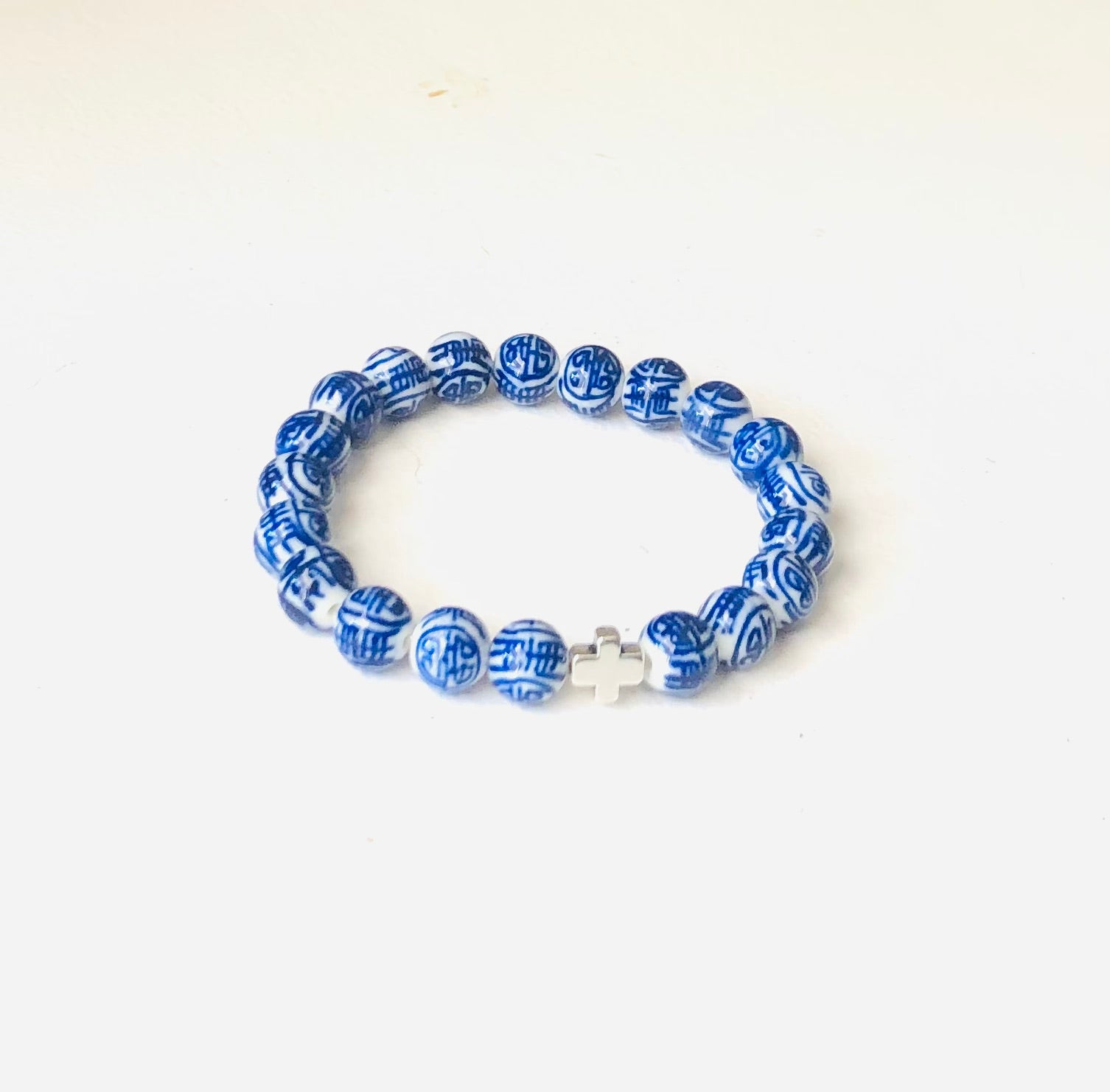 This blue and white chinoiserie hand beaded bracelet is one of my signature pieces. These blue and white porcelain beads are 10mm in size. They are sold individually, but are usually stacked with some of my other pieces. Each bracelet is made with porcelain beads and may vary in color and or size. This bracelet is made with a silver cross.