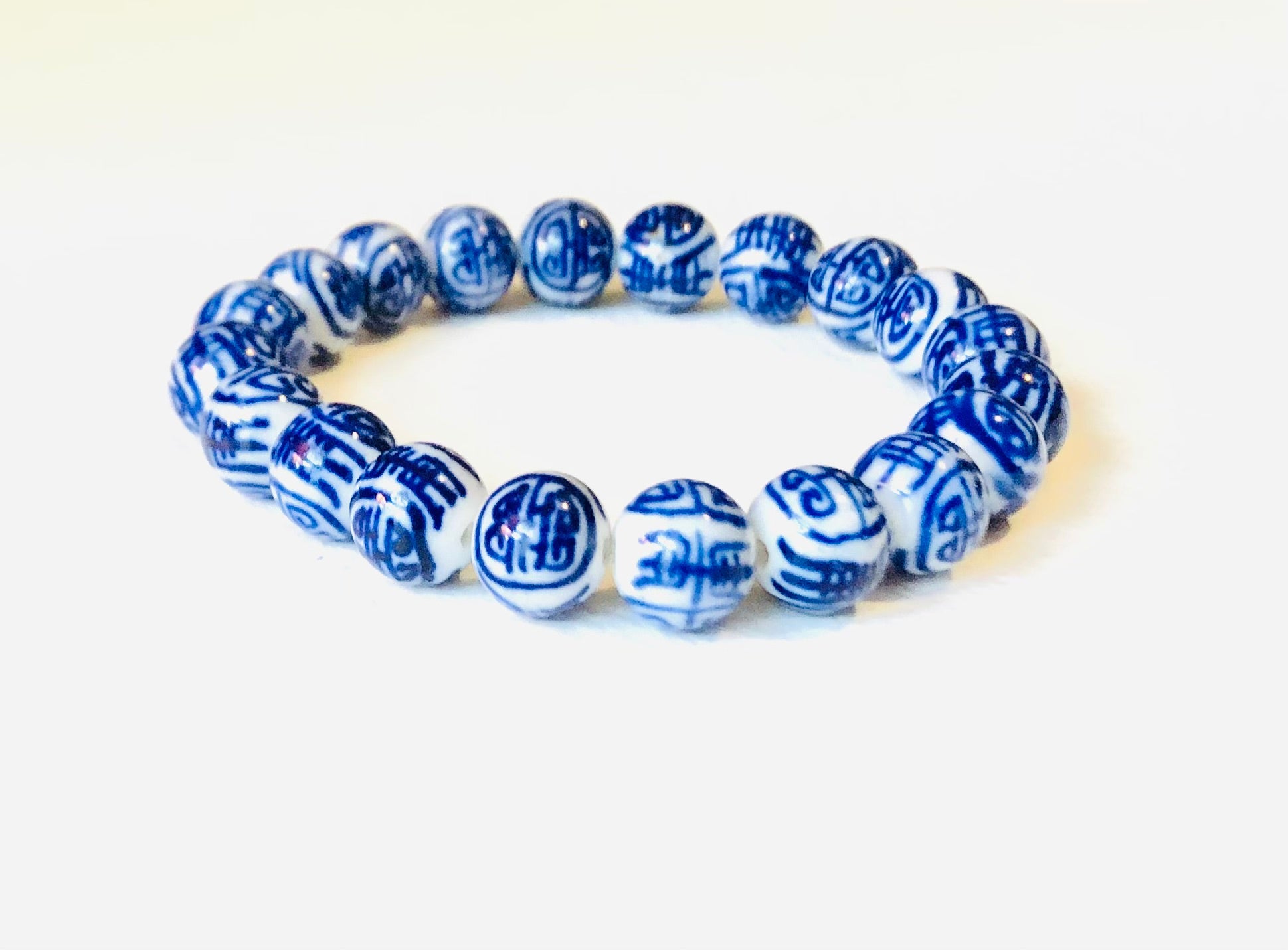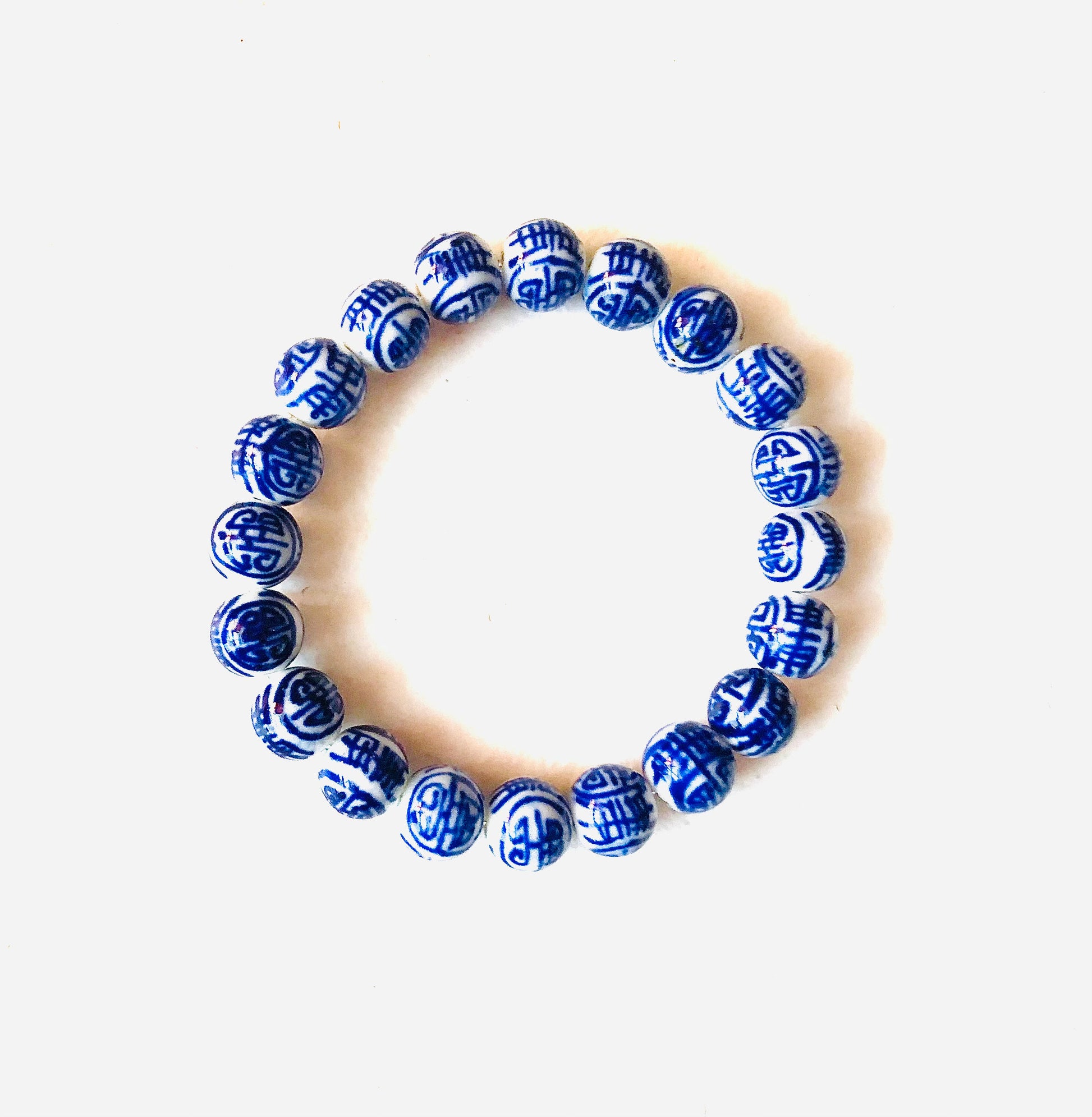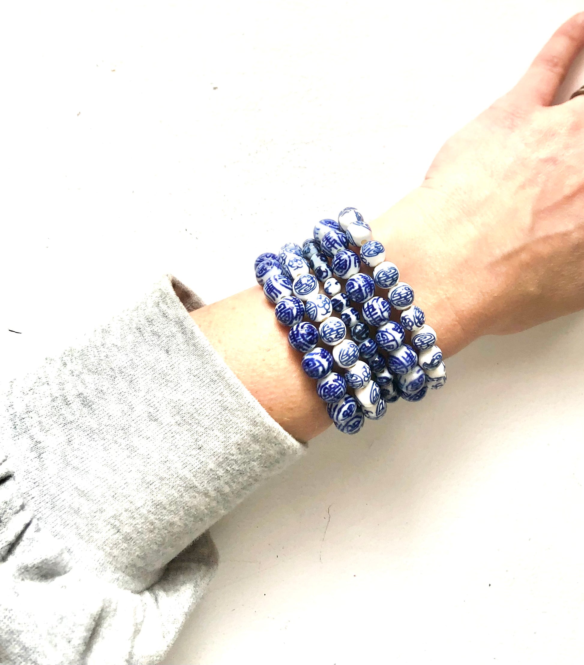 This bracelet is made with 8mm blue and white chinoiserie beads. Each bead is porcelain and may vary in size, shape, and or color. This bracelet is also elastic, making it easy to slide on!