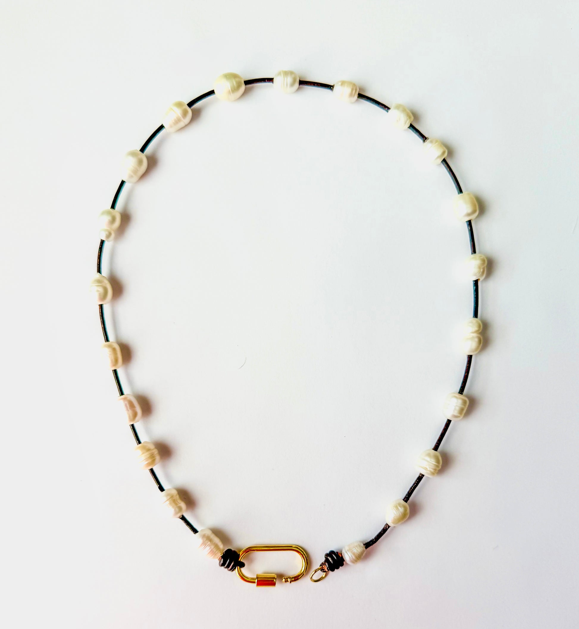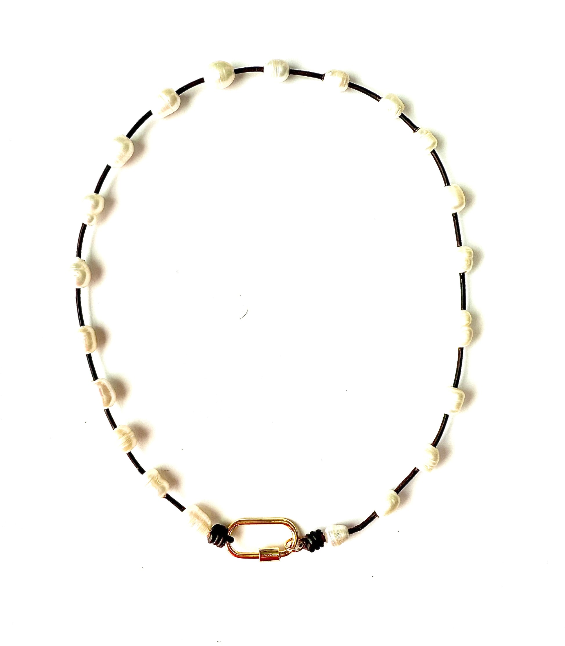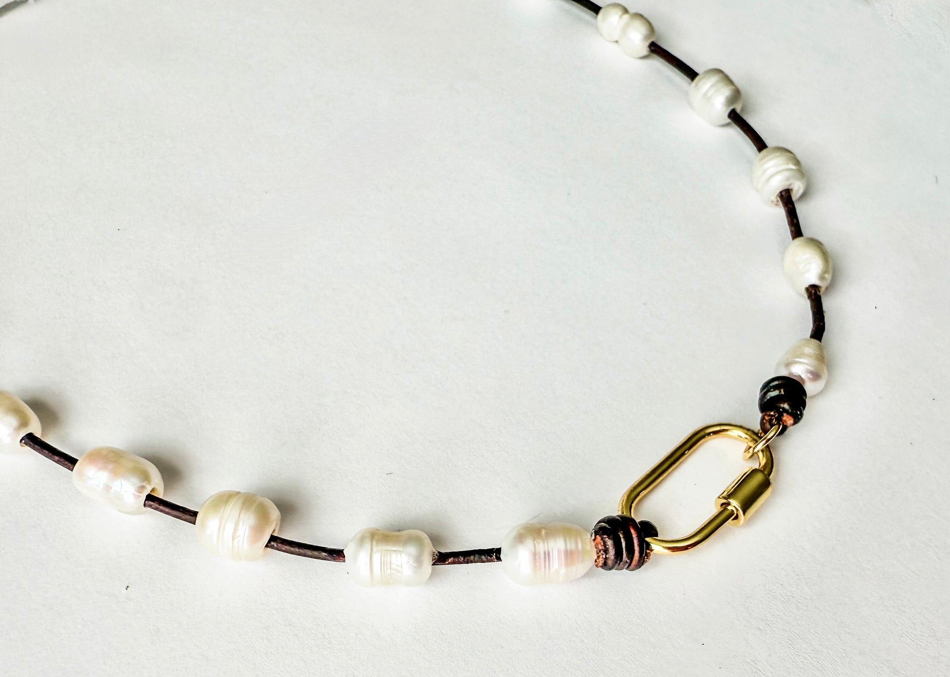 The Aubrey Necklace is made with leather cord, 9~11mm freshwater pearls and a gold plated carabiner clasp. The necklace measures 18 inches long.