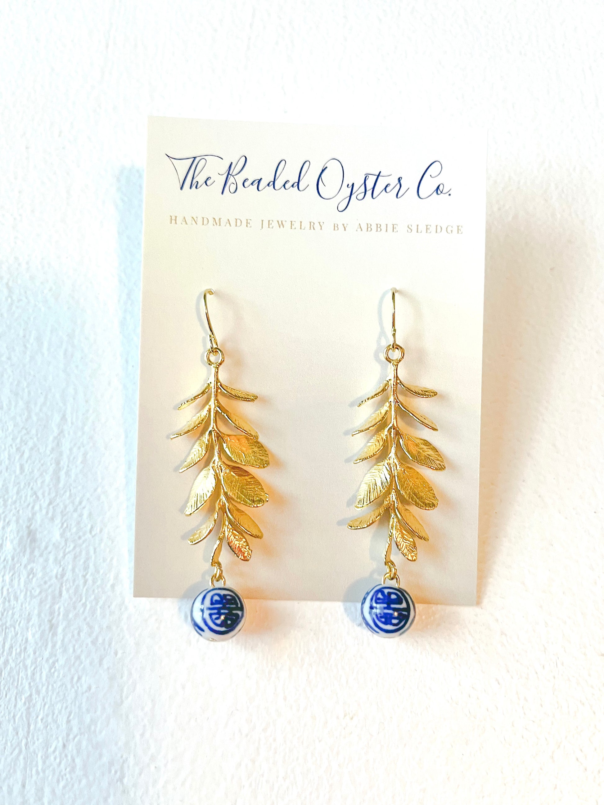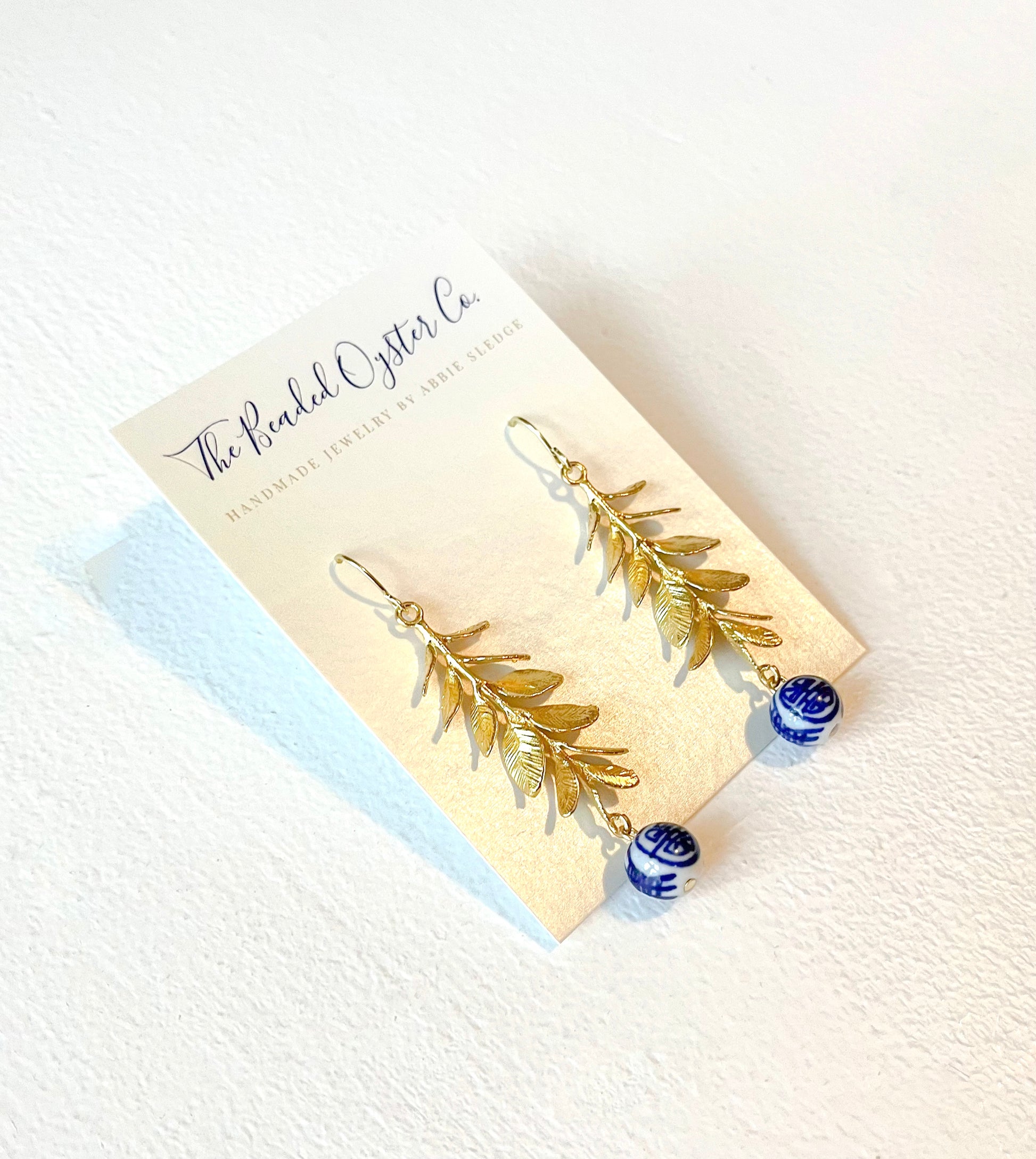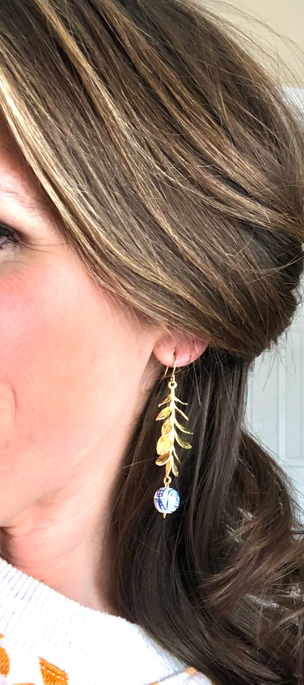 These earrings are made with a 10mm blue and white chinoiserie porcelain bead and a brass leaf pendant. The earrings measure about 2.5 inches long.