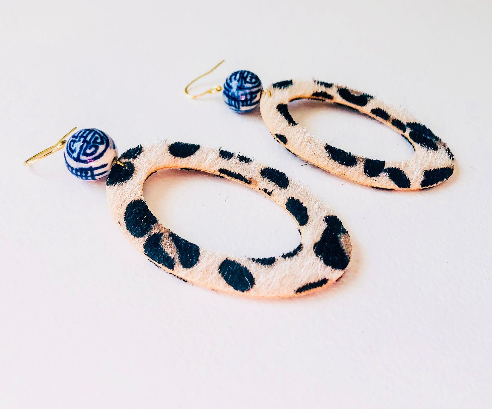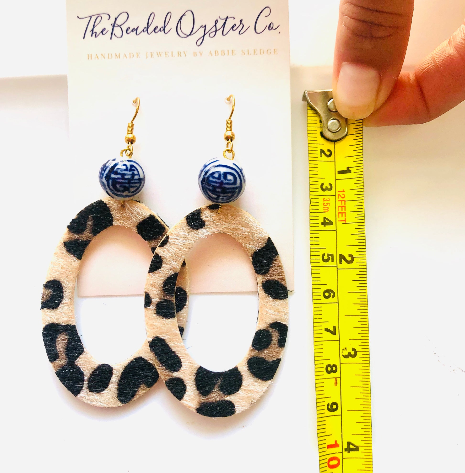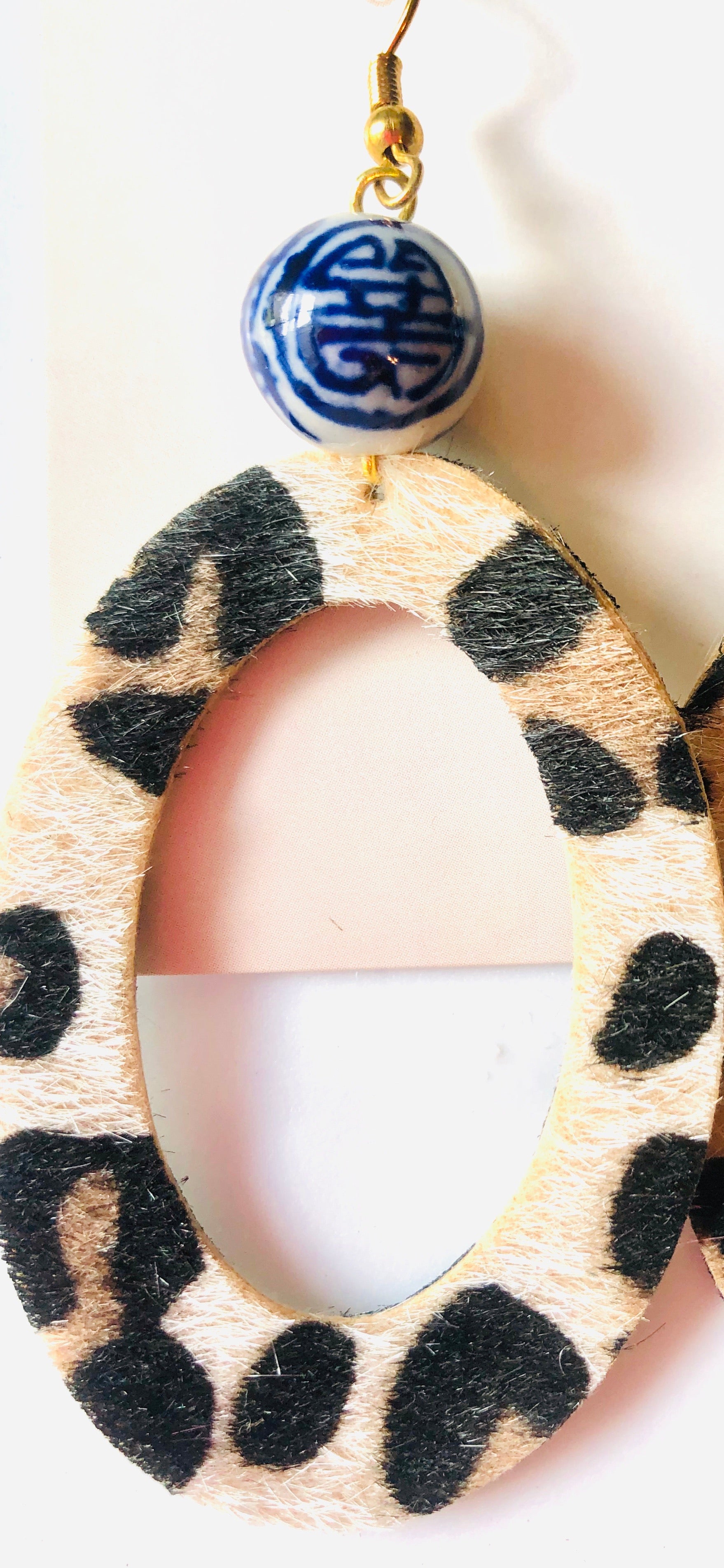 These leopard and blue and white chinoiserie earrings are made of faux leopard and a 12 mm blue and white chinoiserie porcelain bead. They are very light weight and measure about 3.5 inches long. The blue and white chinoiserie bead is porcelain and may vary in size, color, and or shape.