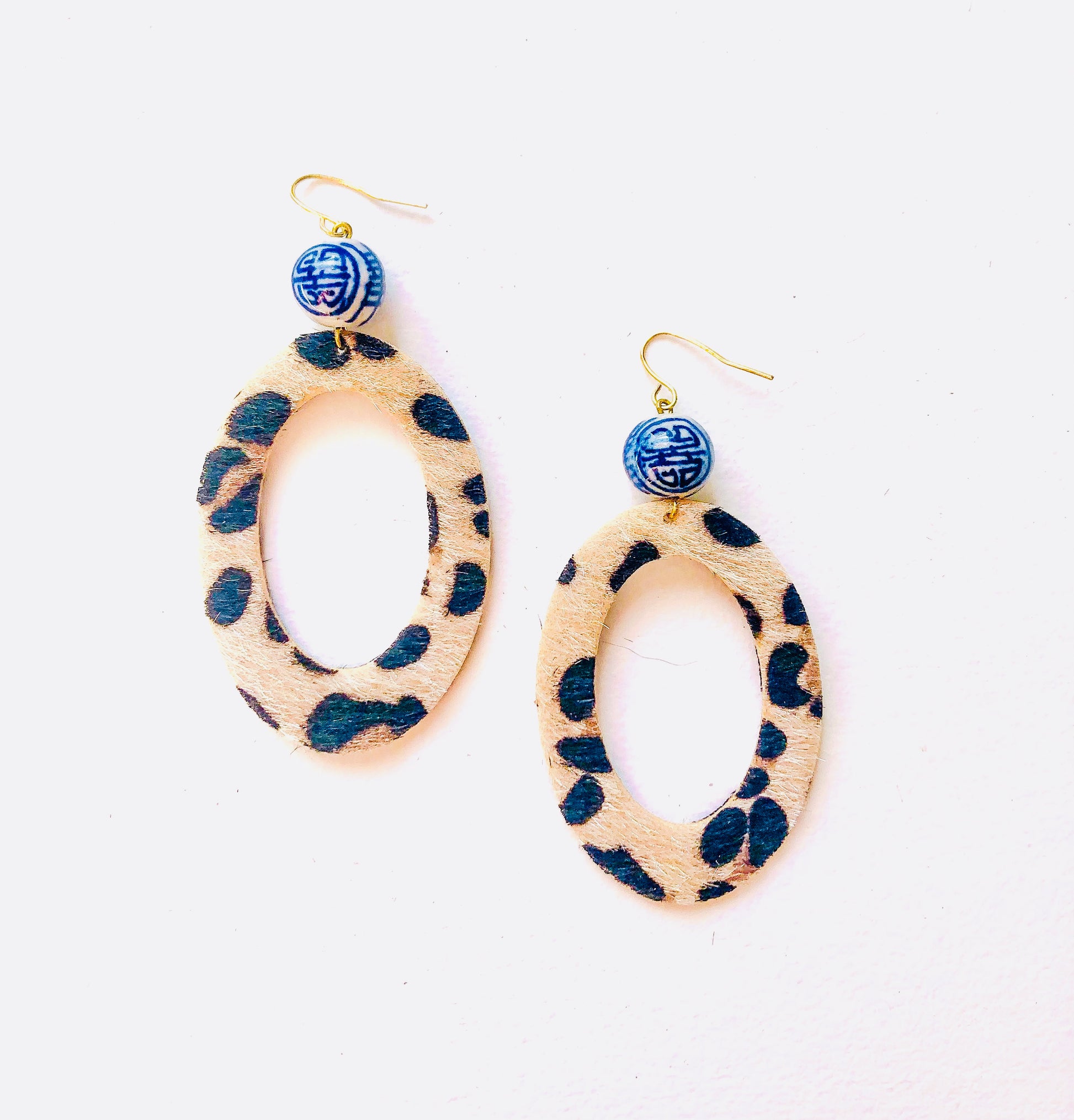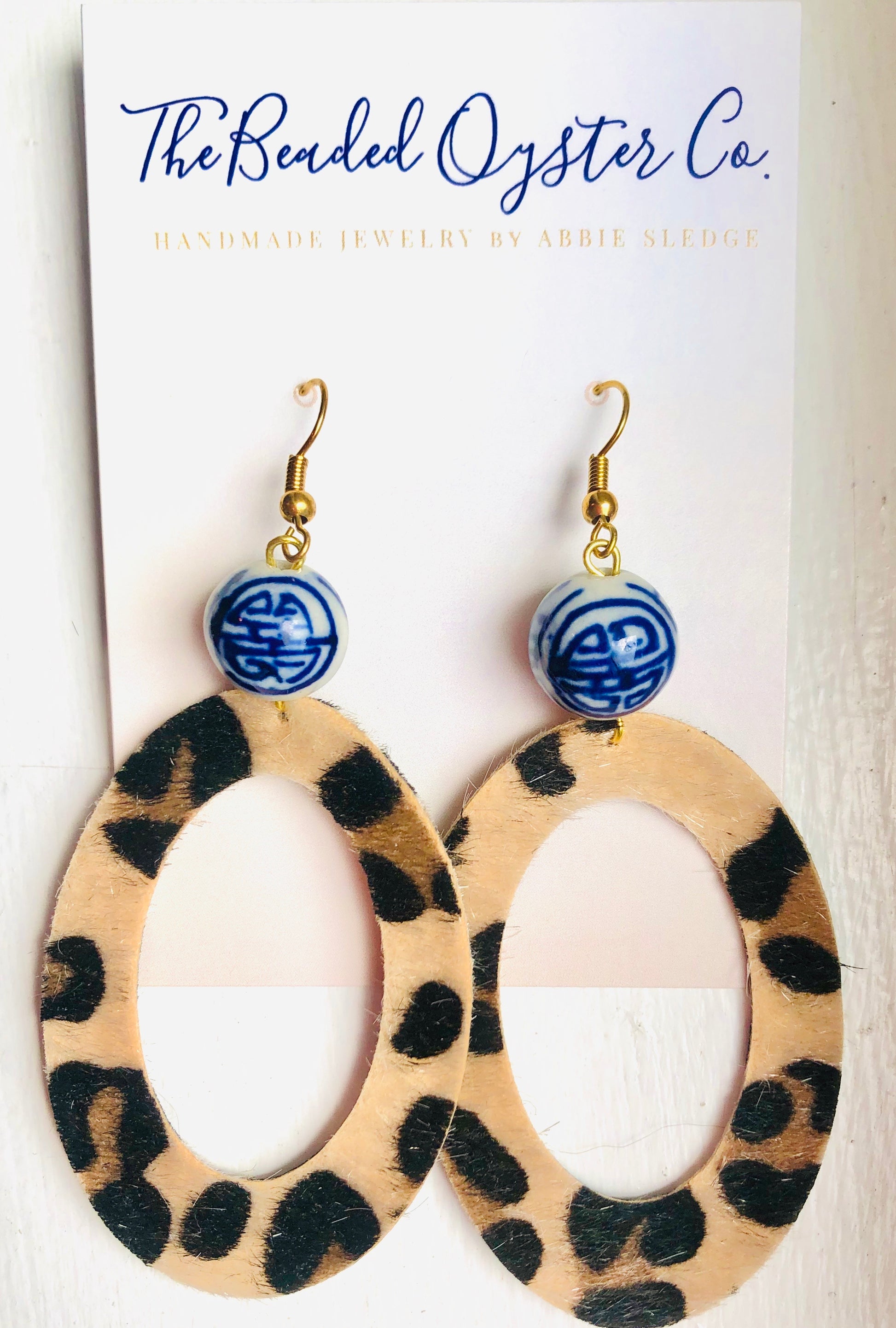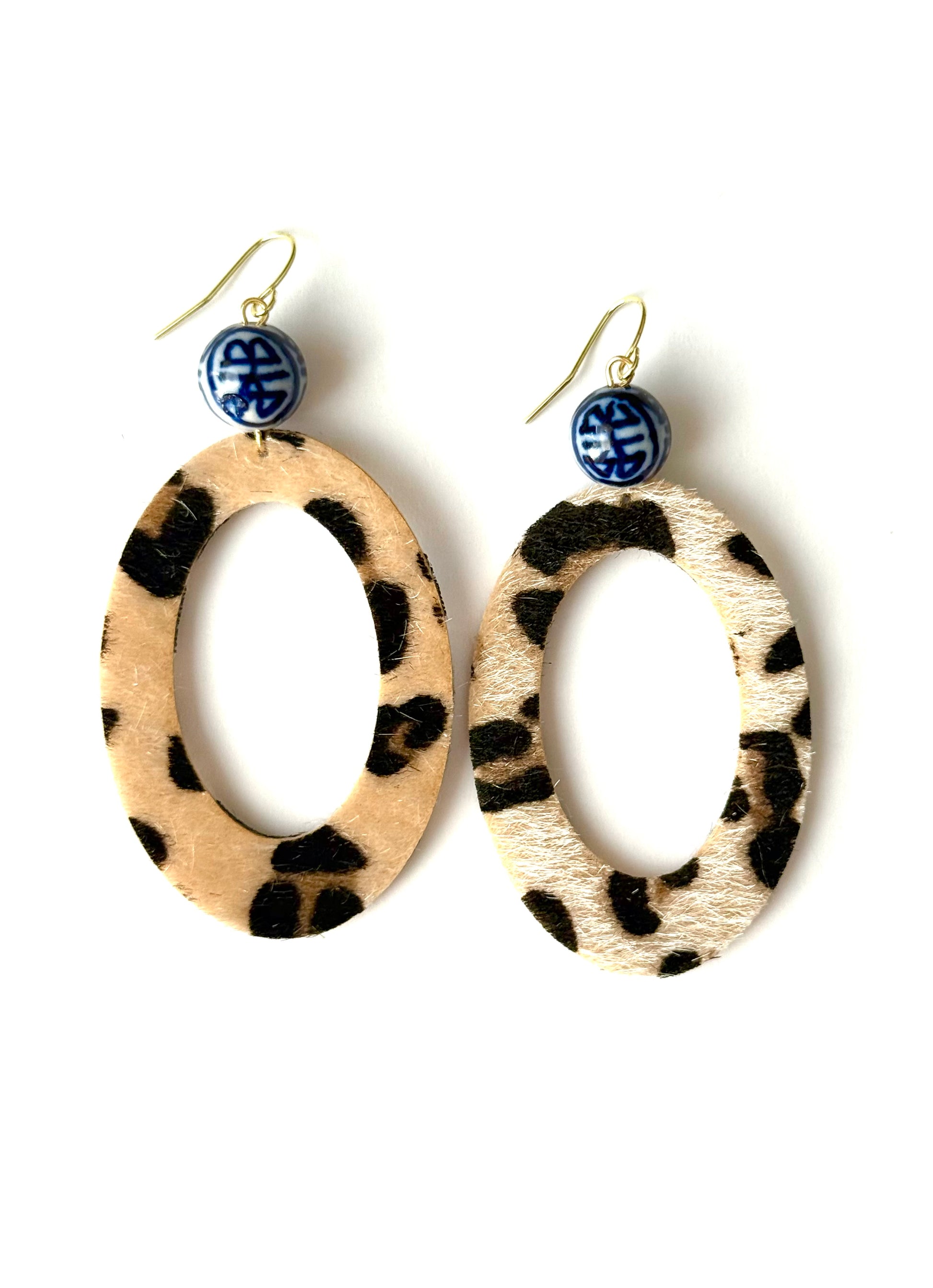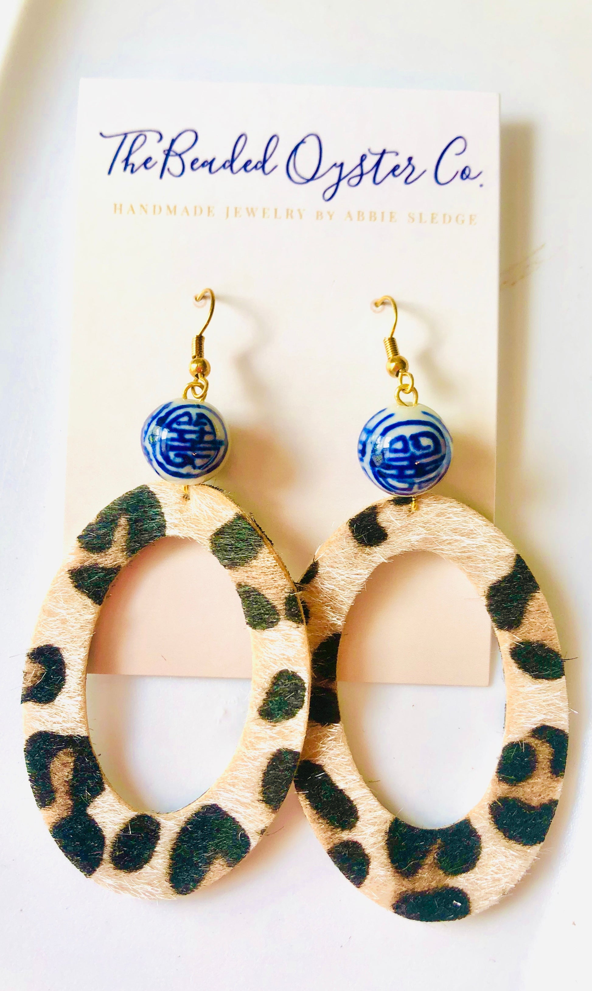 These leopard and blue and white chinoiserie earrings are made of faux leopard and a 12 mm blue and white chinoiserie porcelain bead. They are very light weight and measure about 3.5 inches long. The blue and white chinoiserie bead is porcelain and may vary in size, color, and or shape.