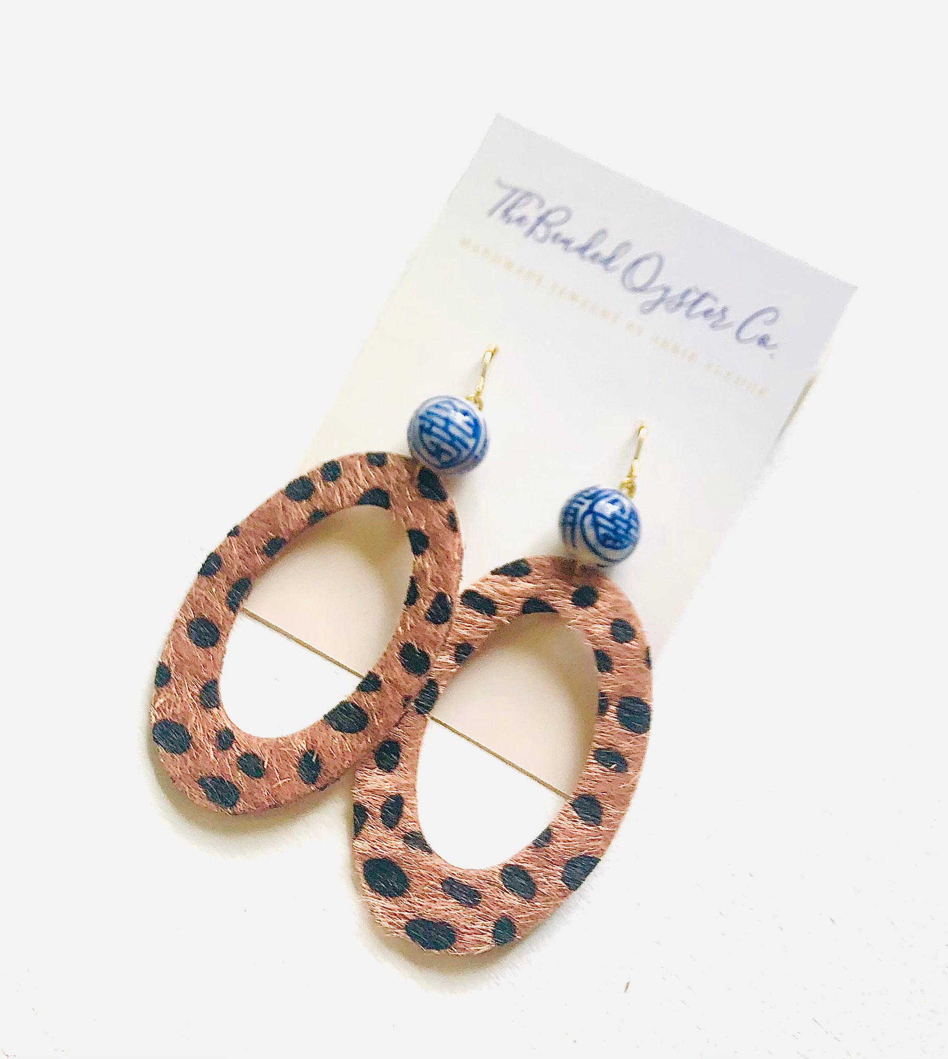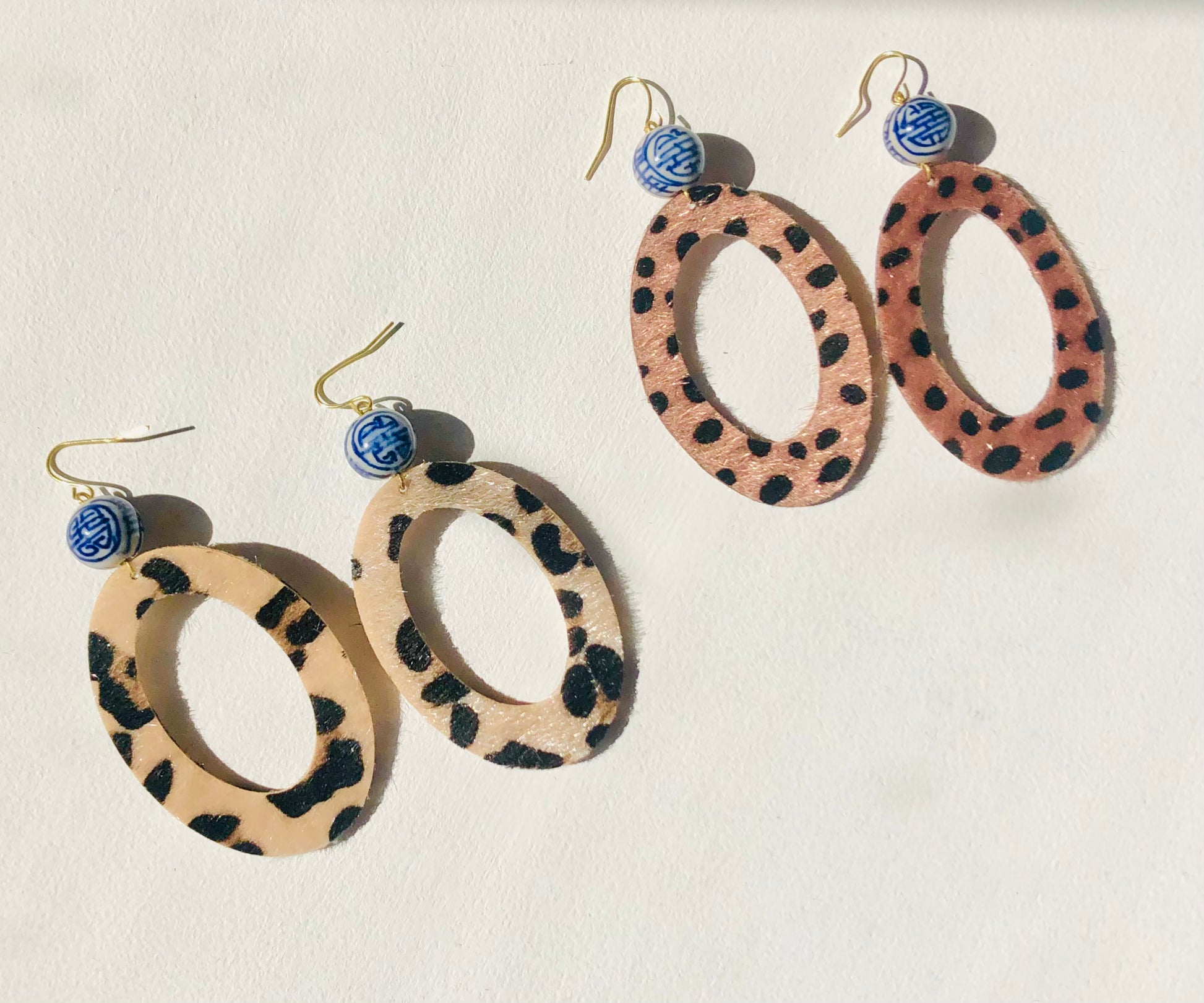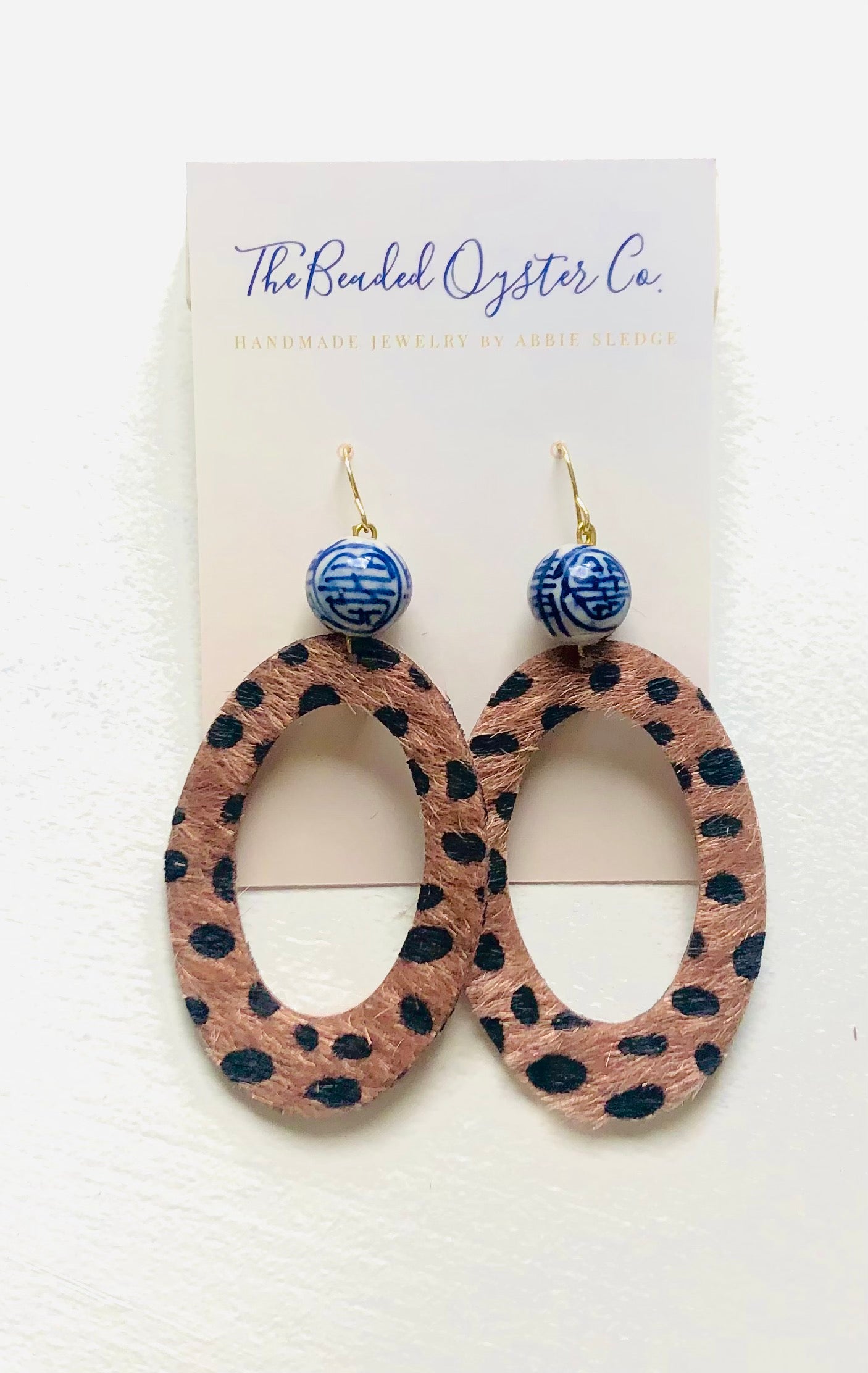 These blue and white chinoiserie and spotted oval earrings are made with a faux spotted oval pendant and a 12 mm blue and white chinoiserie porcelain bead. They are very light weight and measure about 3.5 inches long. The blue and white chinoiserie bead is porcelain and may vary in size, color, and or shape.
