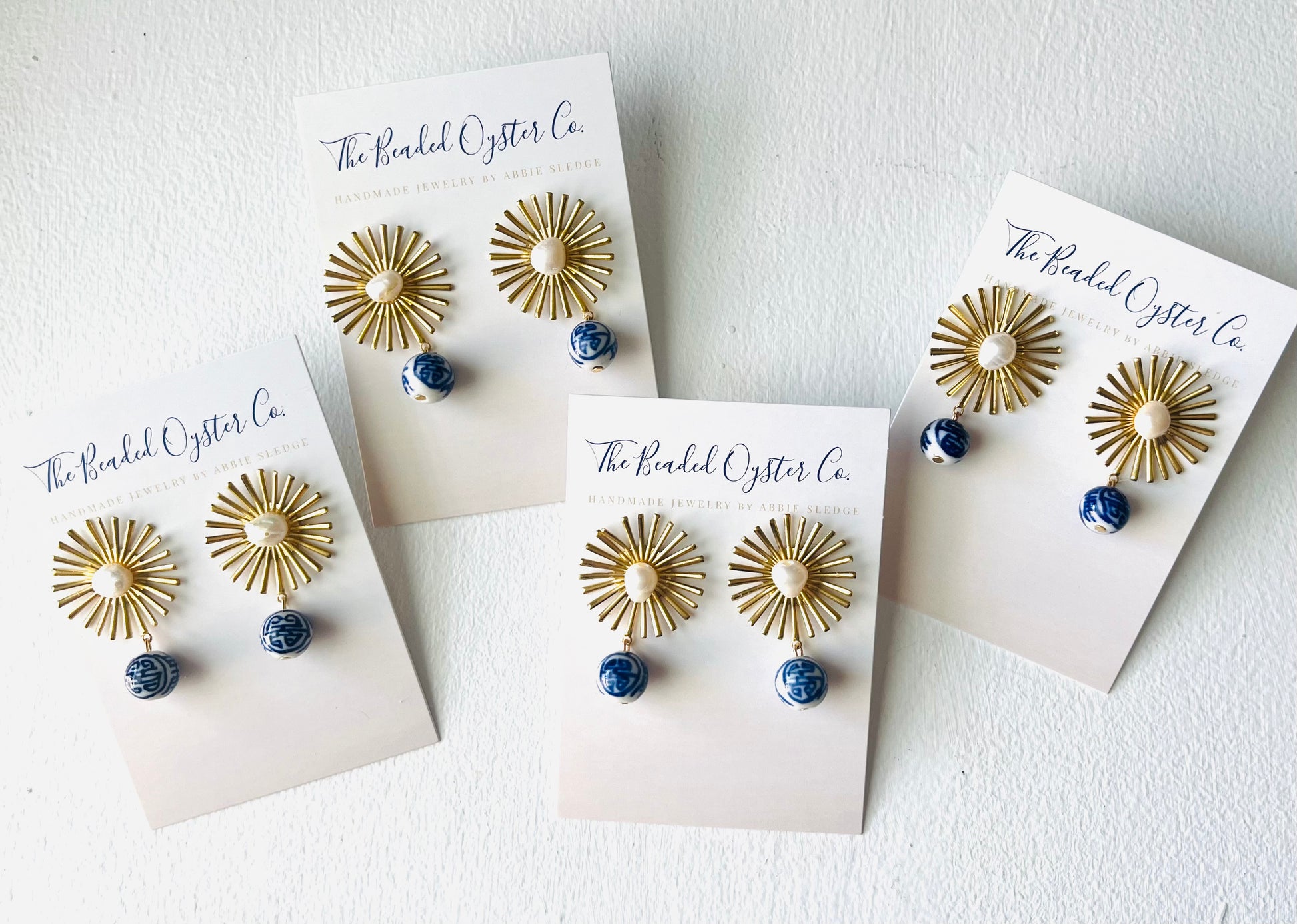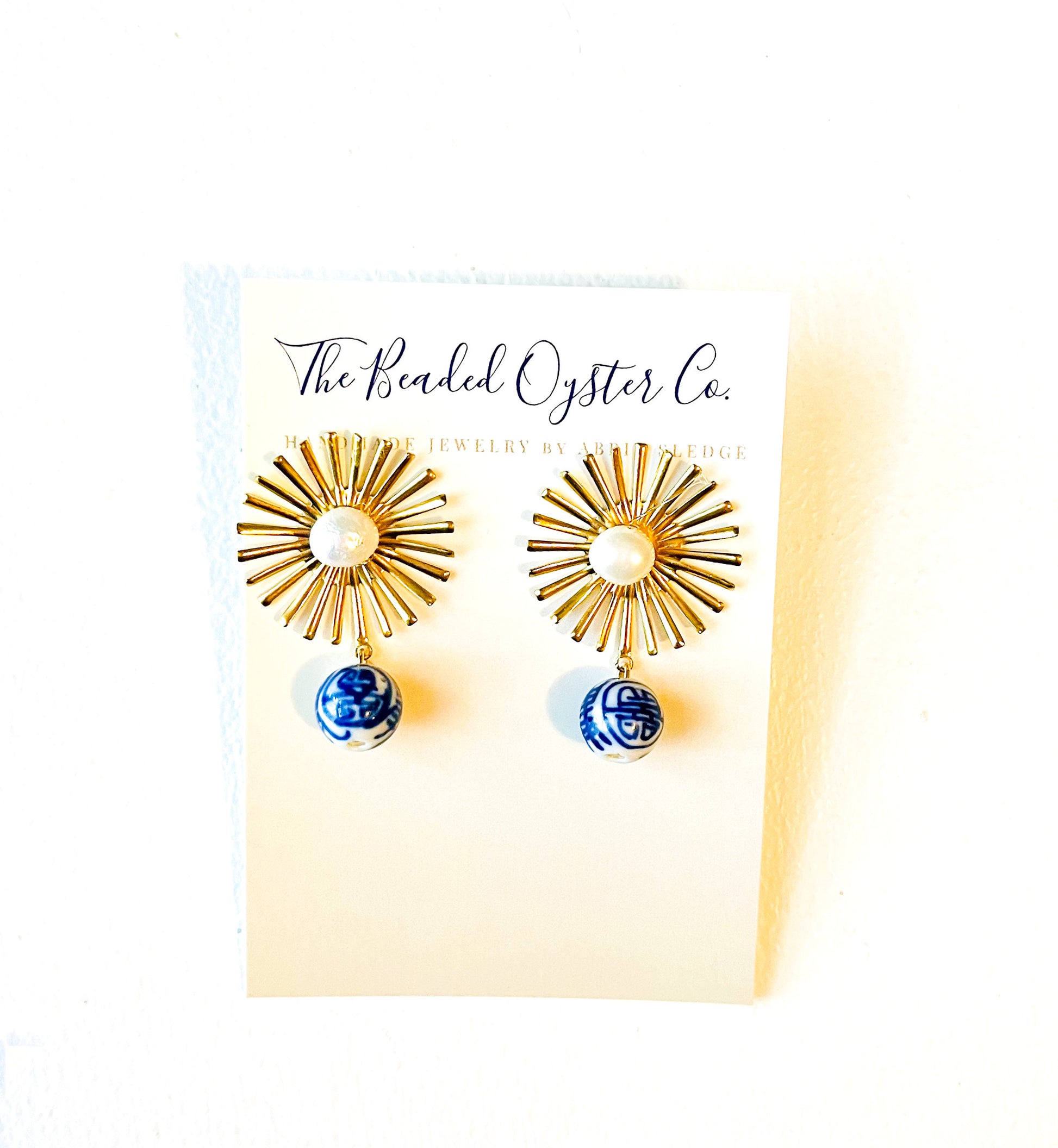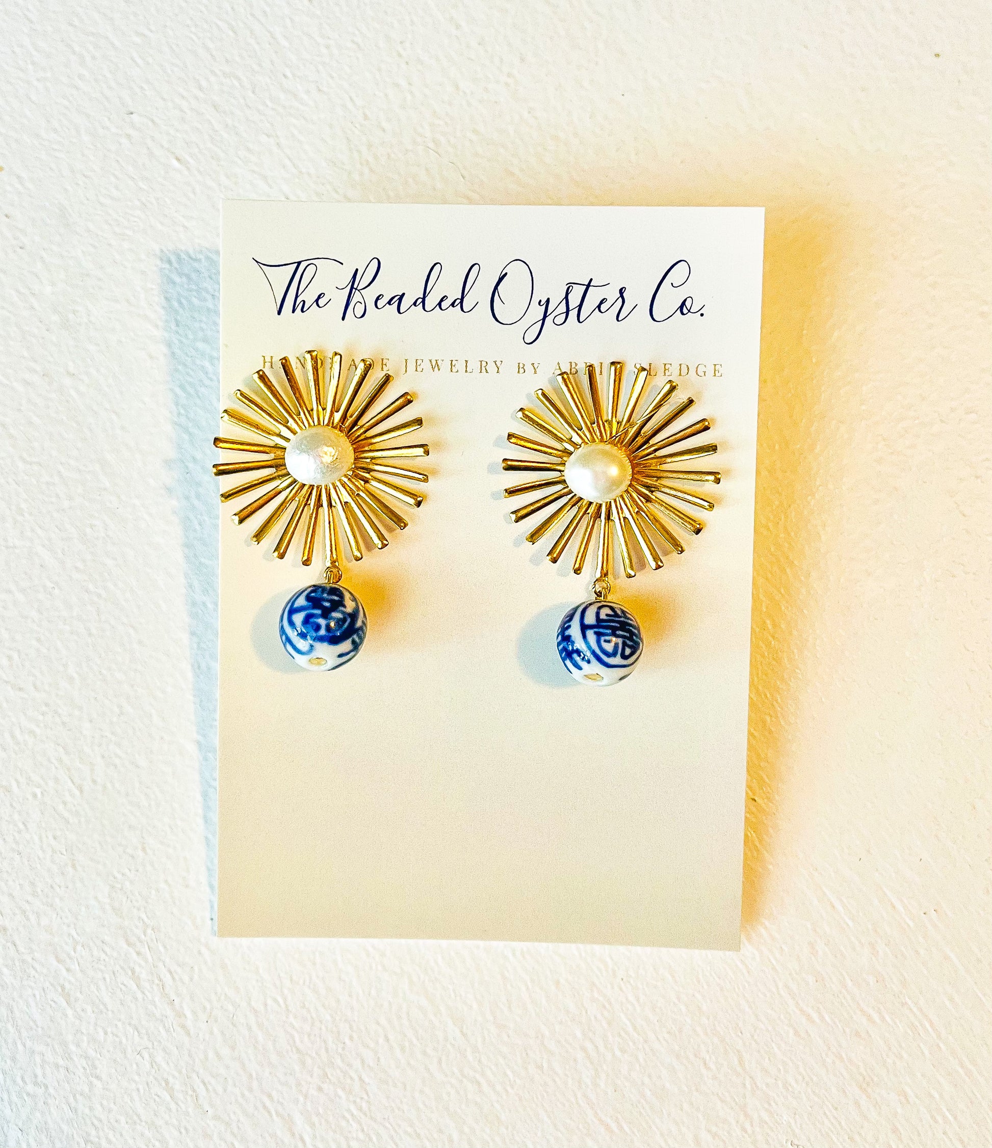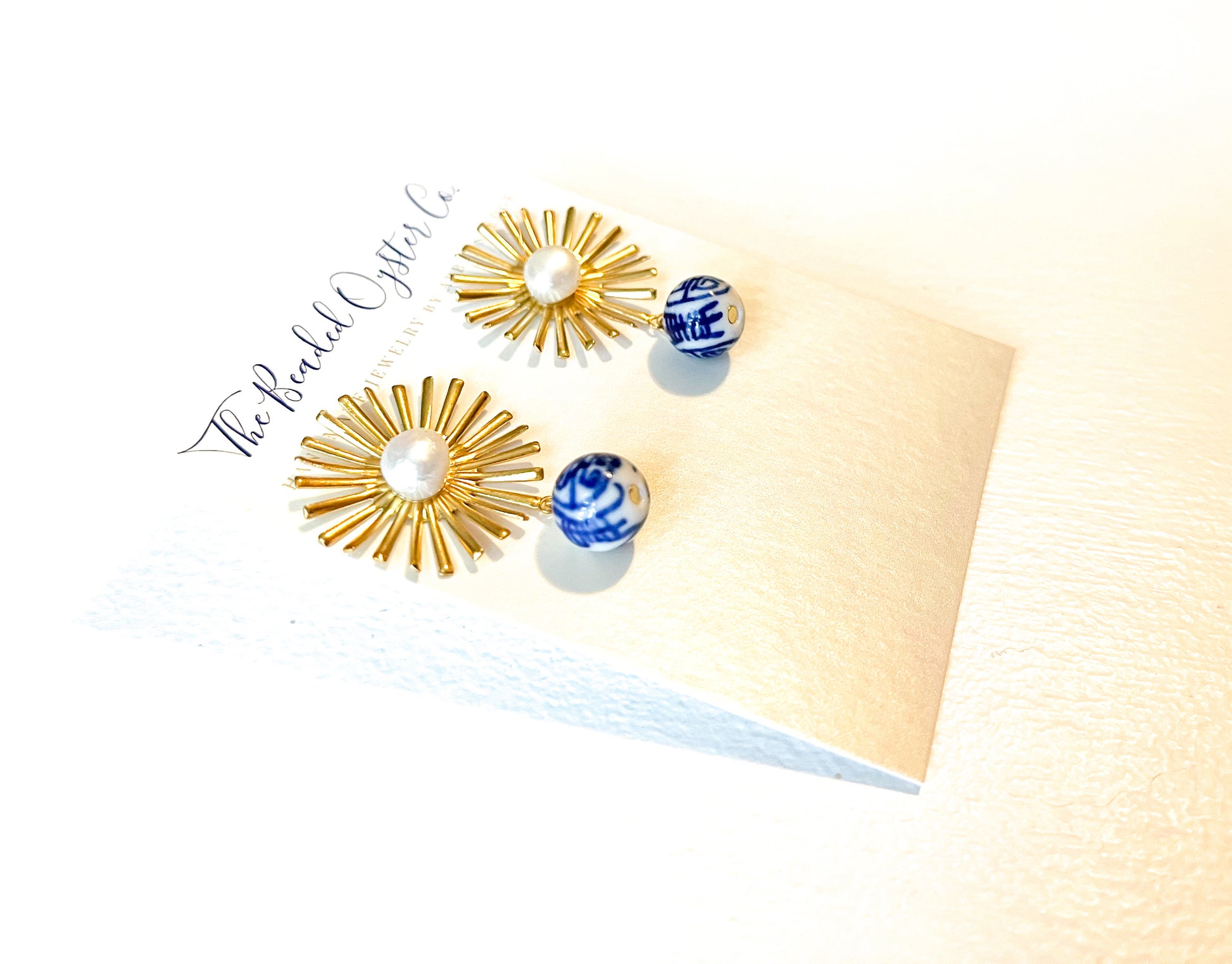 These earrings are made with a 25mm raw brass sun shape earring pendant, a small freshwater nugget pearl, and 10mm blue and white chinoiserie bead. The earrings measure about 1.5 inches long.