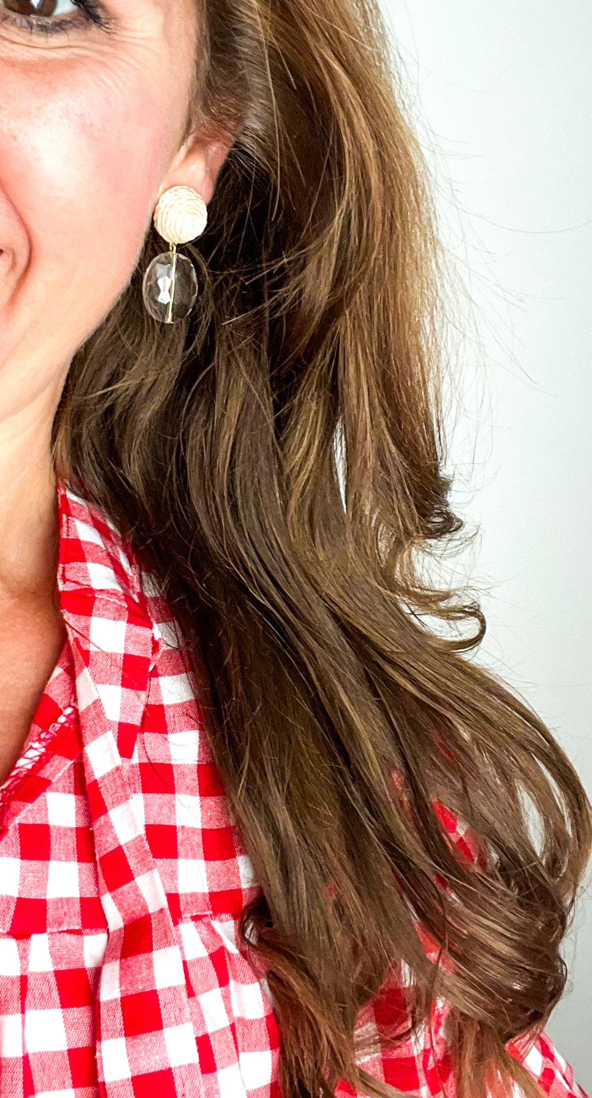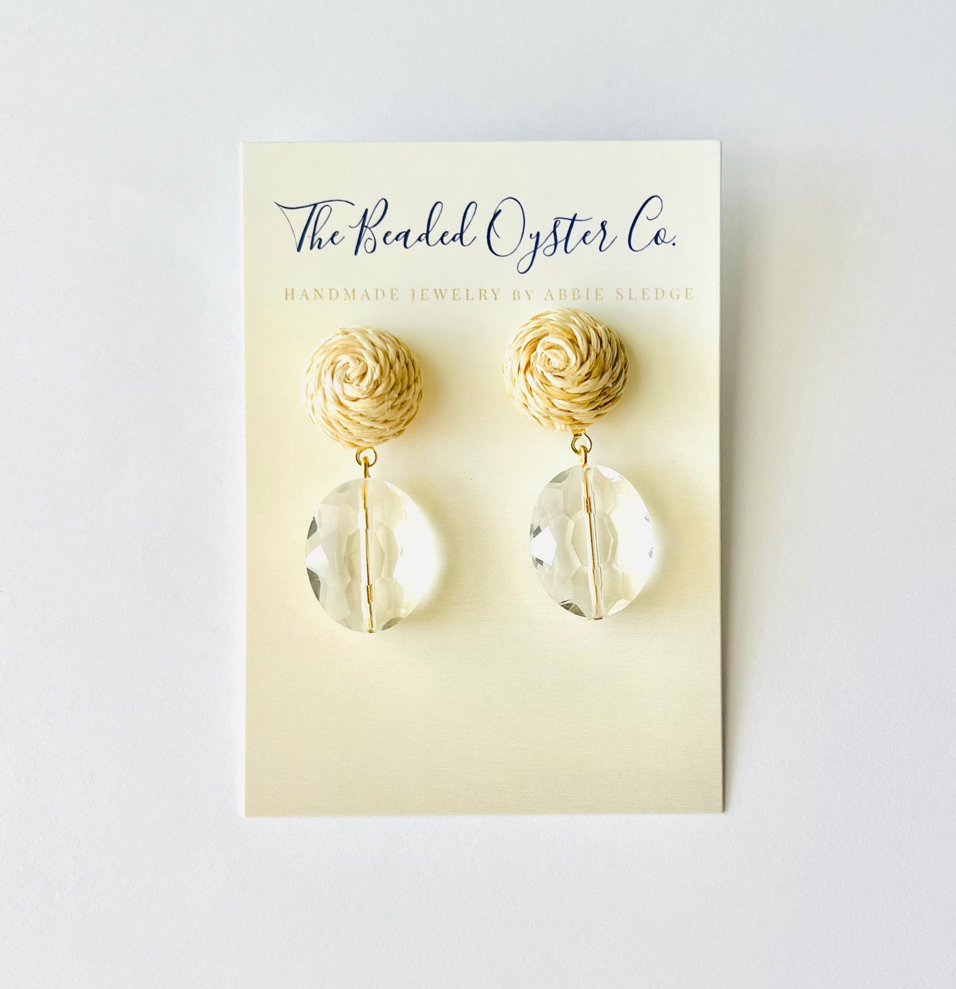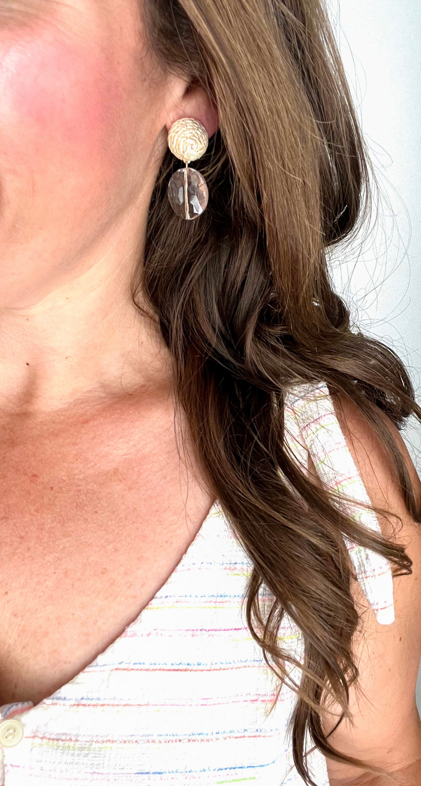 The Everlee earrings are made with a raised rattan earring post and a clear faceted crystal bead.