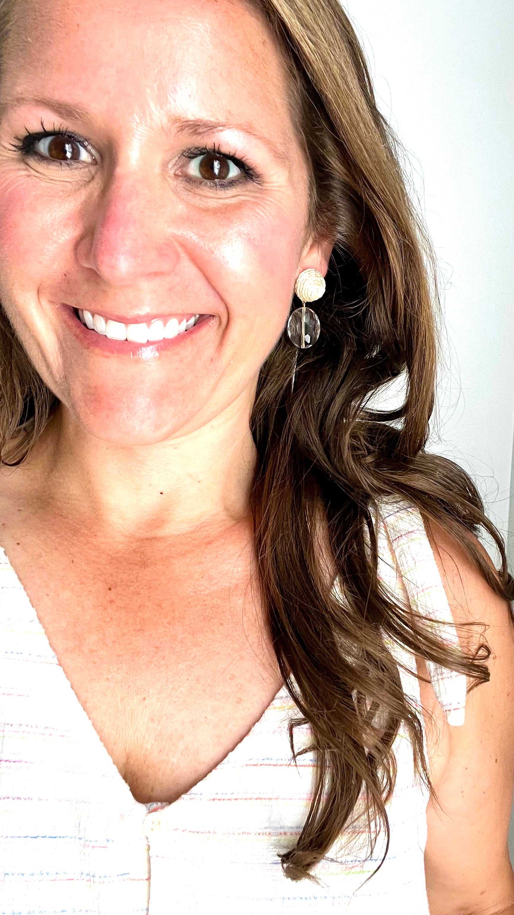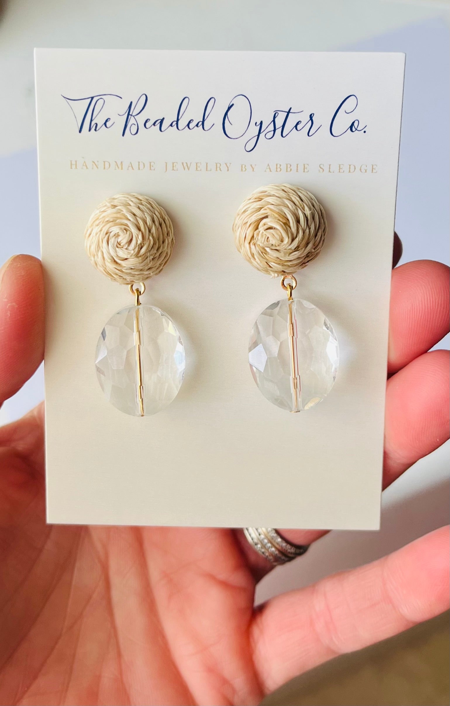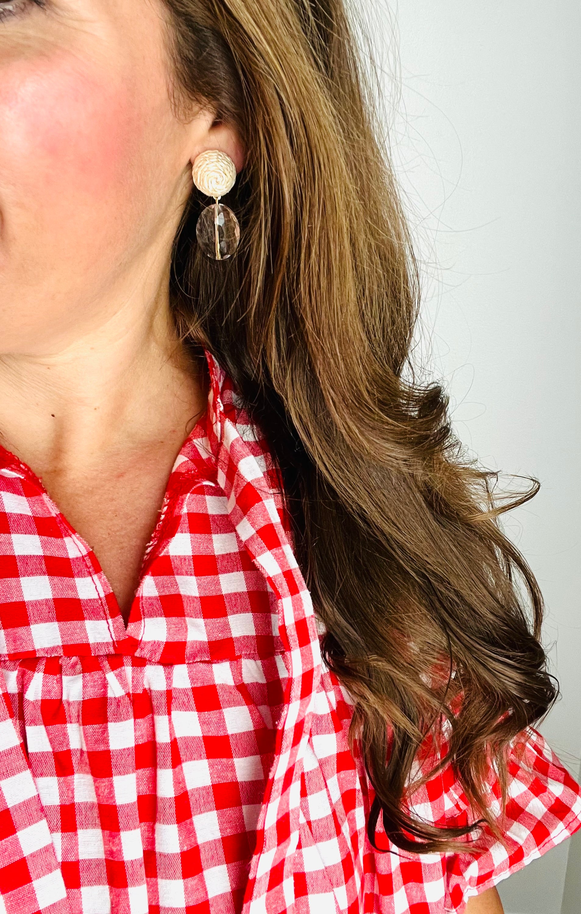 The Everlee earrings are made with a raised rattan earring post and a clear faceted crystal bead.
