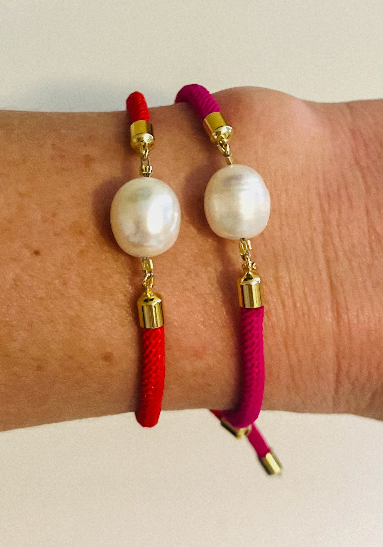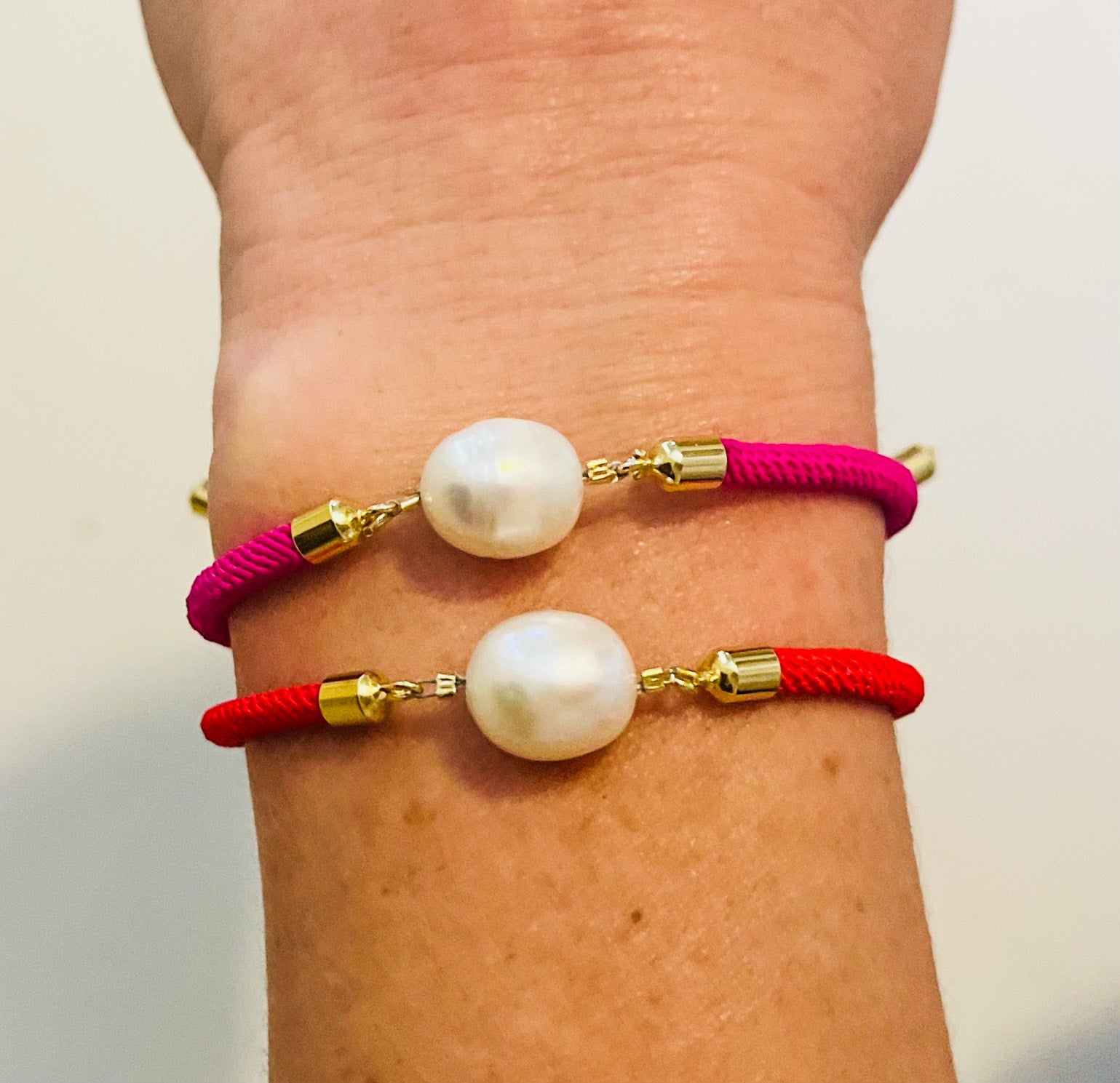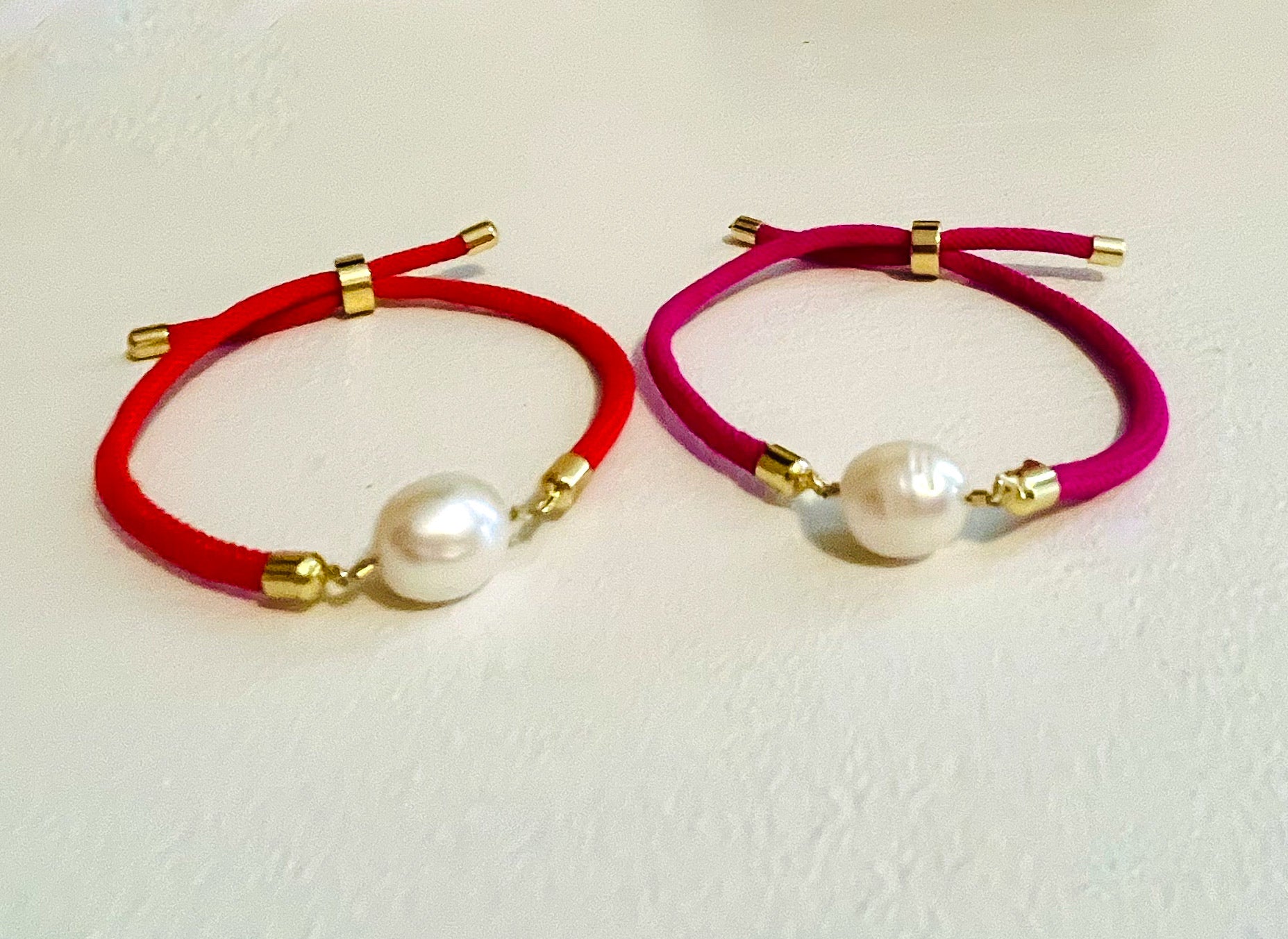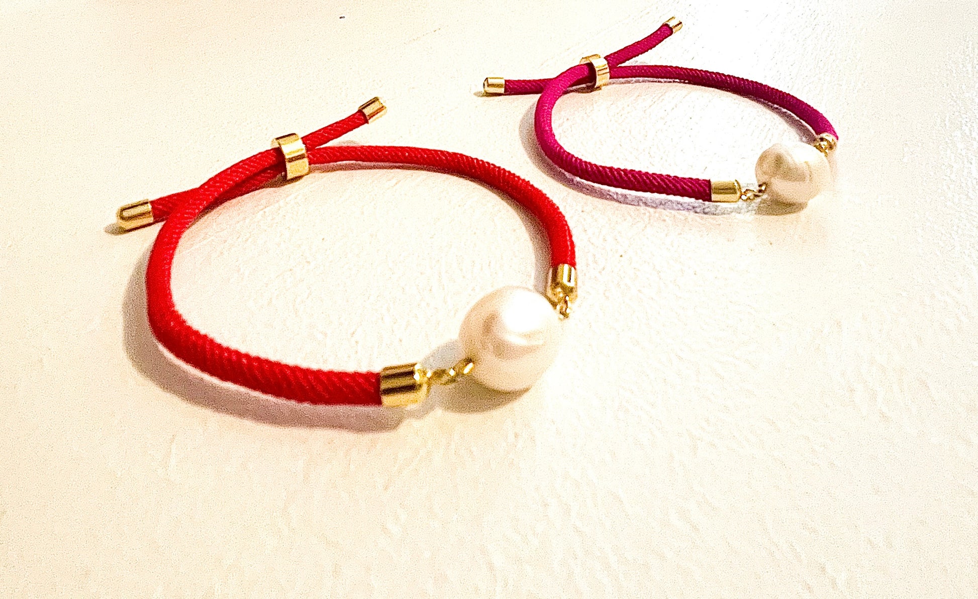 The Faye bracelets are made with a nylon adjustable cord bracelet in pink and red and a freshwater pearl.