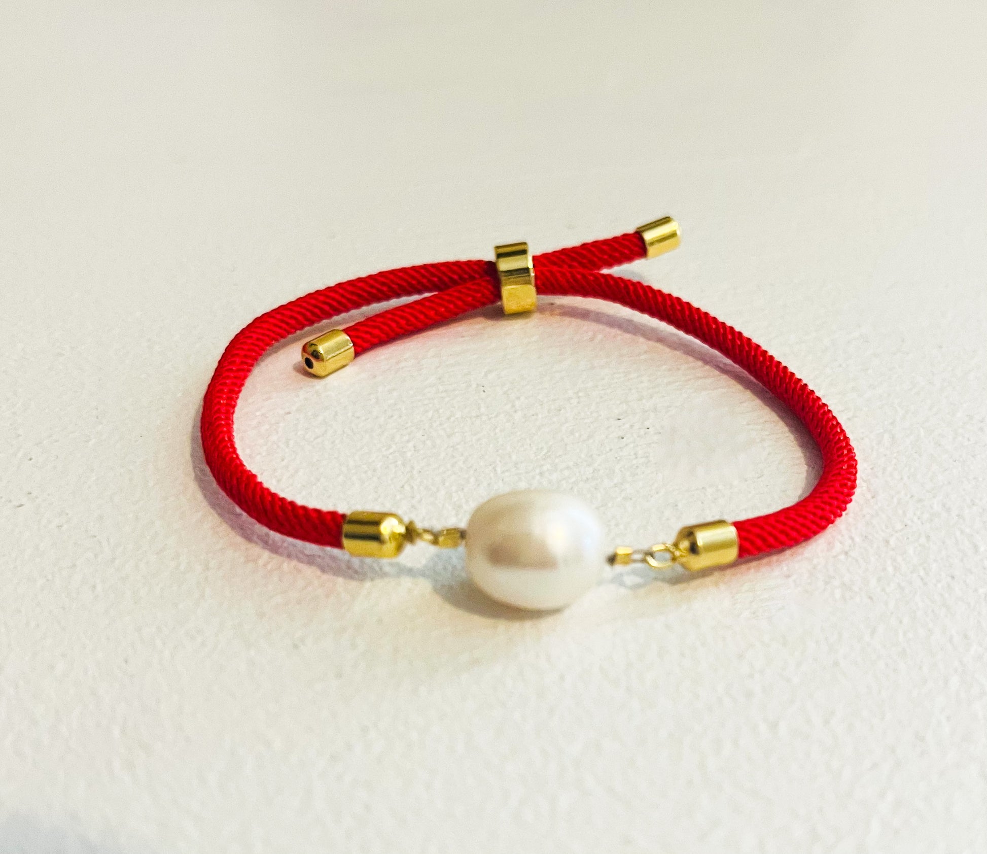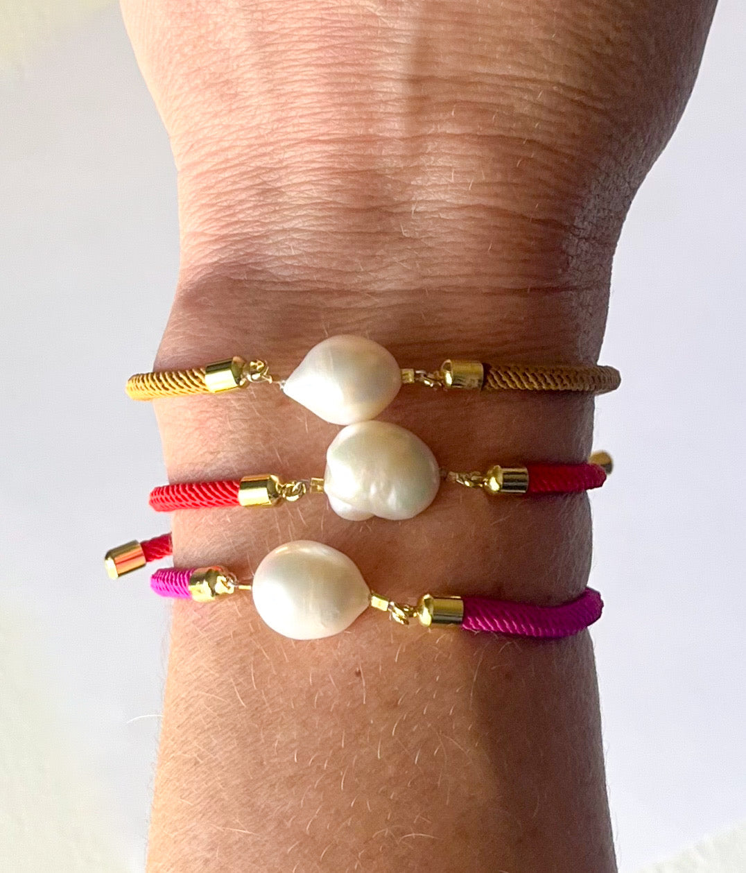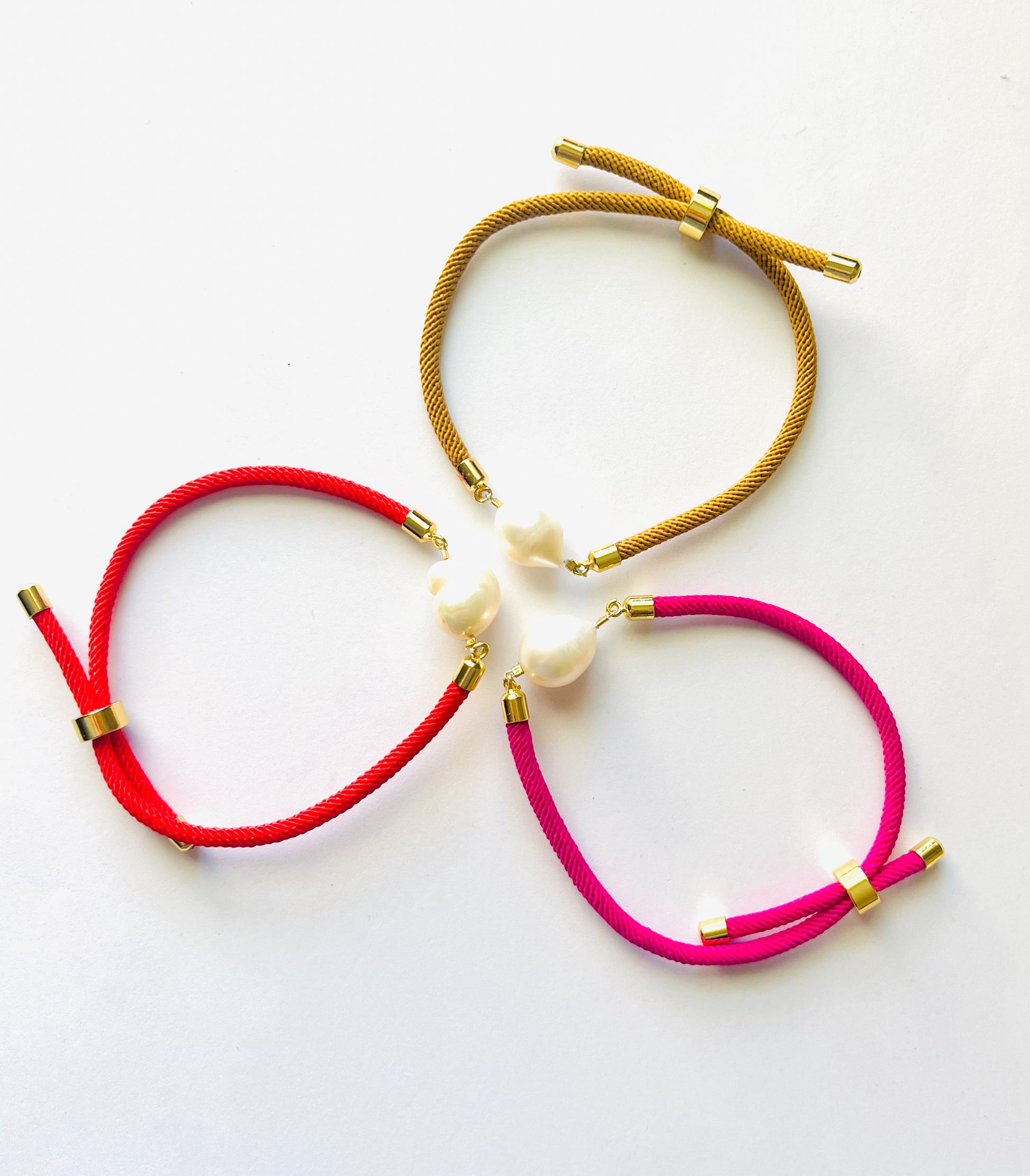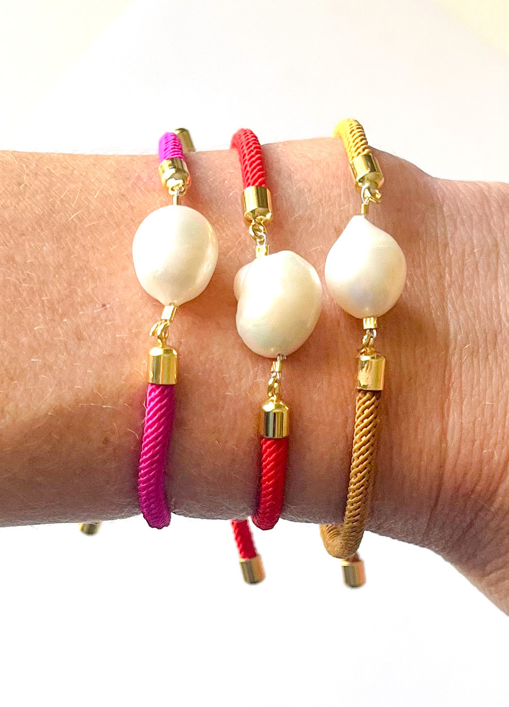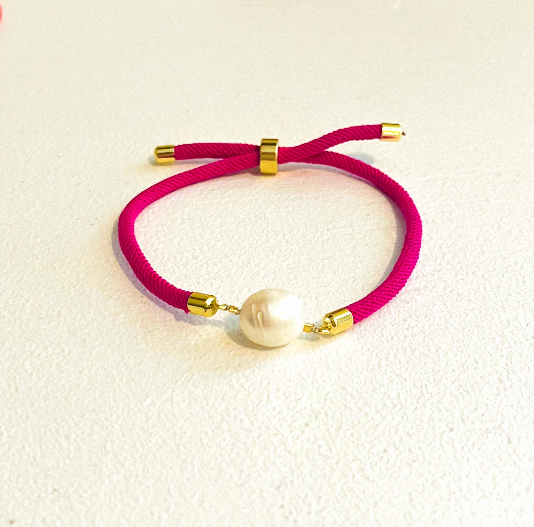 The Faye bracelets are made with a nylon adjustable cord bracelet in pink and red and a freshwater pearl.