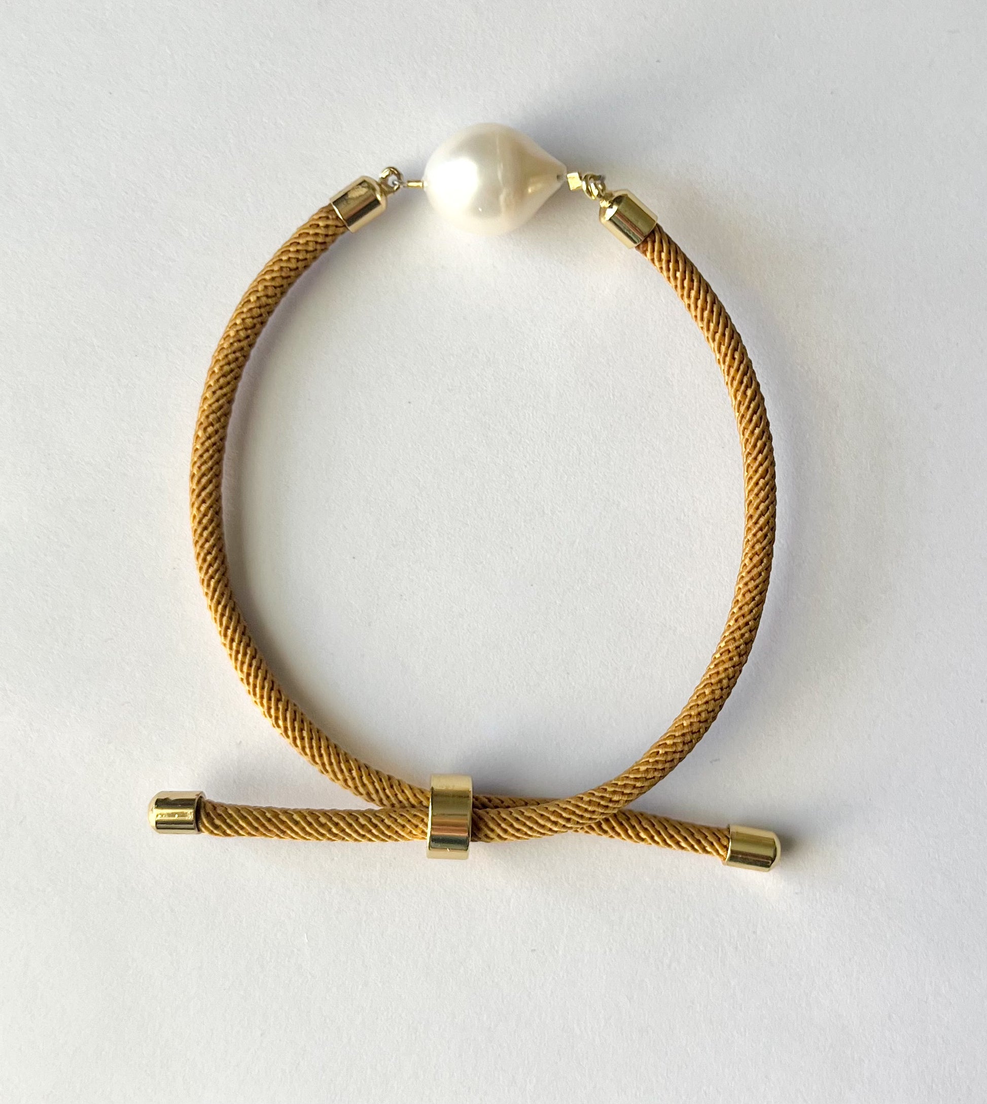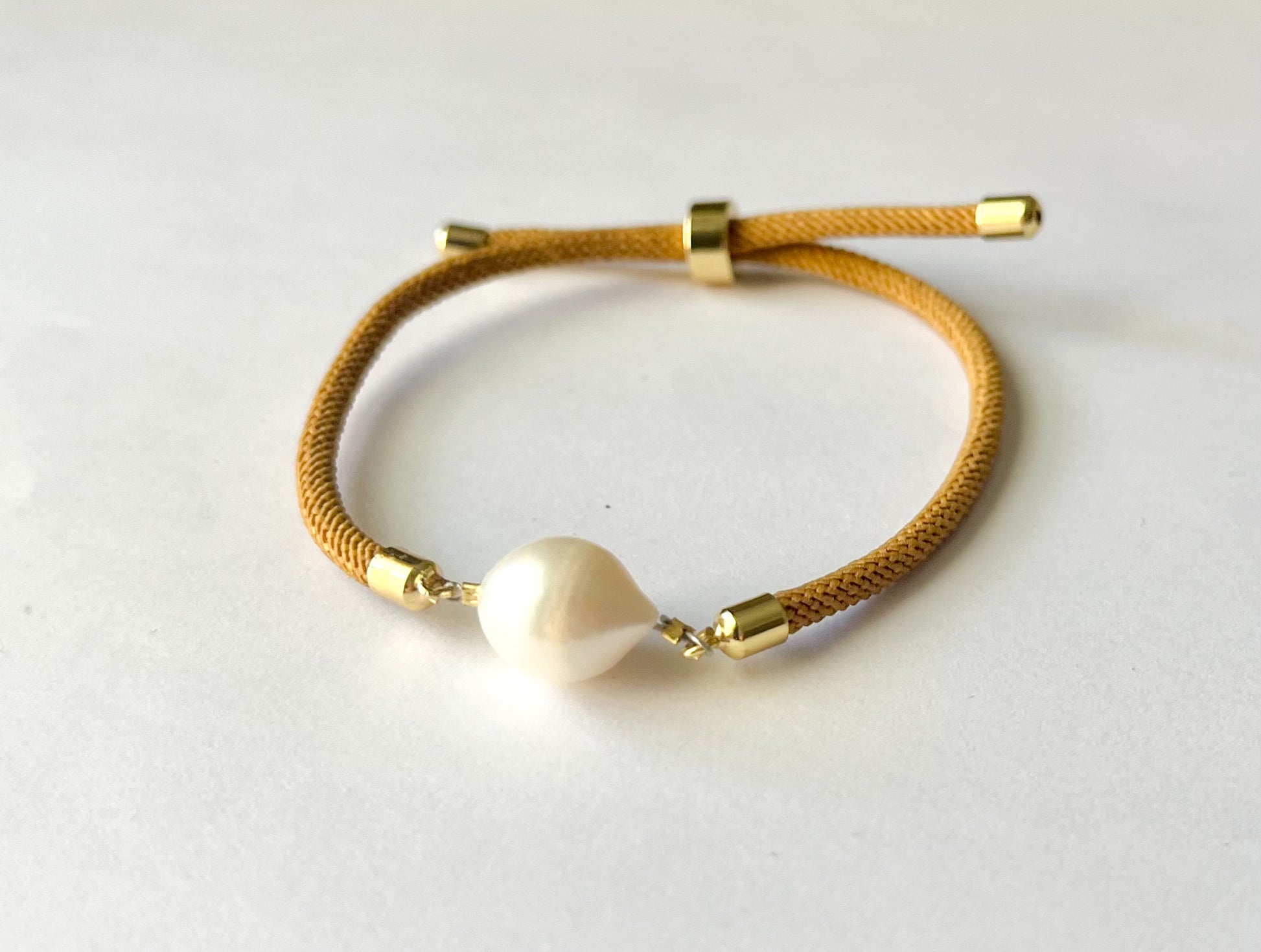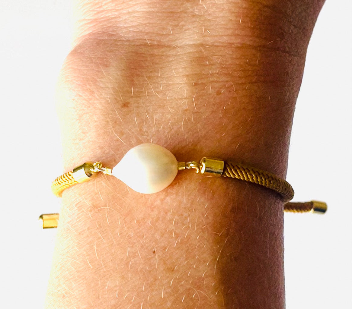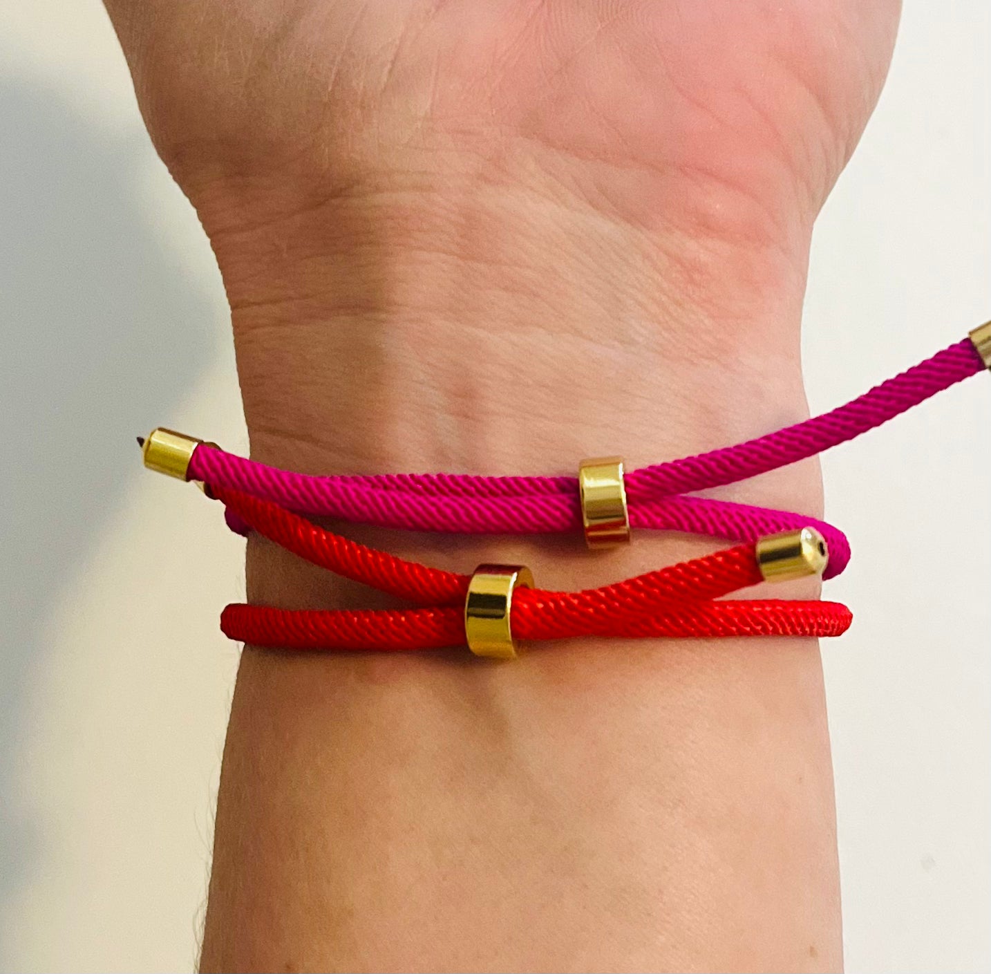The Faye bracelets are made with a nylon adjustable cord bracelet in pink and red and a freshwater pearl.