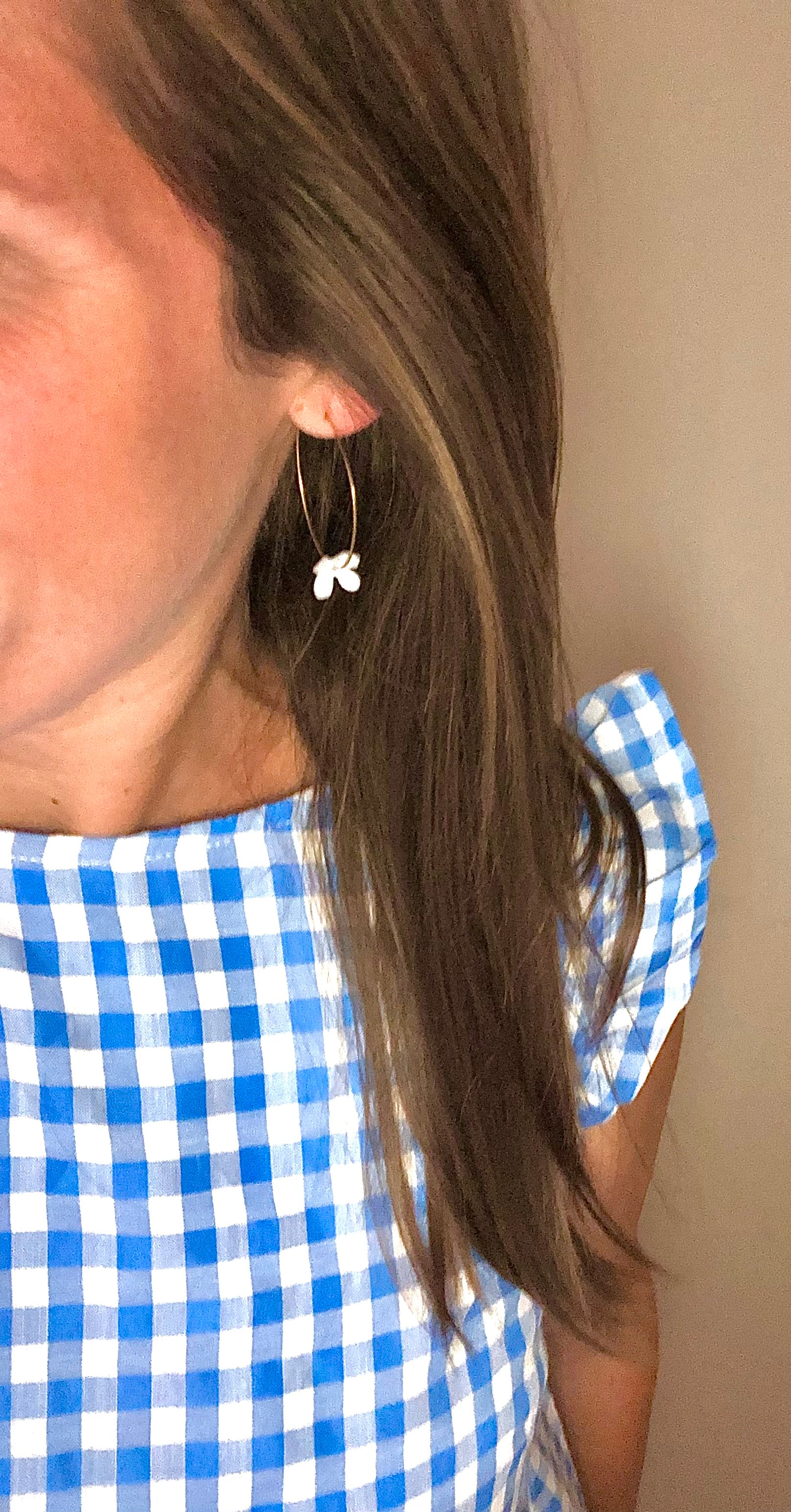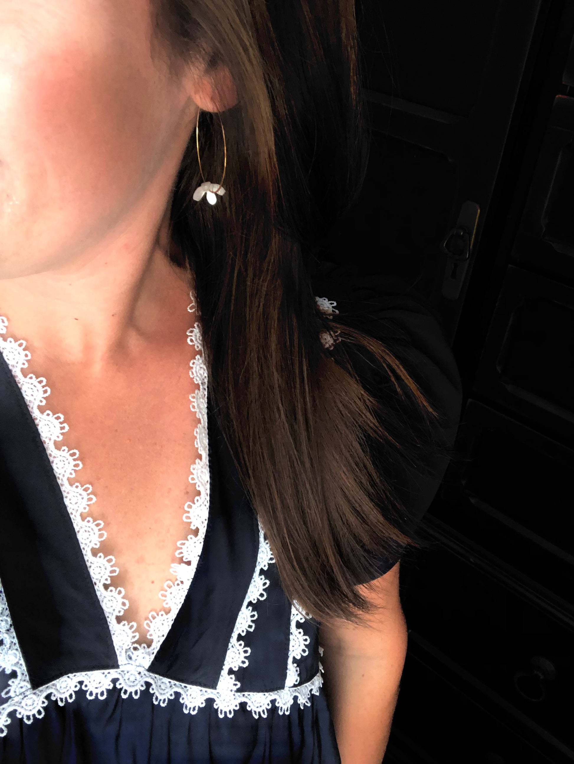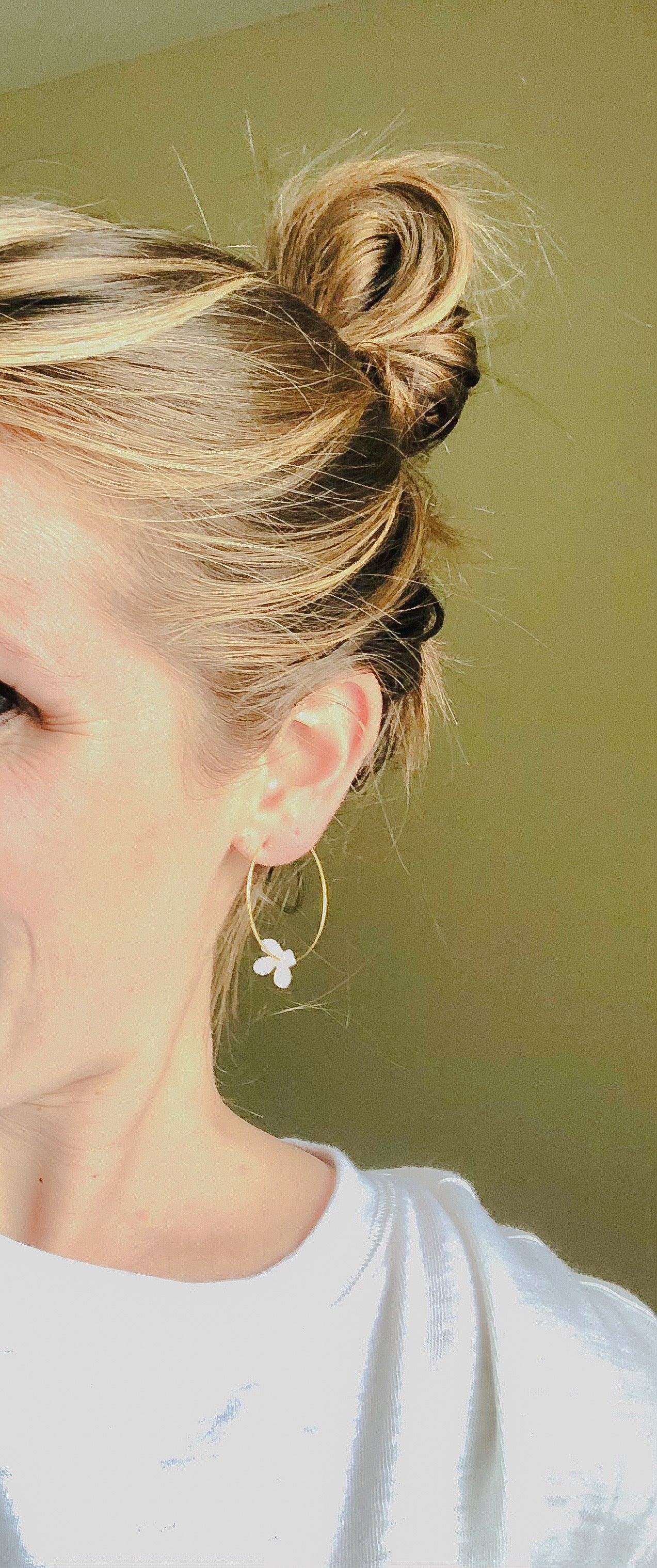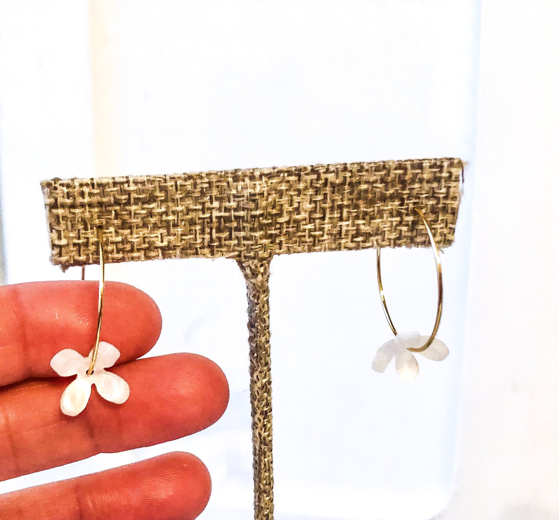 These earrings are made with a 25mm stainless steel golden hoop and a 13mm white resin flower. The earrings measure just over an inch long and about an inch and a half wide.