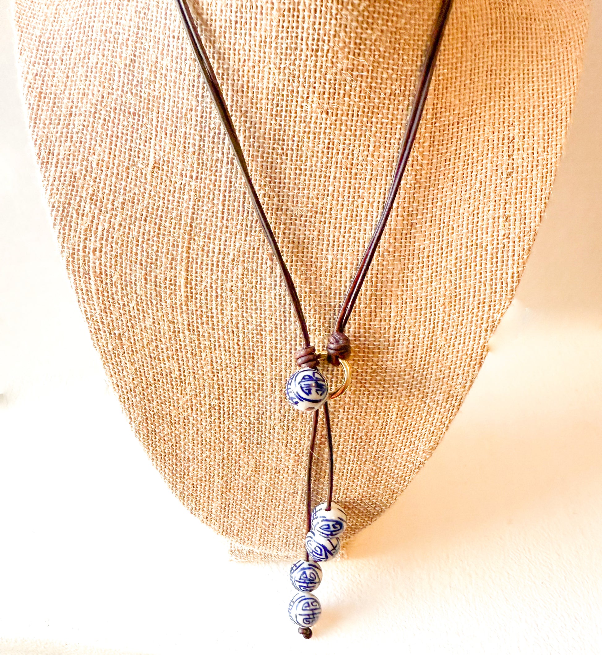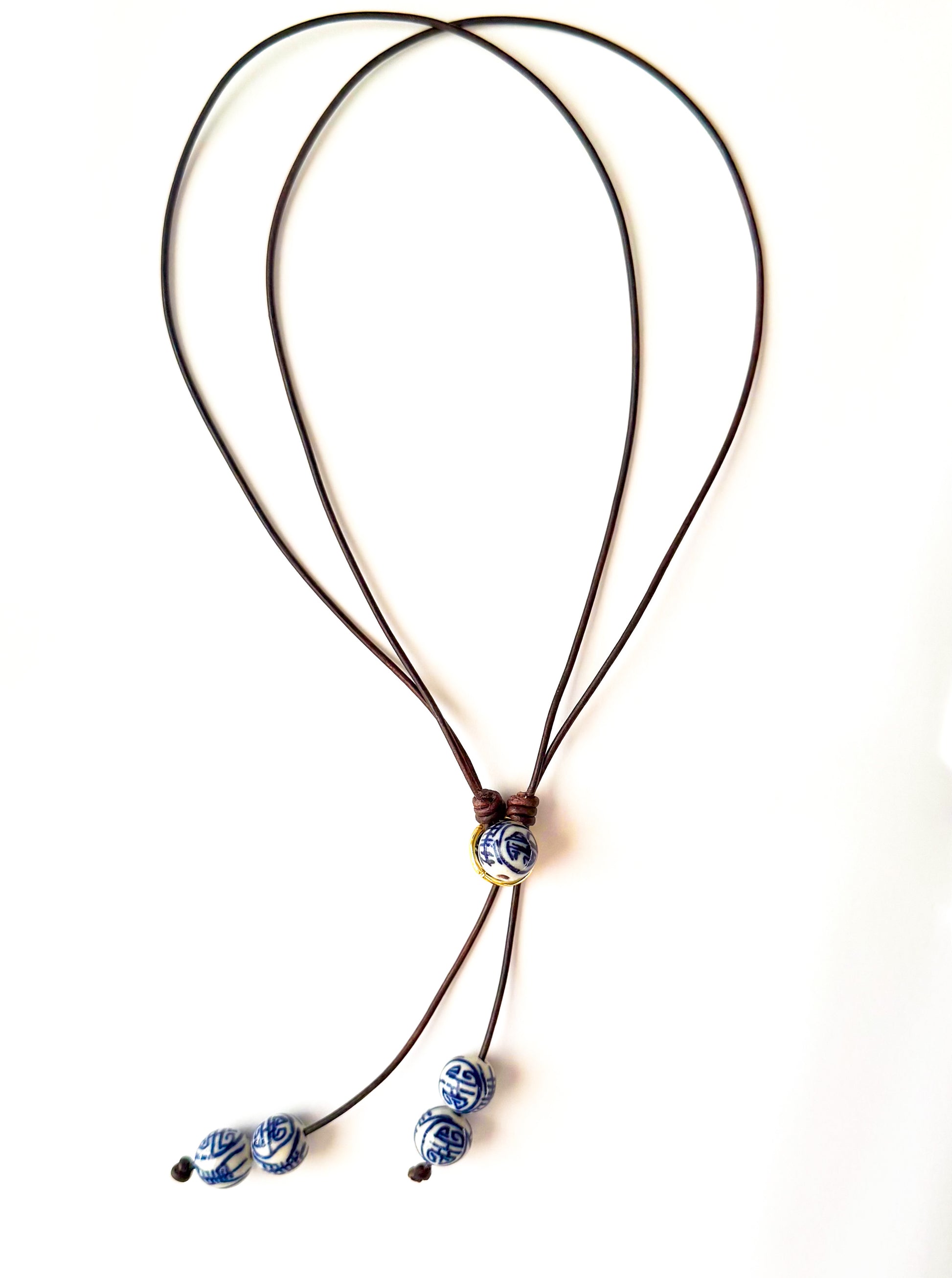 The Kathleen Necklace is made with a dark brown leather cord, 12mm blue and white chinoiserie beads, and a gold plated charm clasp. The necklace measures about 20 1/2 inches long.