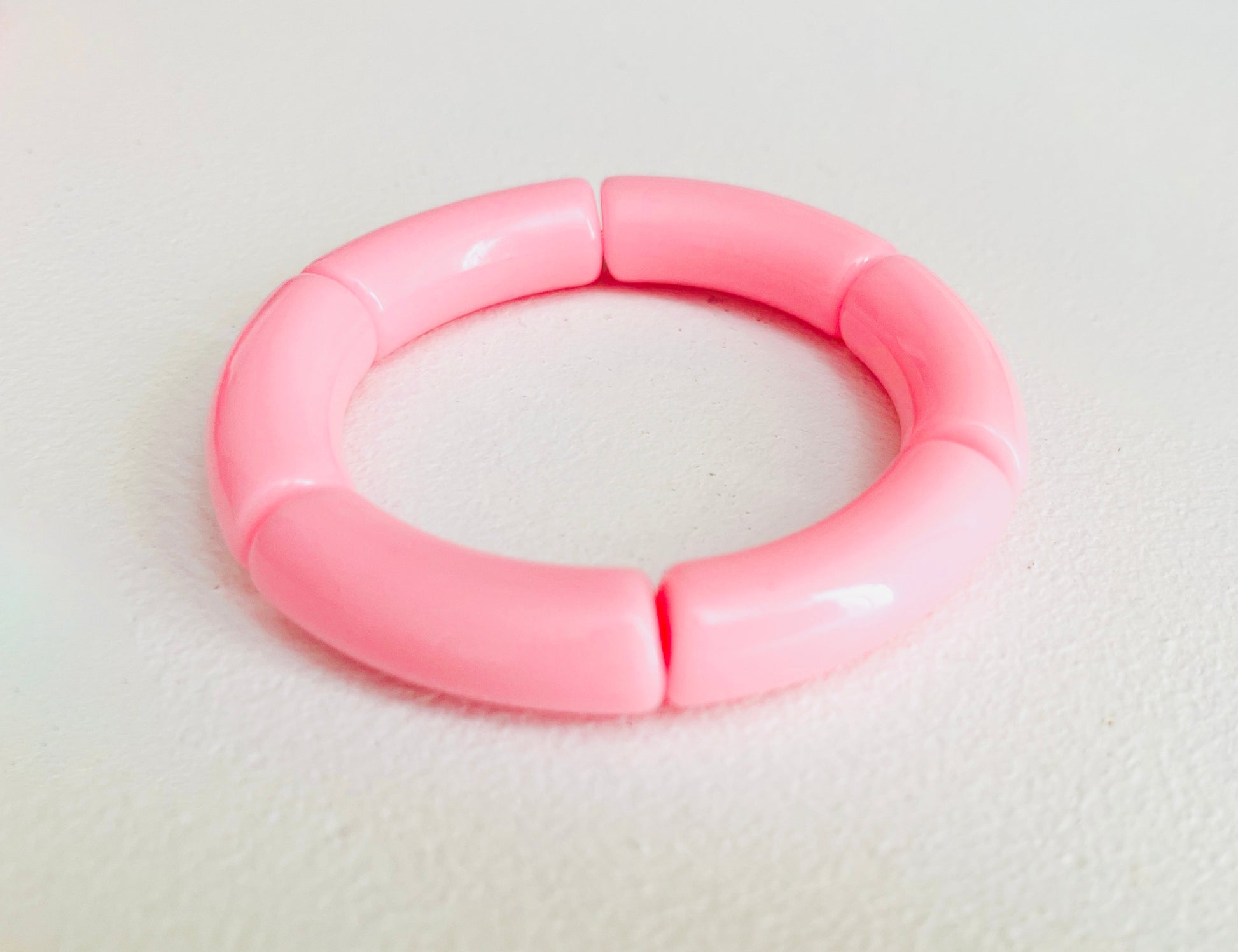 The Nola bracelet is made with an bubblegum pink acrylic curved tube bead.