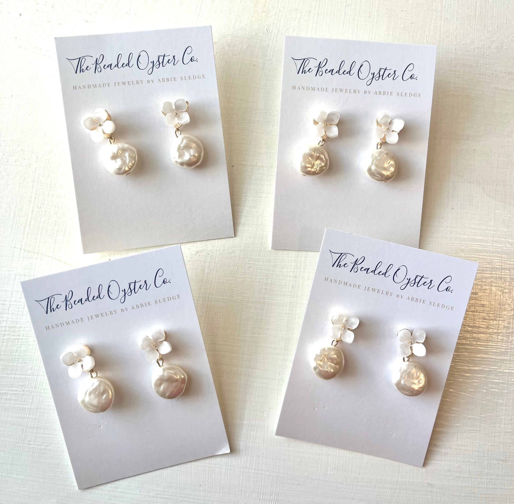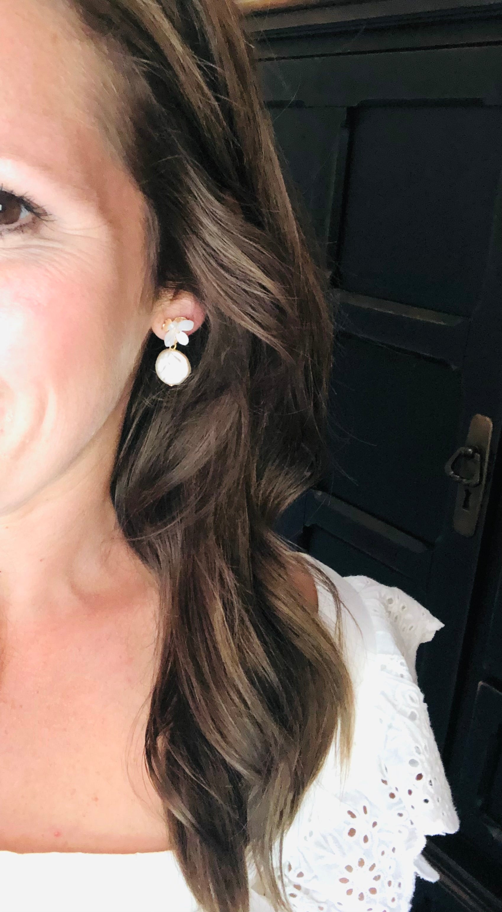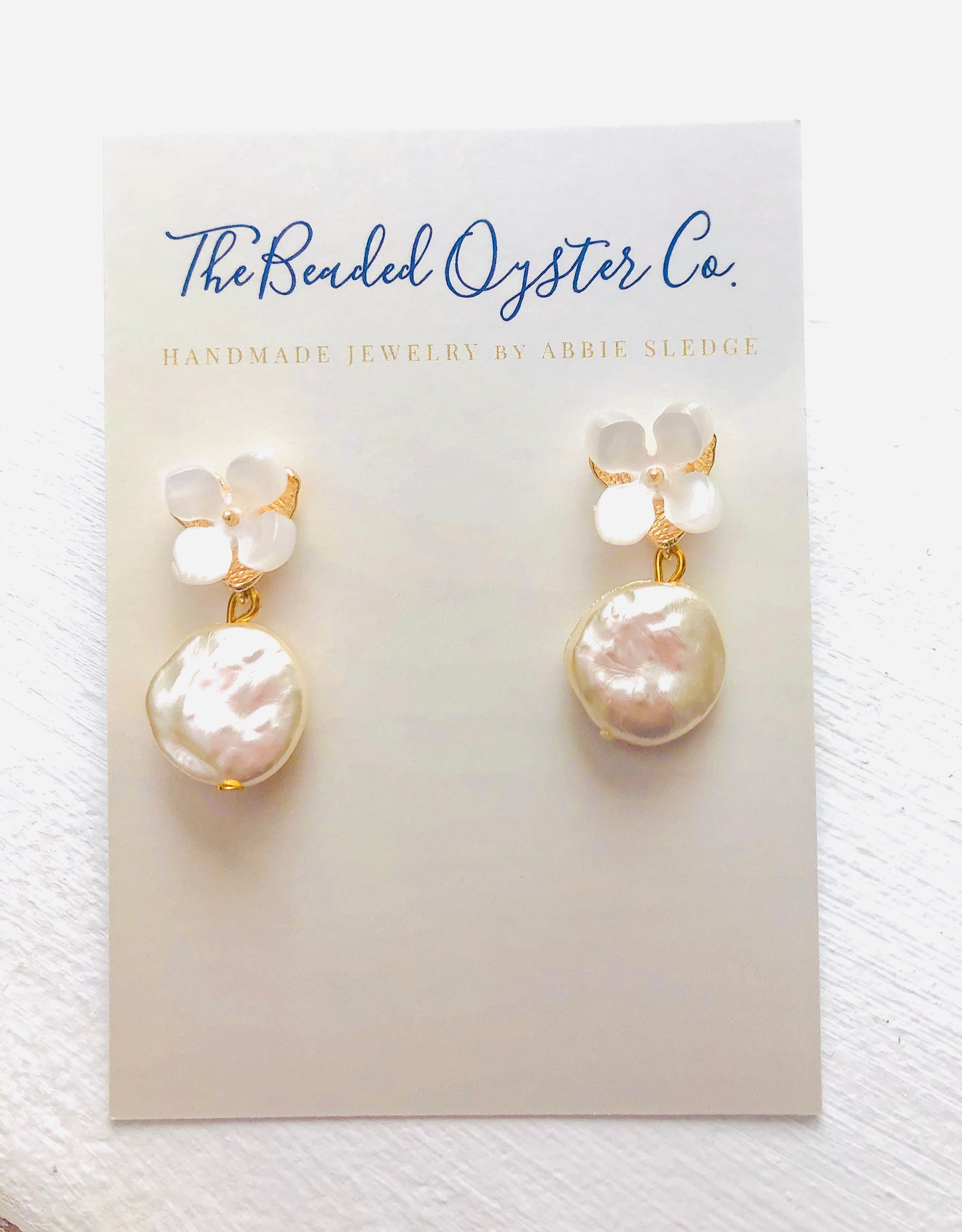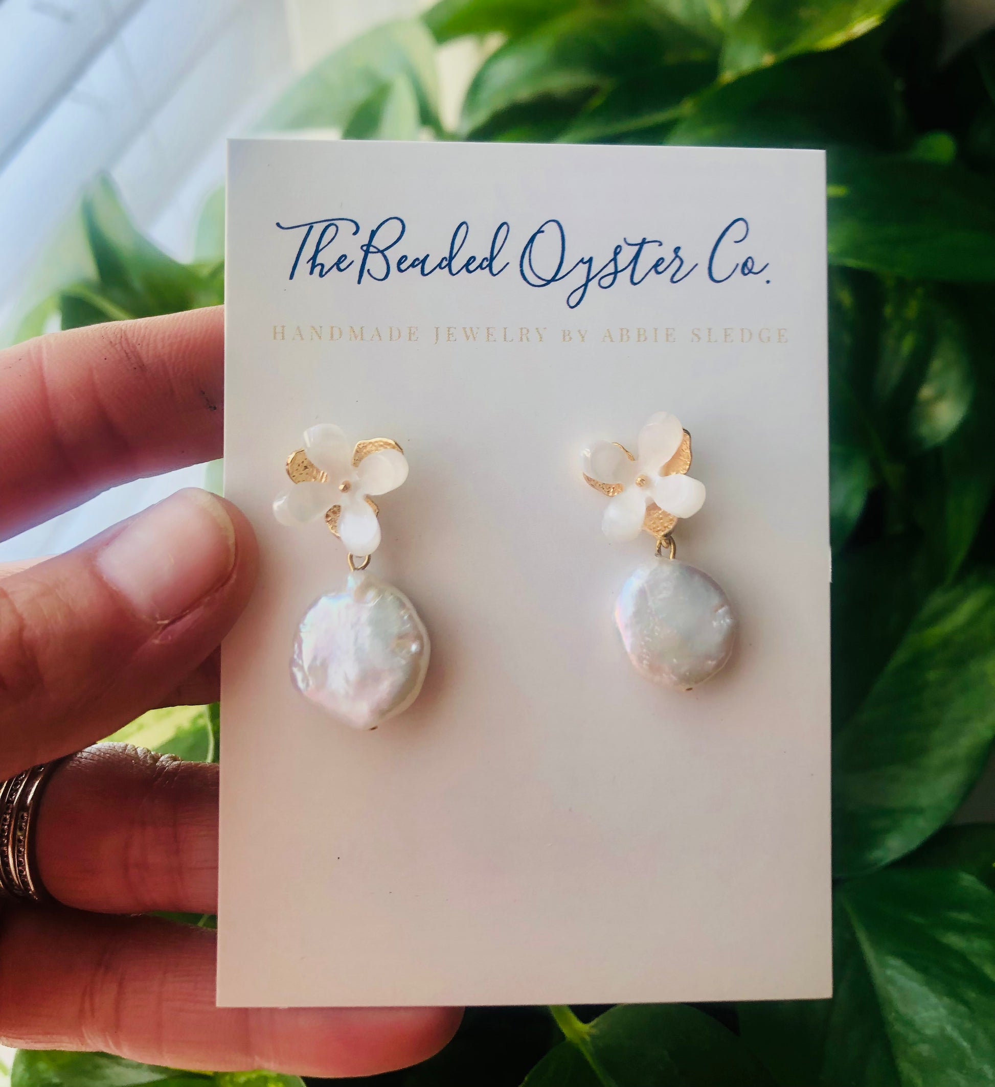 These earrings are made with a 12mm gold plated flower earring post with a white resin flower that rest on top. Connected to the flower post is 14mm flat, round pearl. Each pearl bead may vary in size, shape and/or color. The earring measures about an inch long.