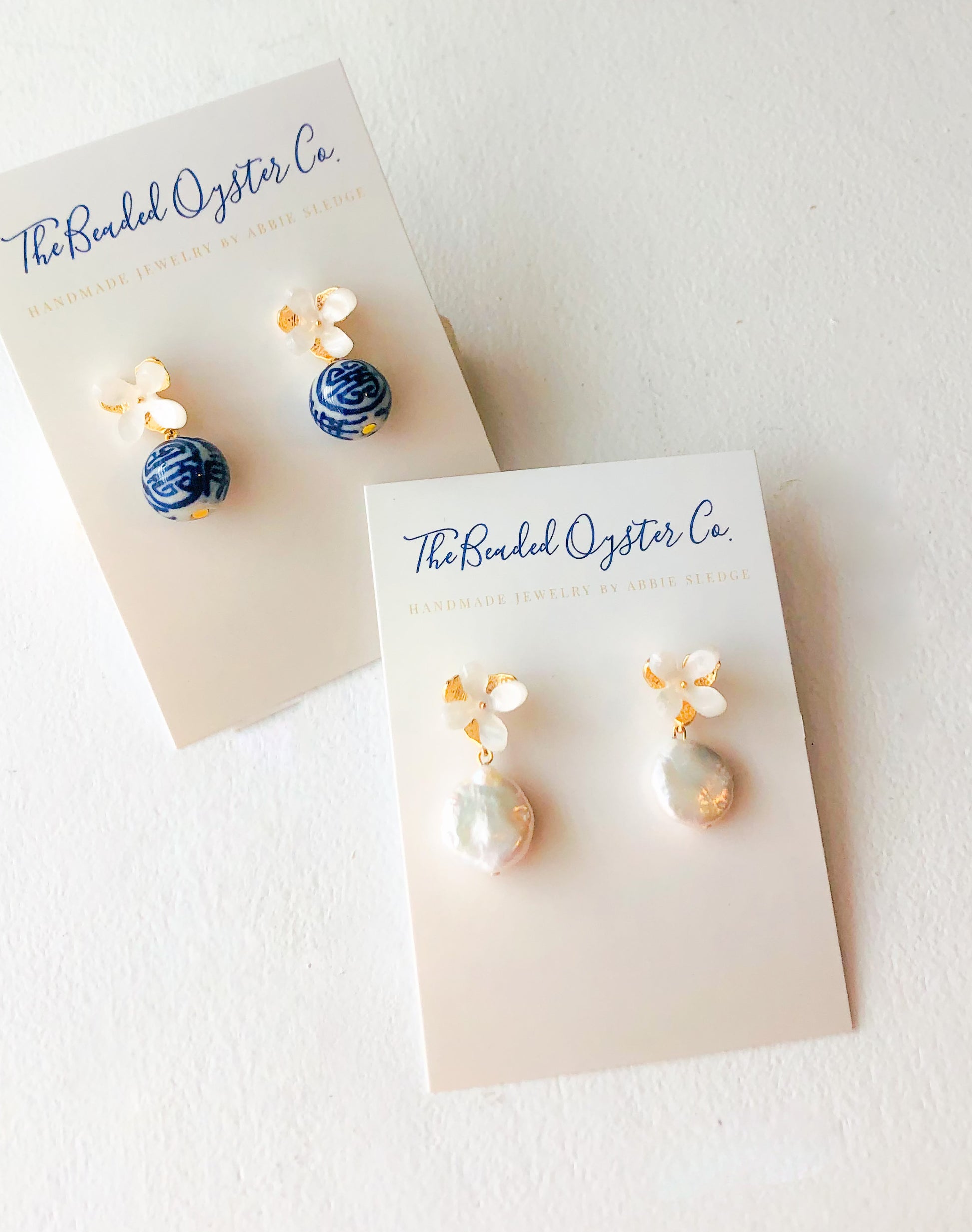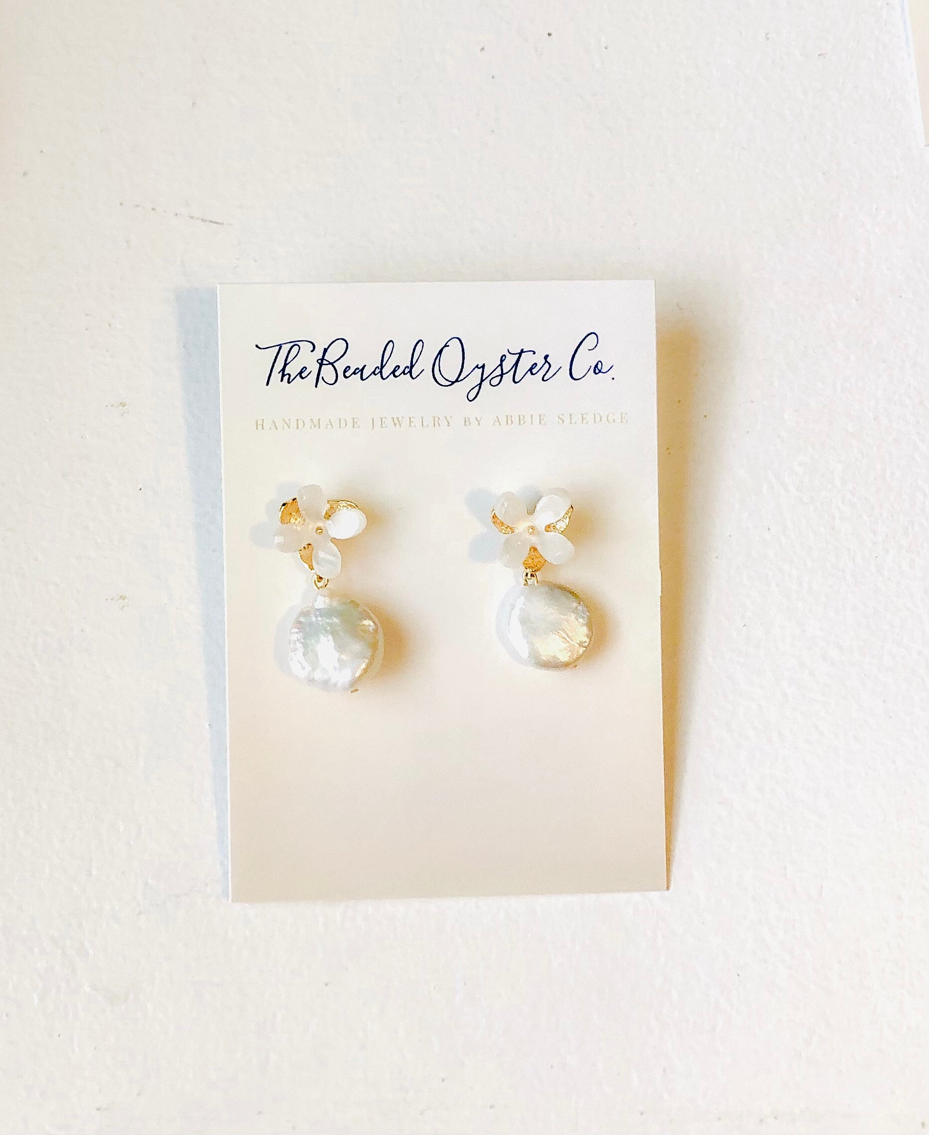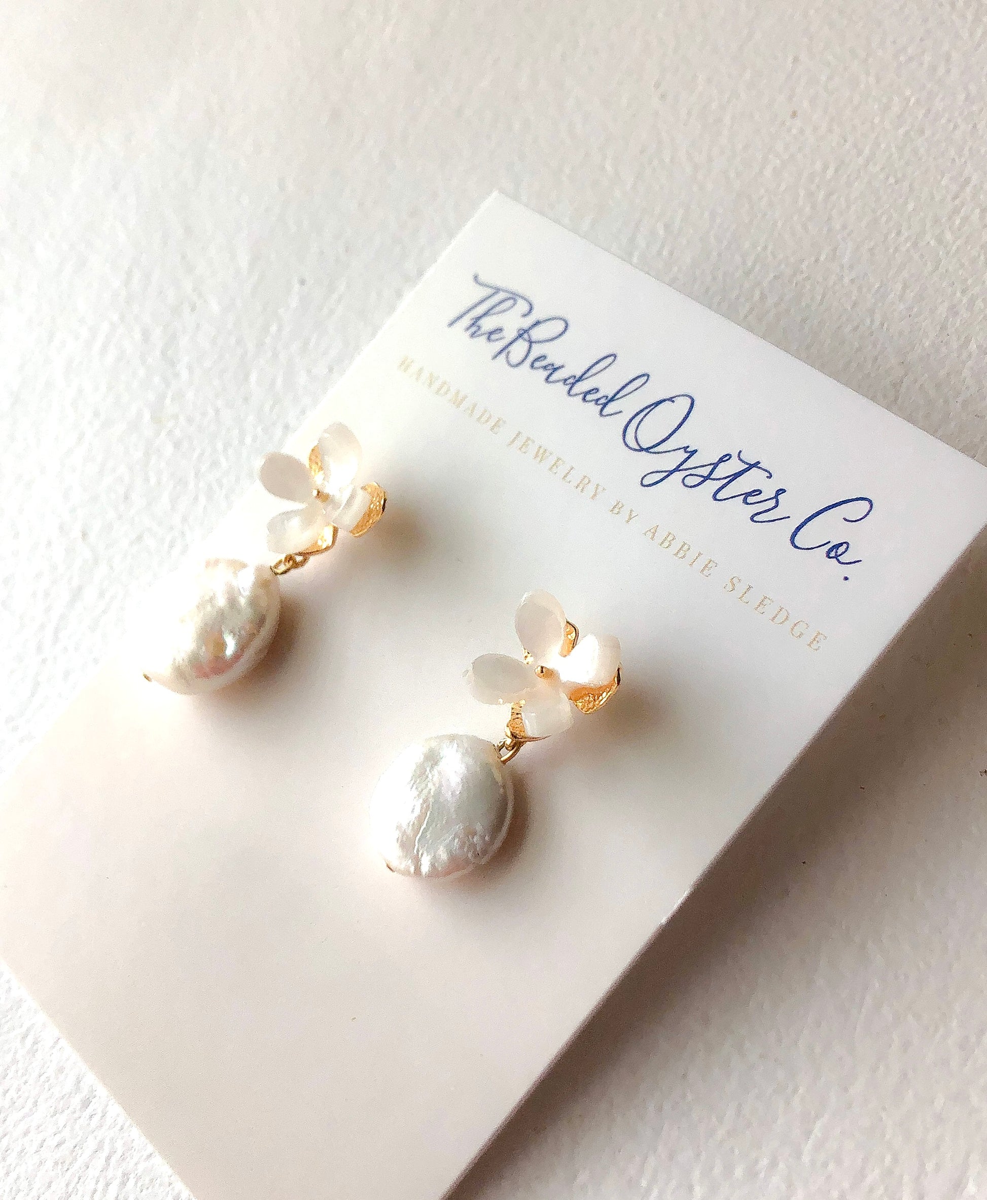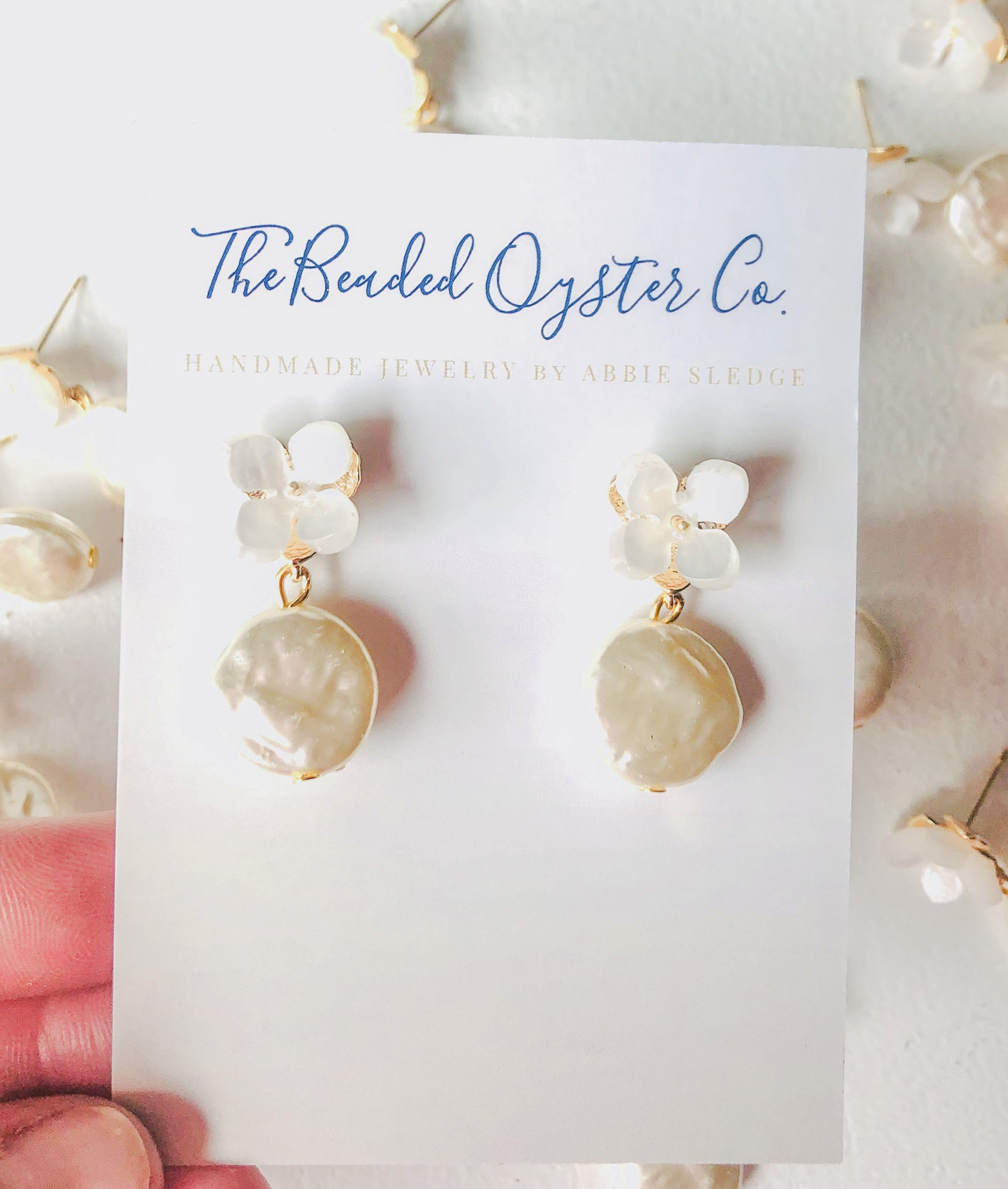 These earrings are made with a 12mm gold plated flower earring post with a white resin flower that rest on top. Connected to the flower post is 14mm flat, round pearl. Each pearl bead may vary in size, shape and/or color. The earring measures about an inch long.