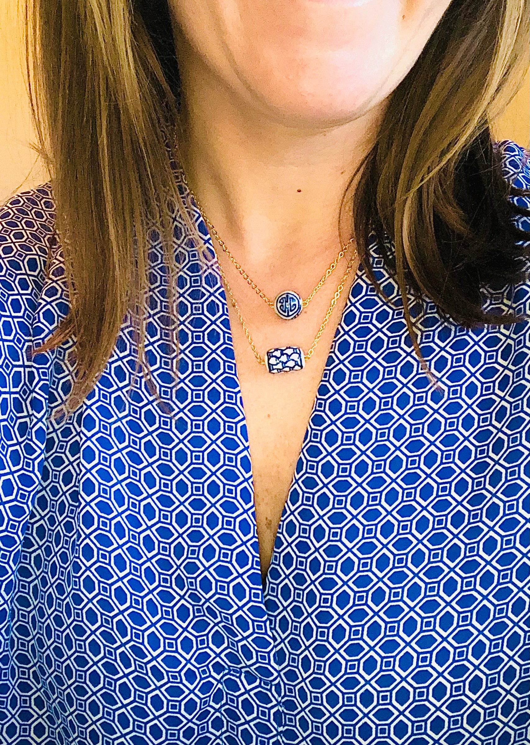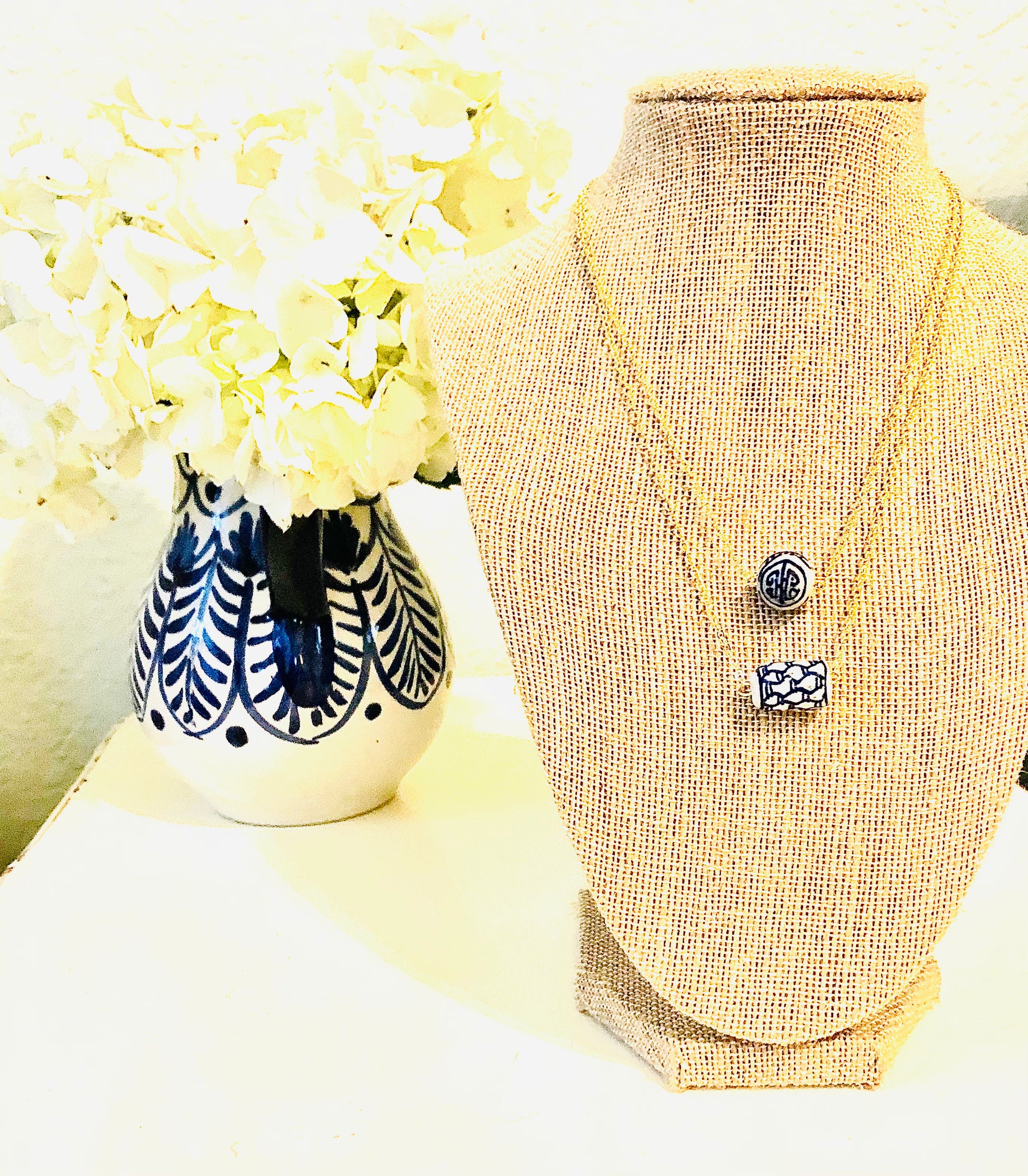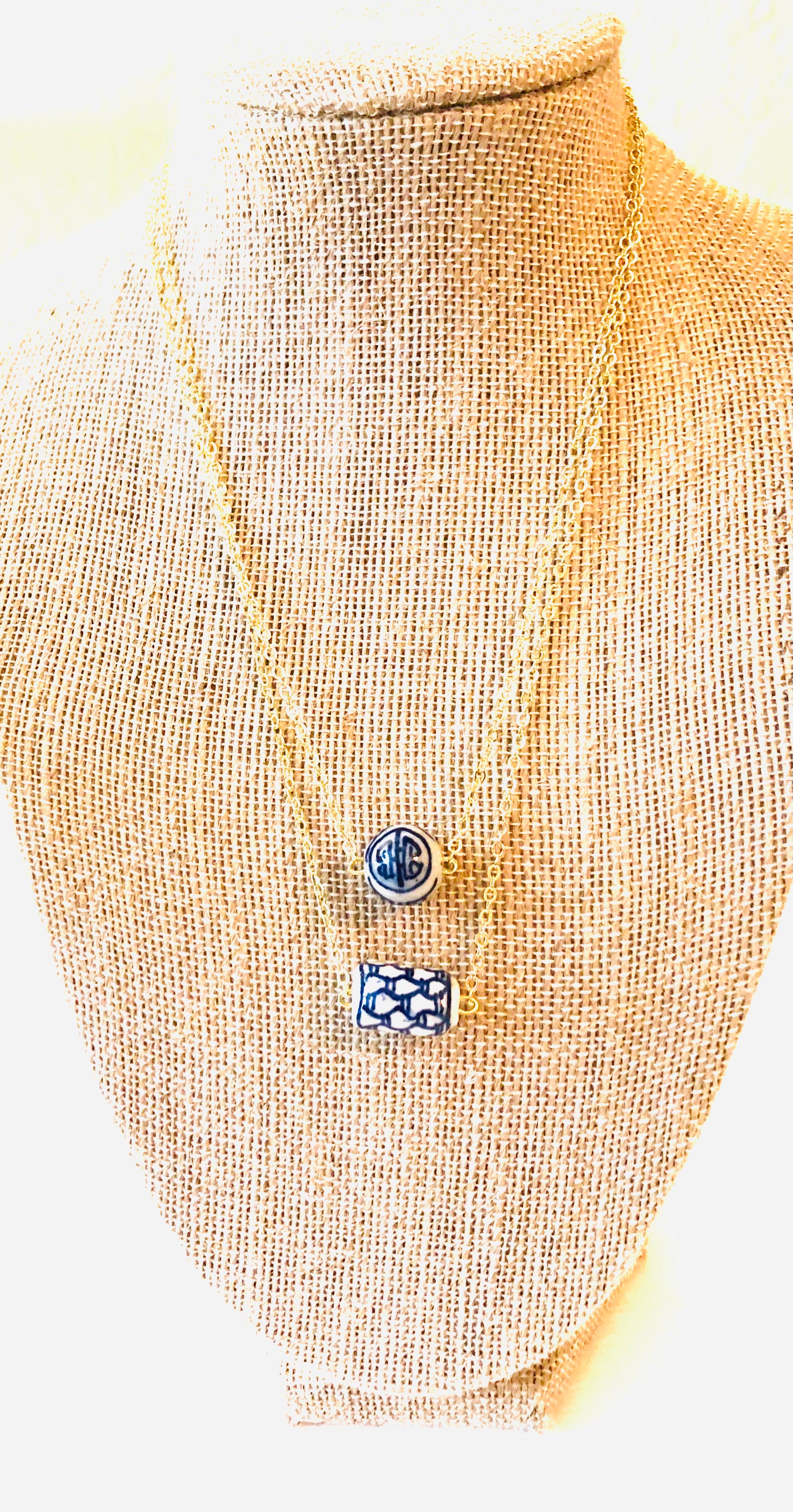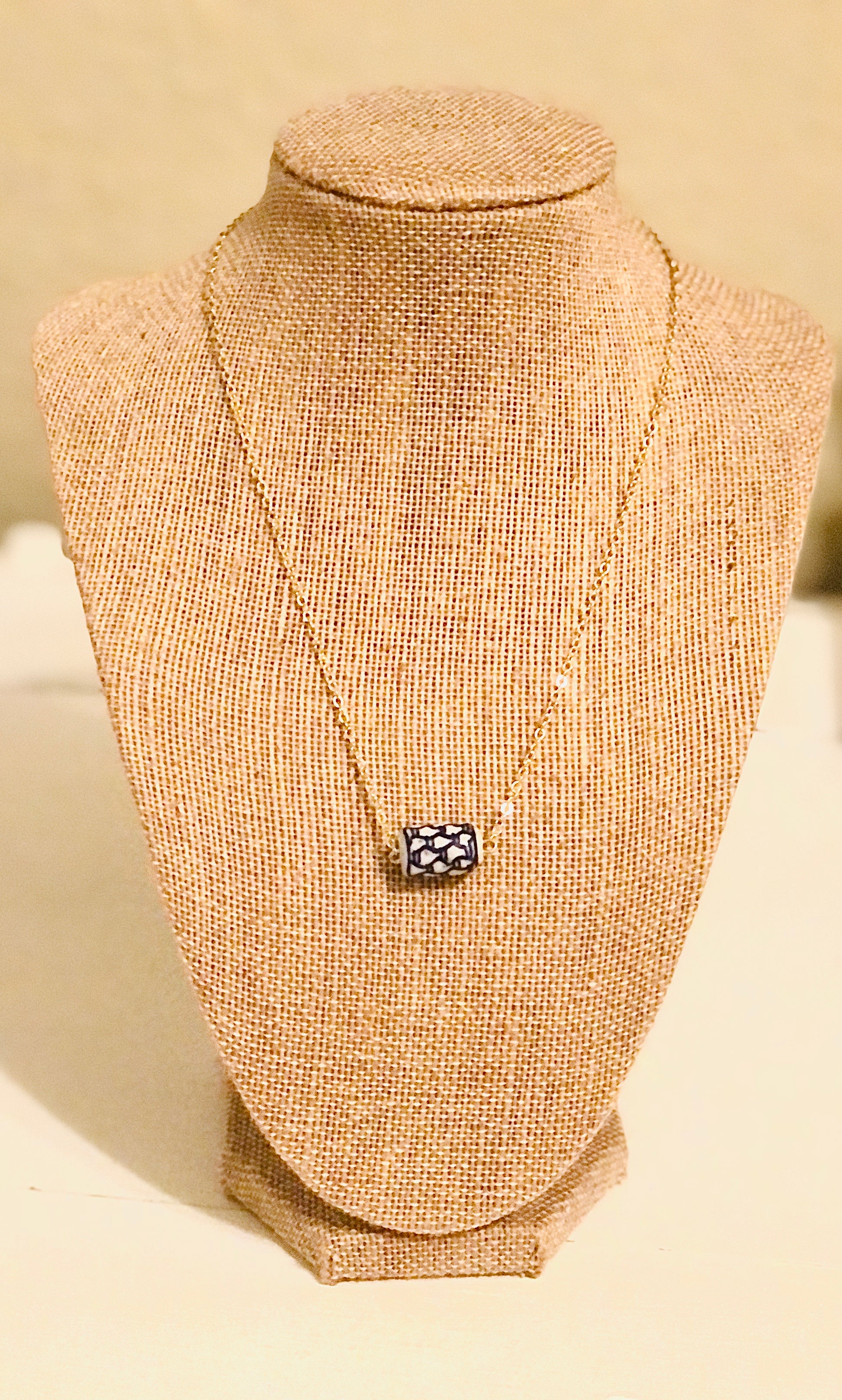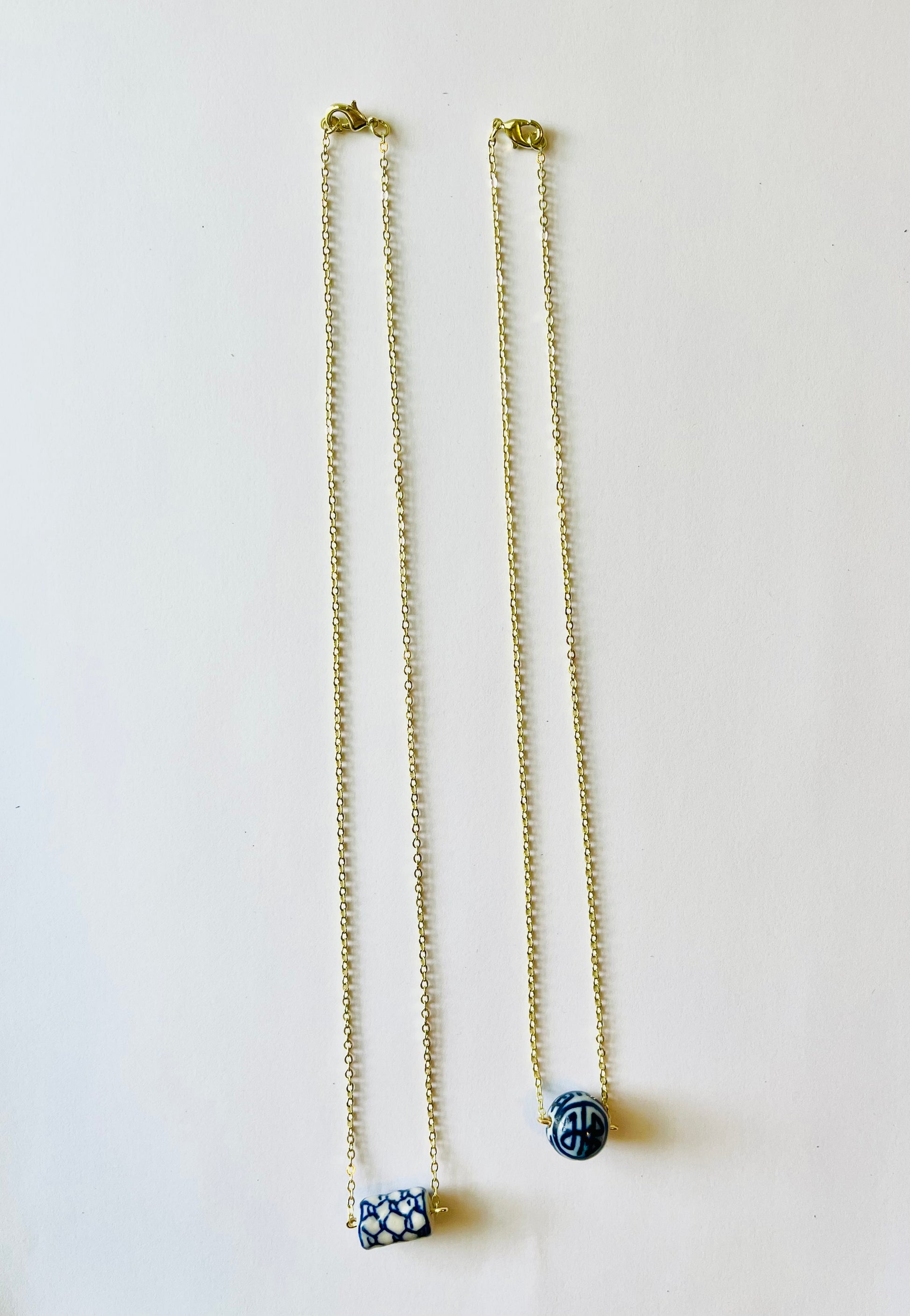This necklace is made with a 16~17mm blue and white chinoiserie porcelain column bead and a gold plated flat cable chain. The necklace measures about 17 inches long. Each blue and white chinoiserie bead is porcelain and may vary in size shape and or color.