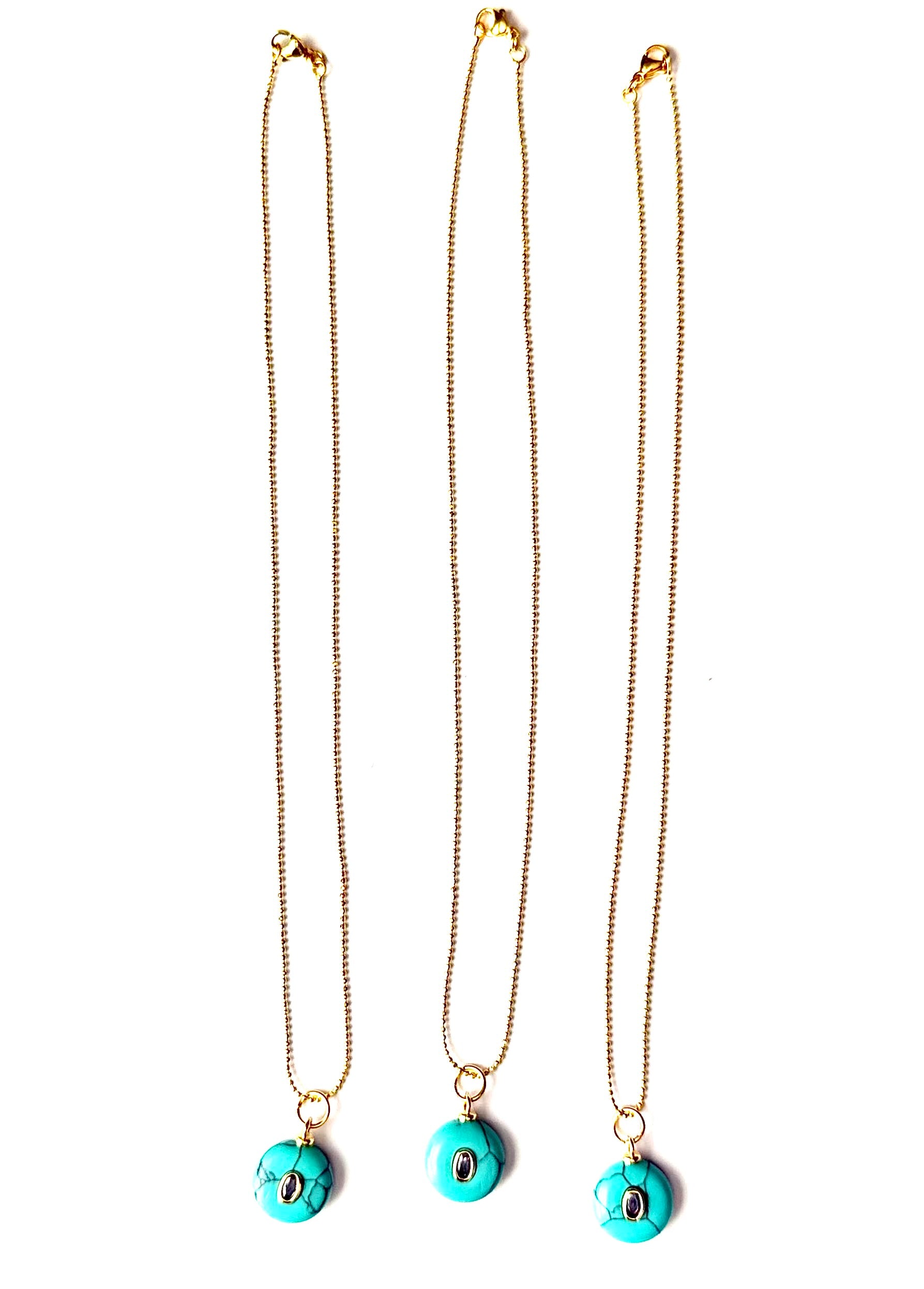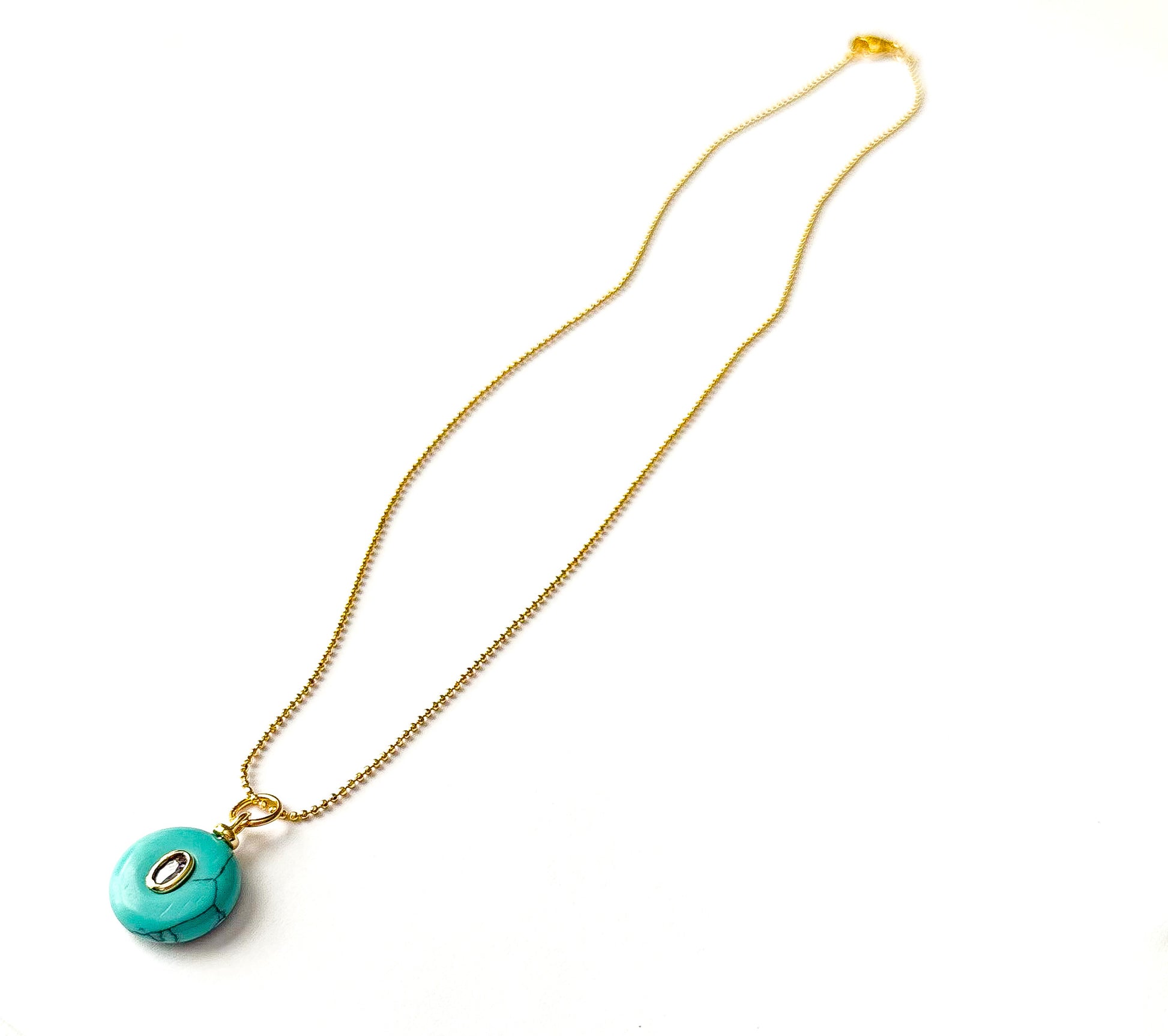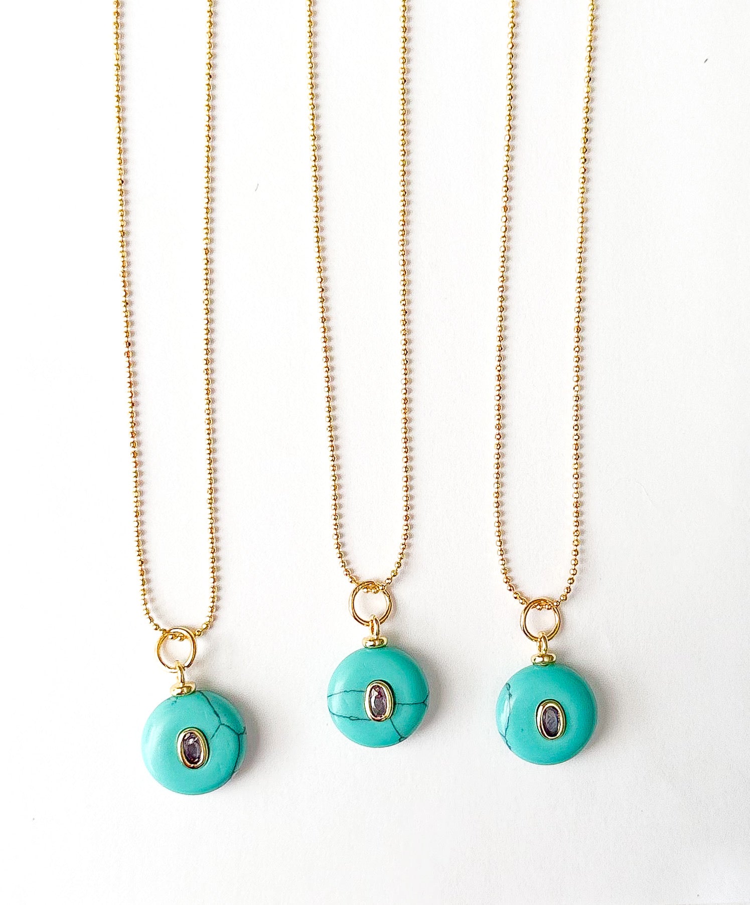 The Cameron Necklace is made with an 18k gold plated ball and chain, a 16x21mm round turquoise pendant with oval zircon inlay and gold loop. The Cameron necklace measures about 17.5 inches long.