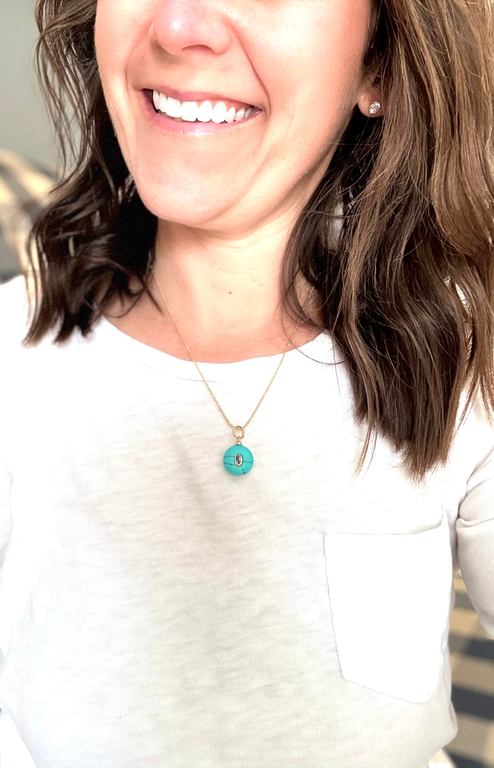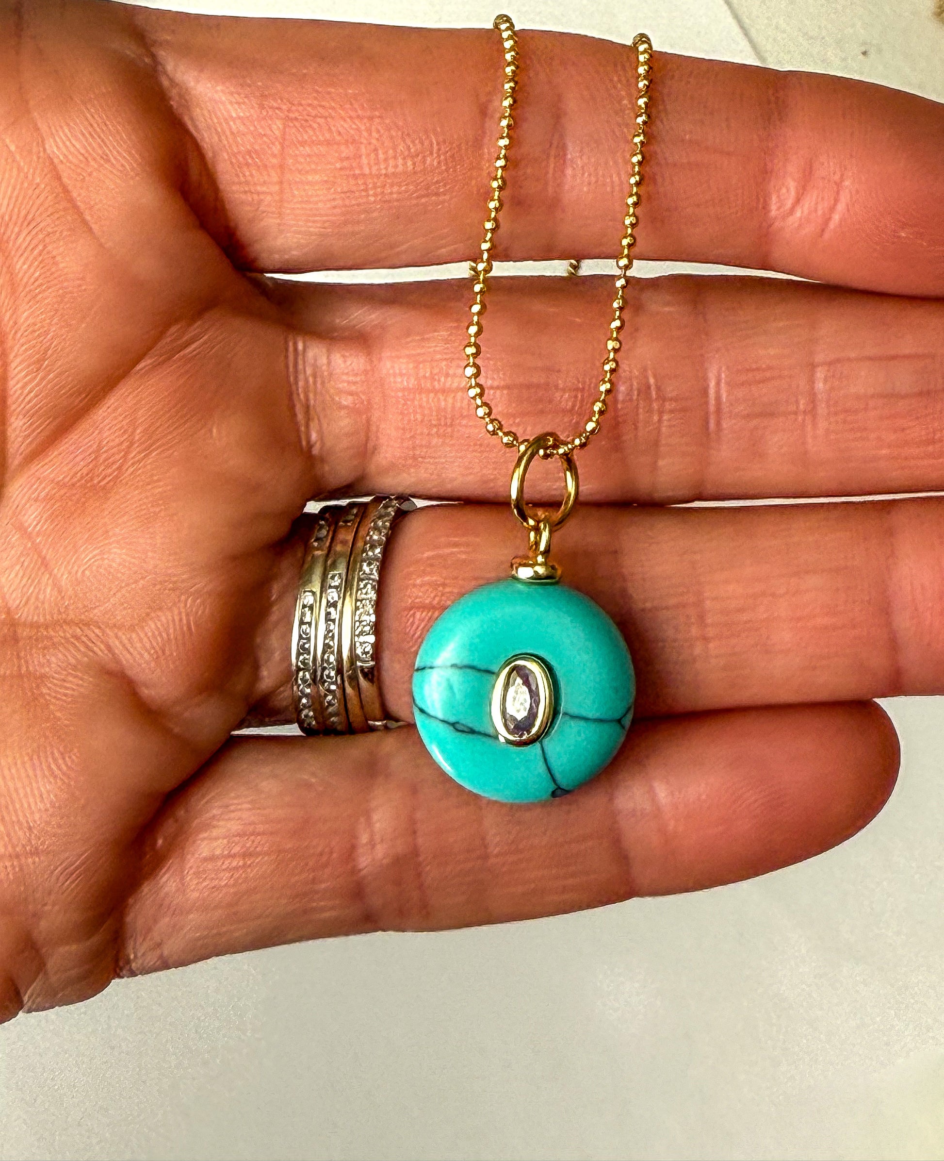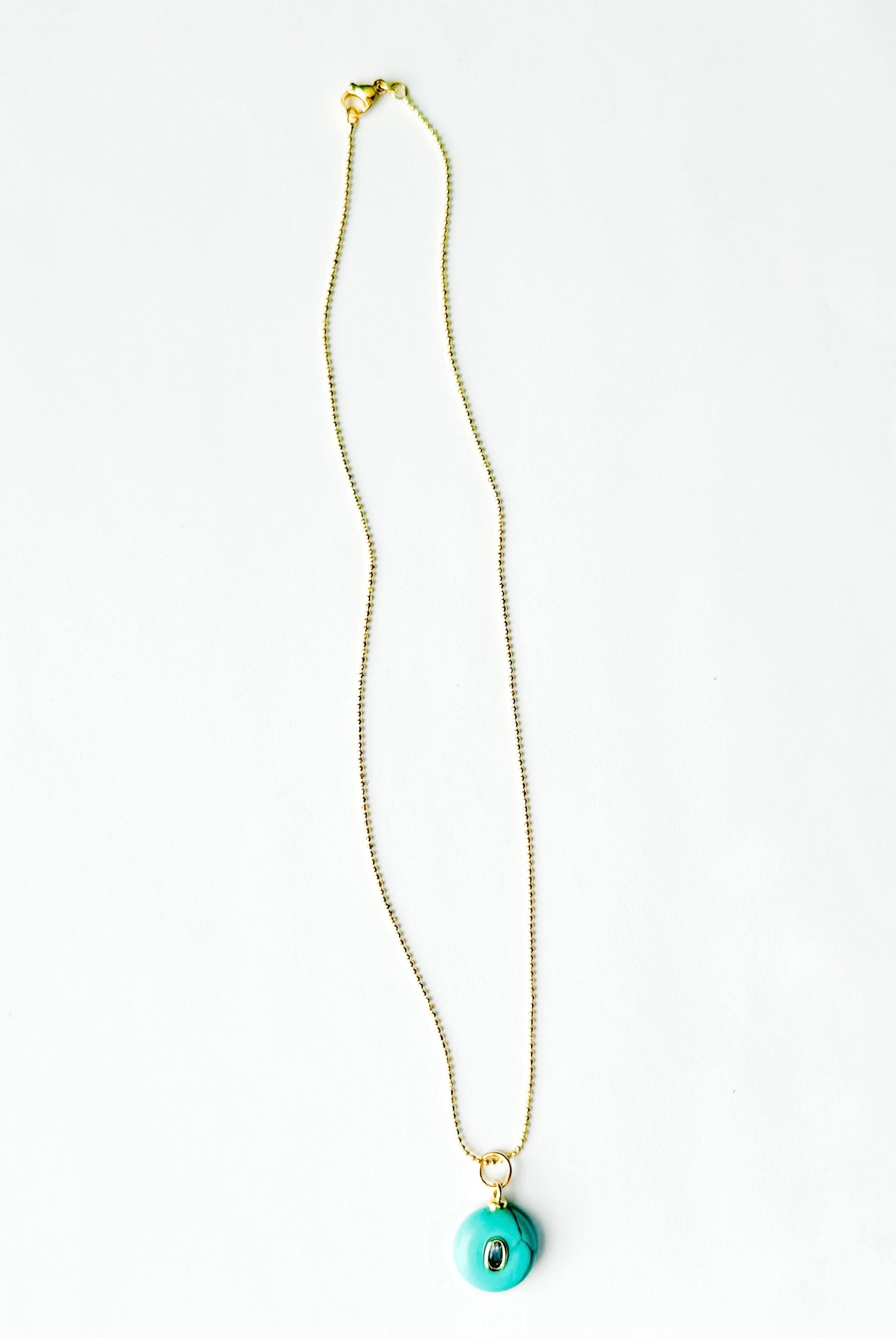 The Cameron Necklace is made with an 18k gold plated ball and chain, a 16x21mm round turquoise pendant with oval zircon inlay and gold loop. The Cameron necklace measures about 17.5 inches long.