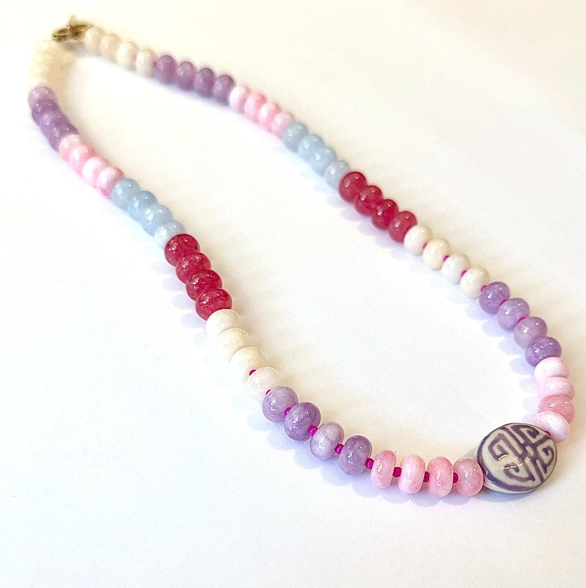 This necklace is made with 8.5mm Jade beads, a light purple flat oval chinoiserie bead, and fastens together with an 18k gold plated toggle clasp. The necklace measures 18 inches long