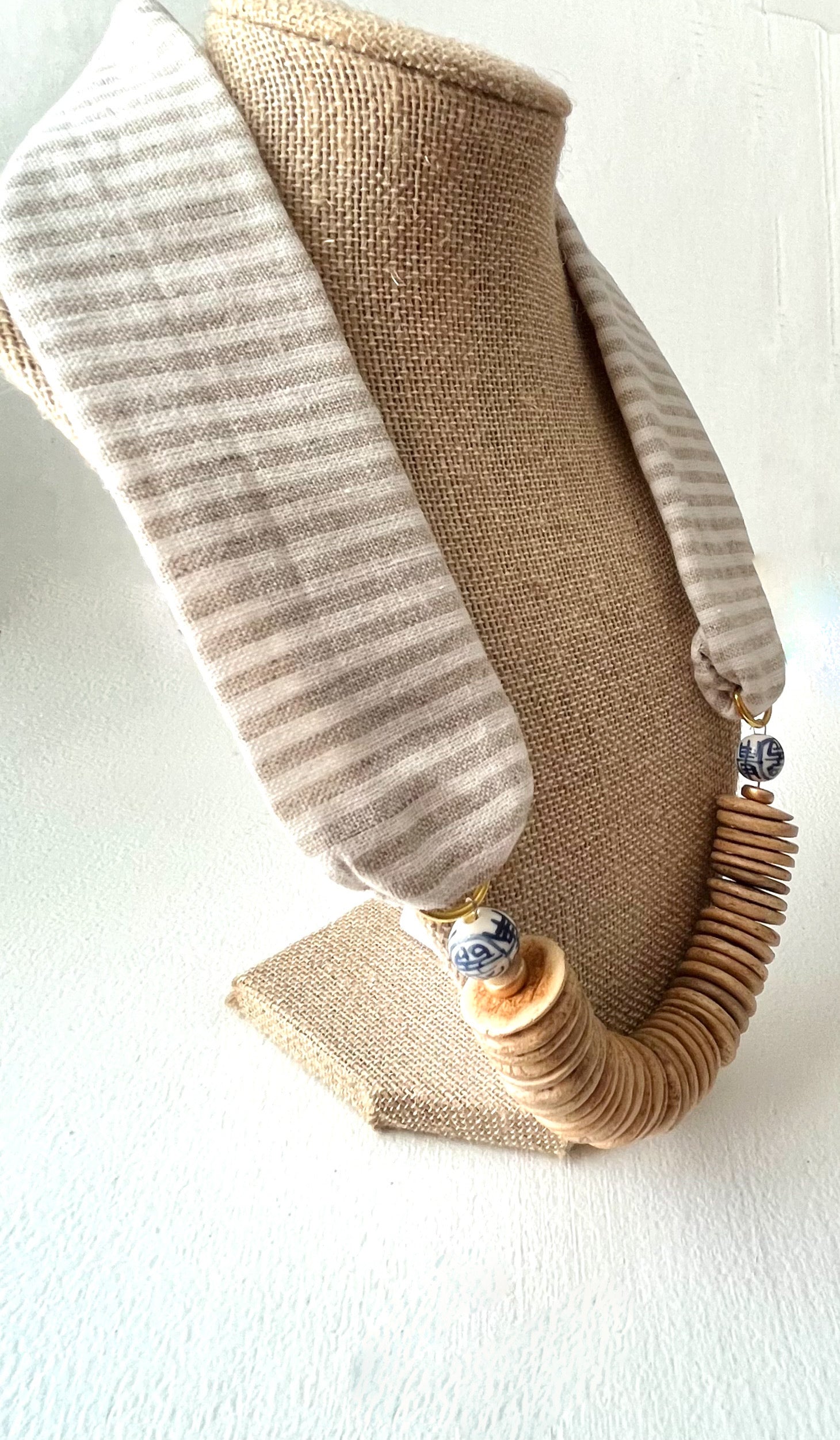 The Margaret Necklace is made with a khaki and white stripe linen fabric, a blue and white chinoiserie bead, large coconut beads and a magnetic clasp. The necklace measures about 24~25 inches long.