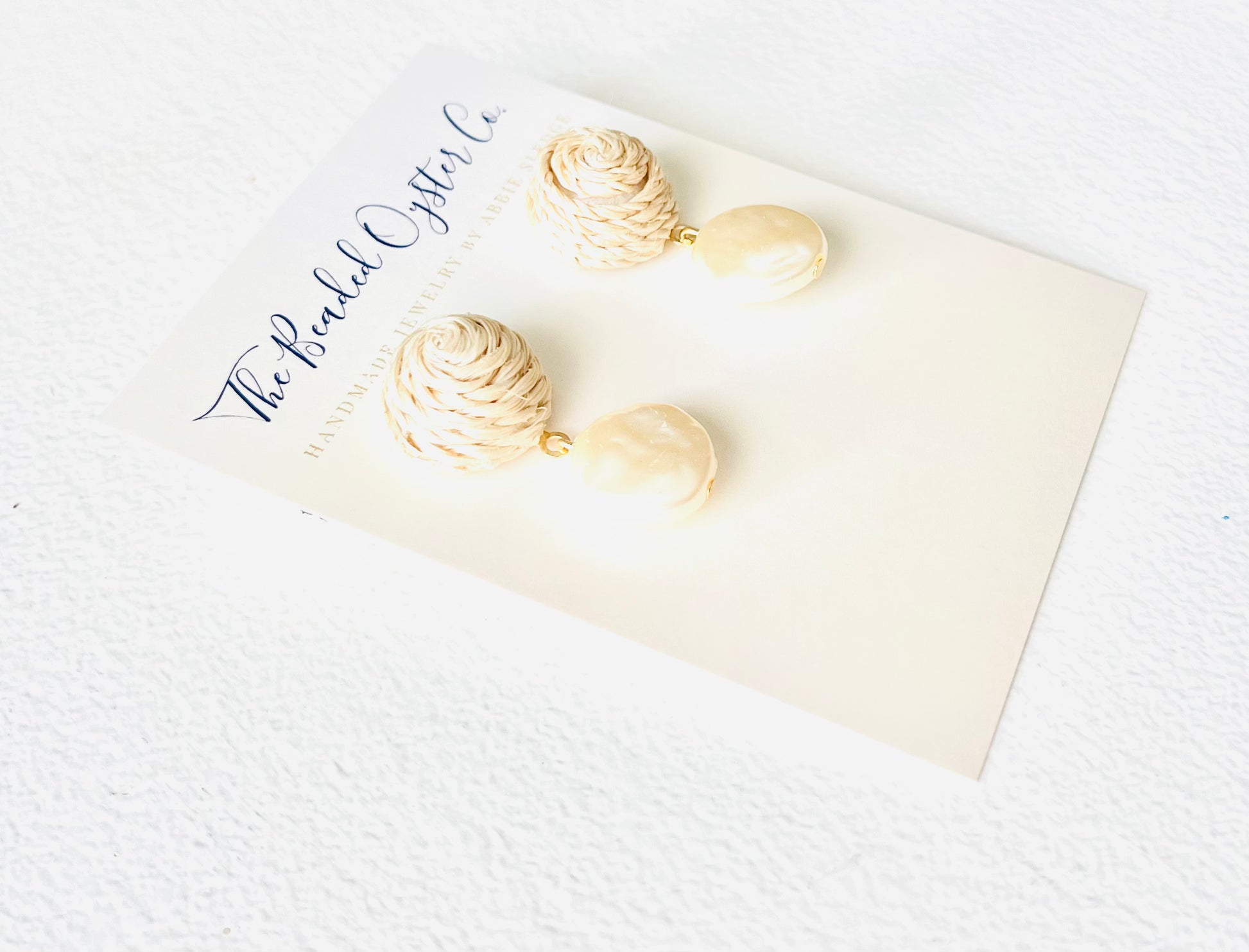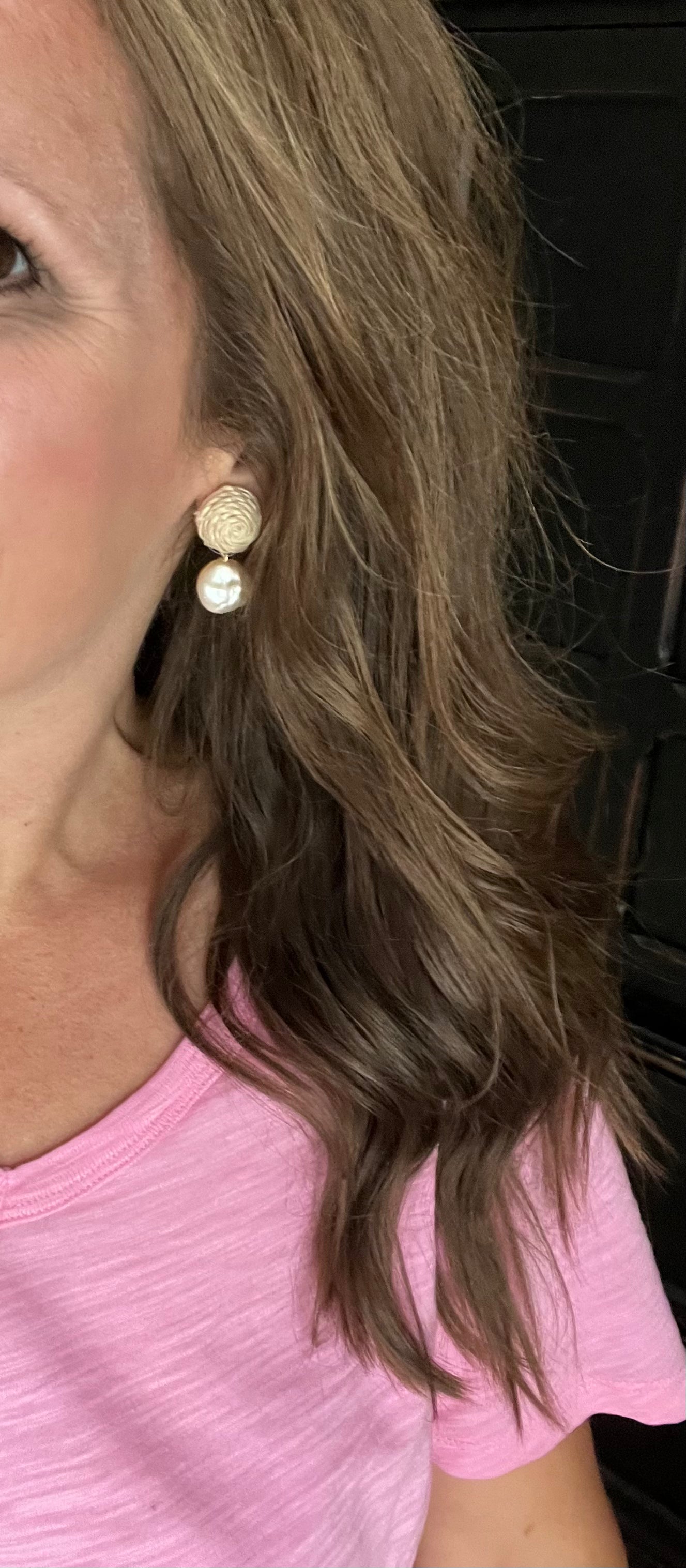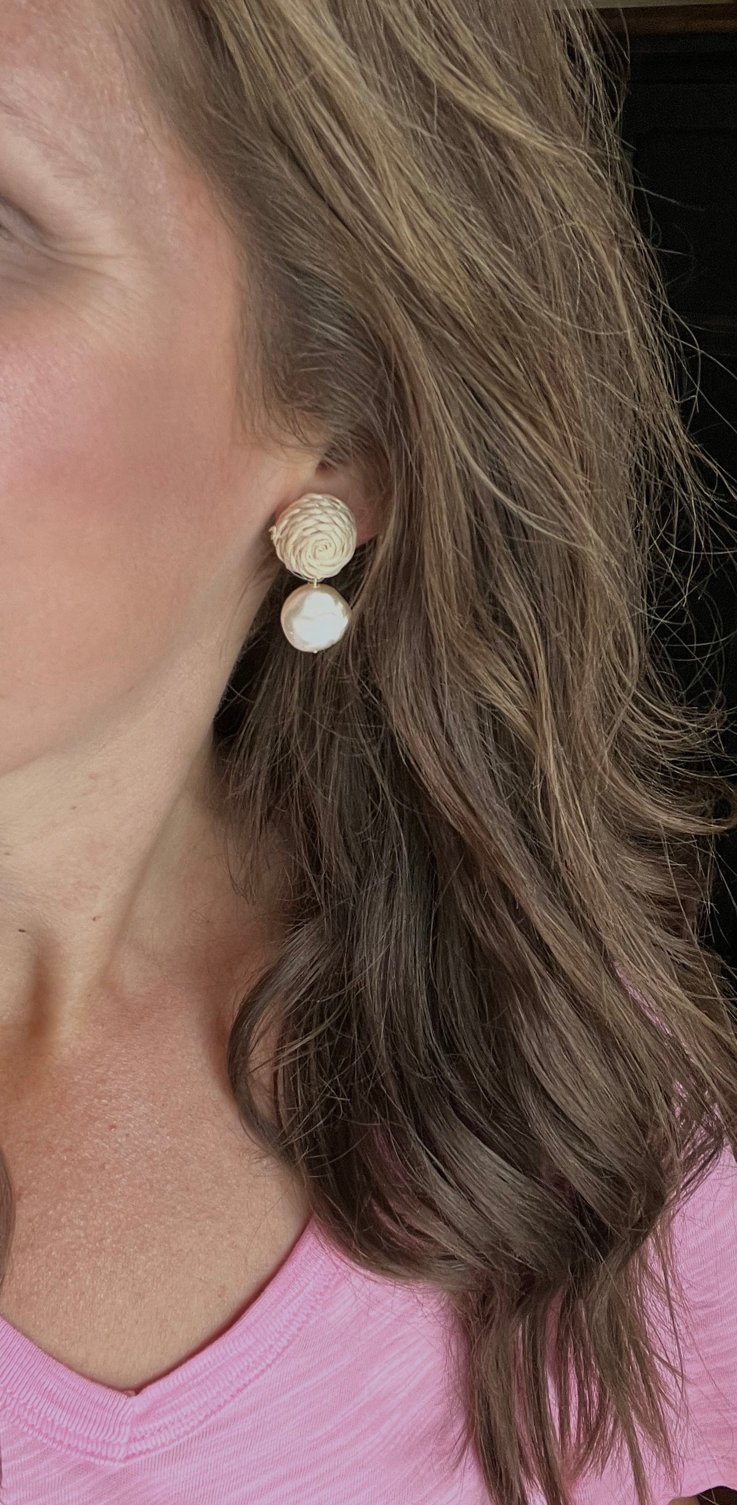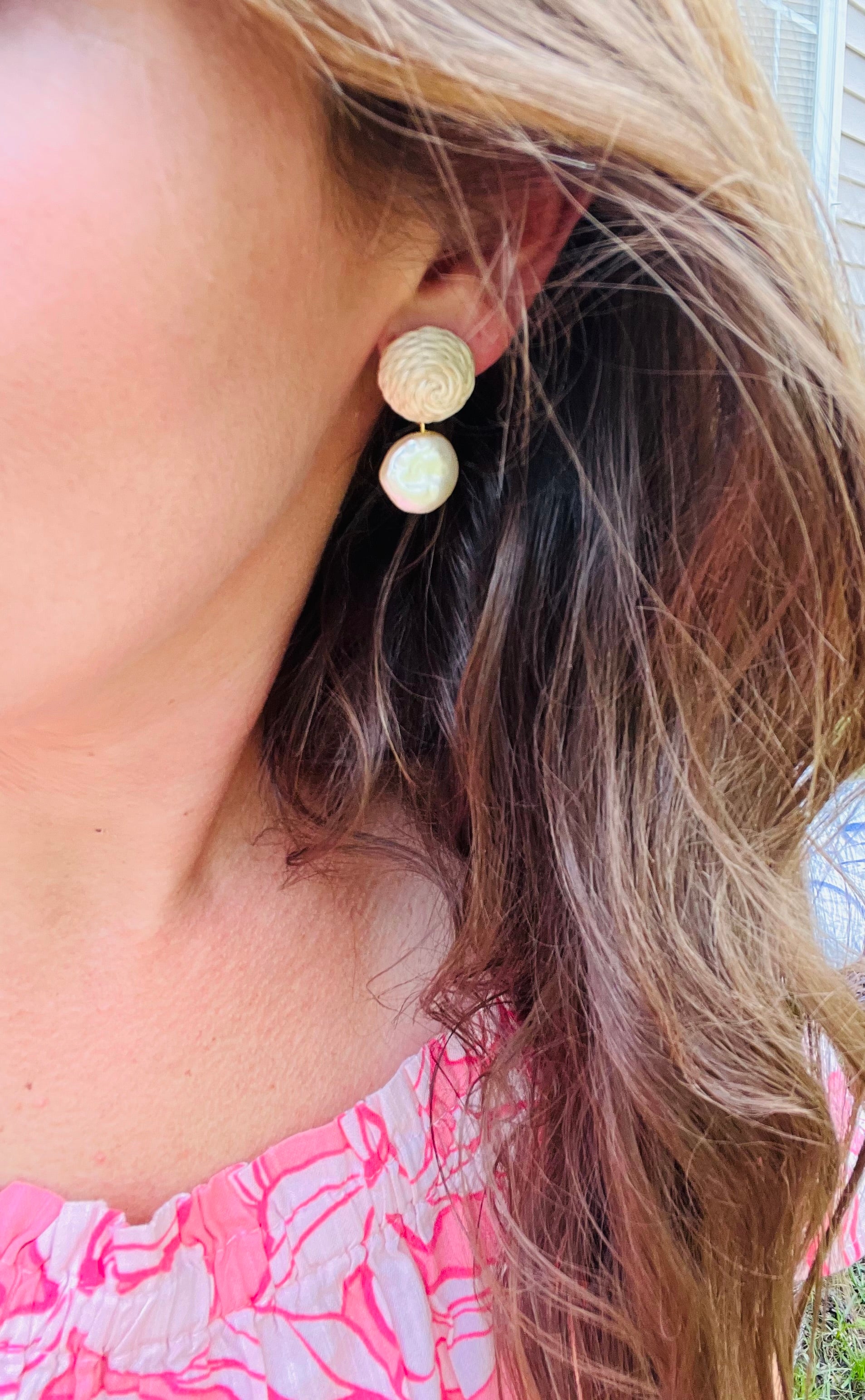 These earrings are made with a 15mm rattan hemisphere stud and a round freshwater pearl bead.