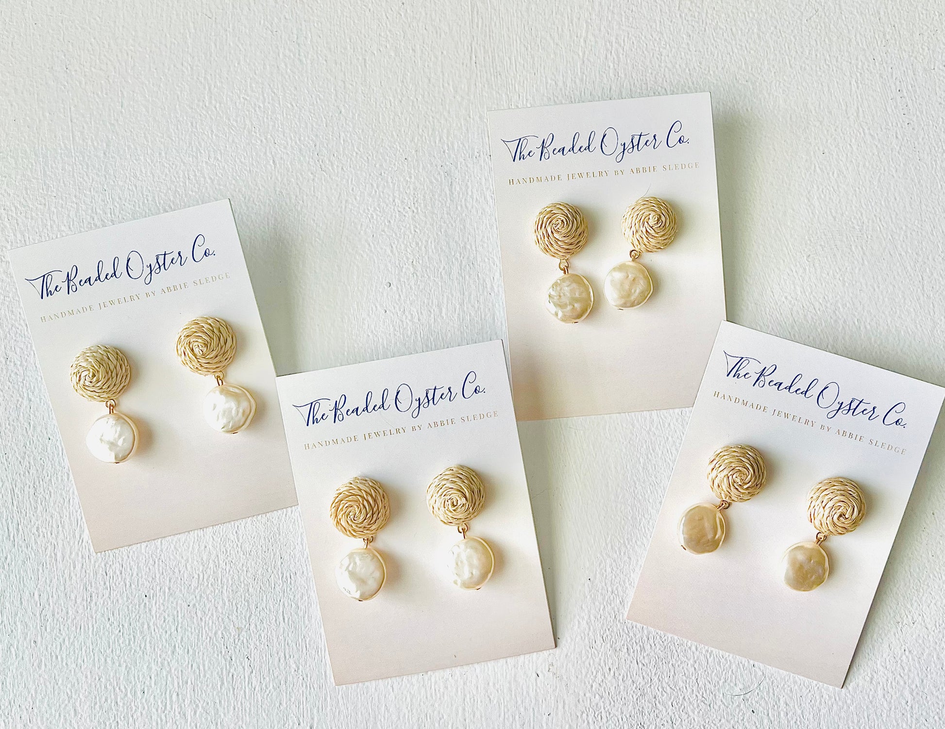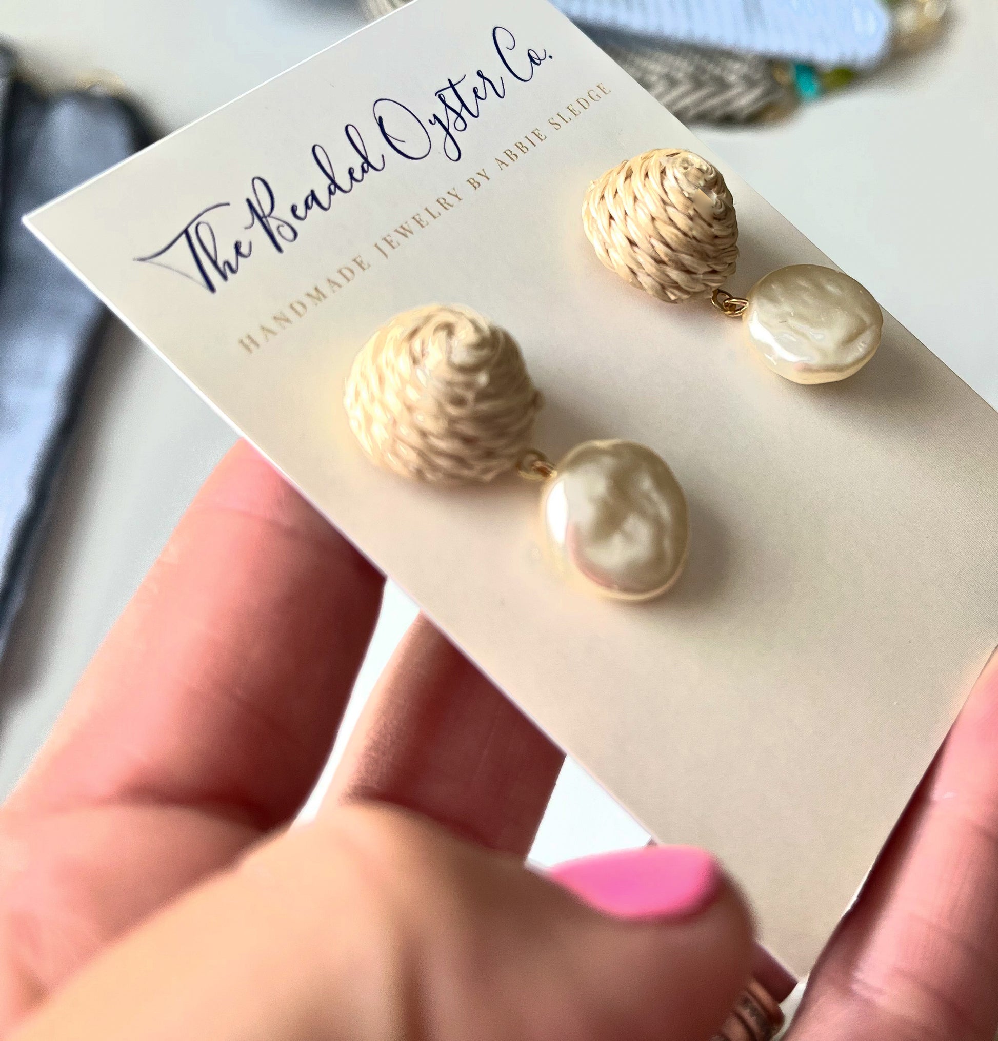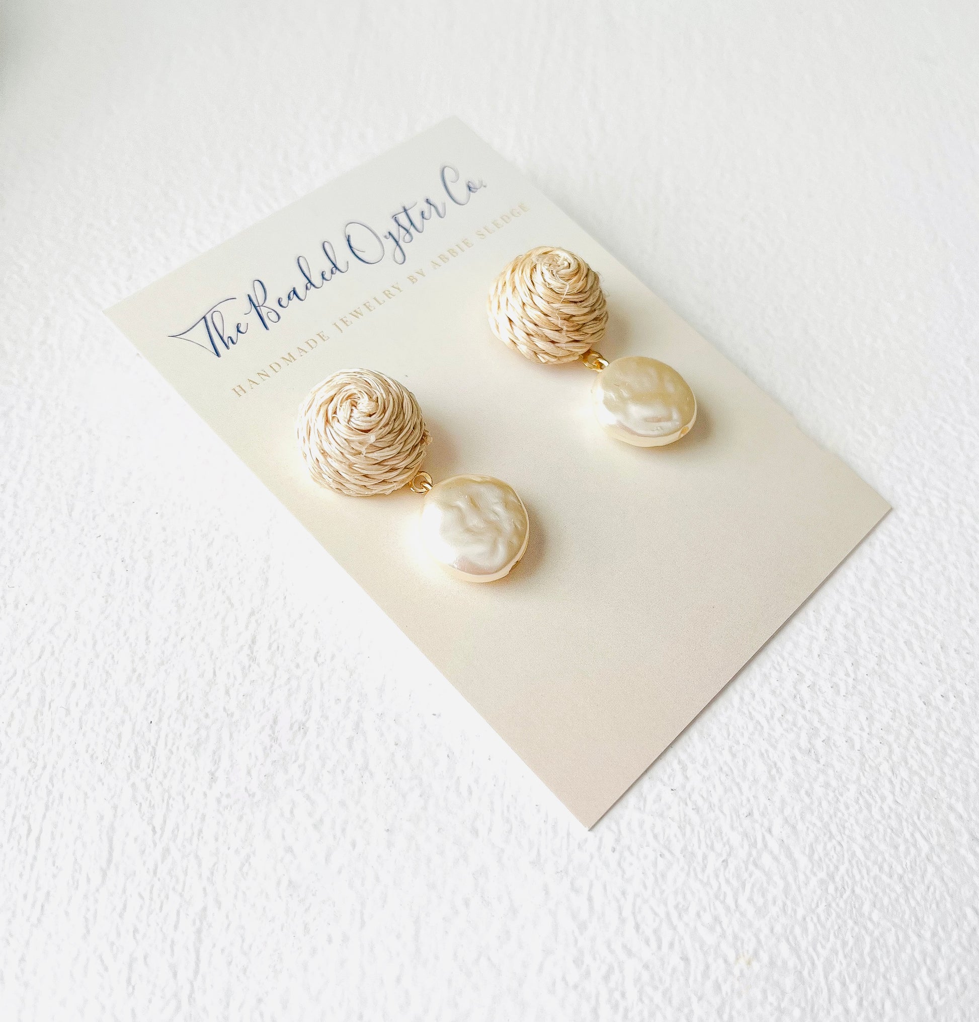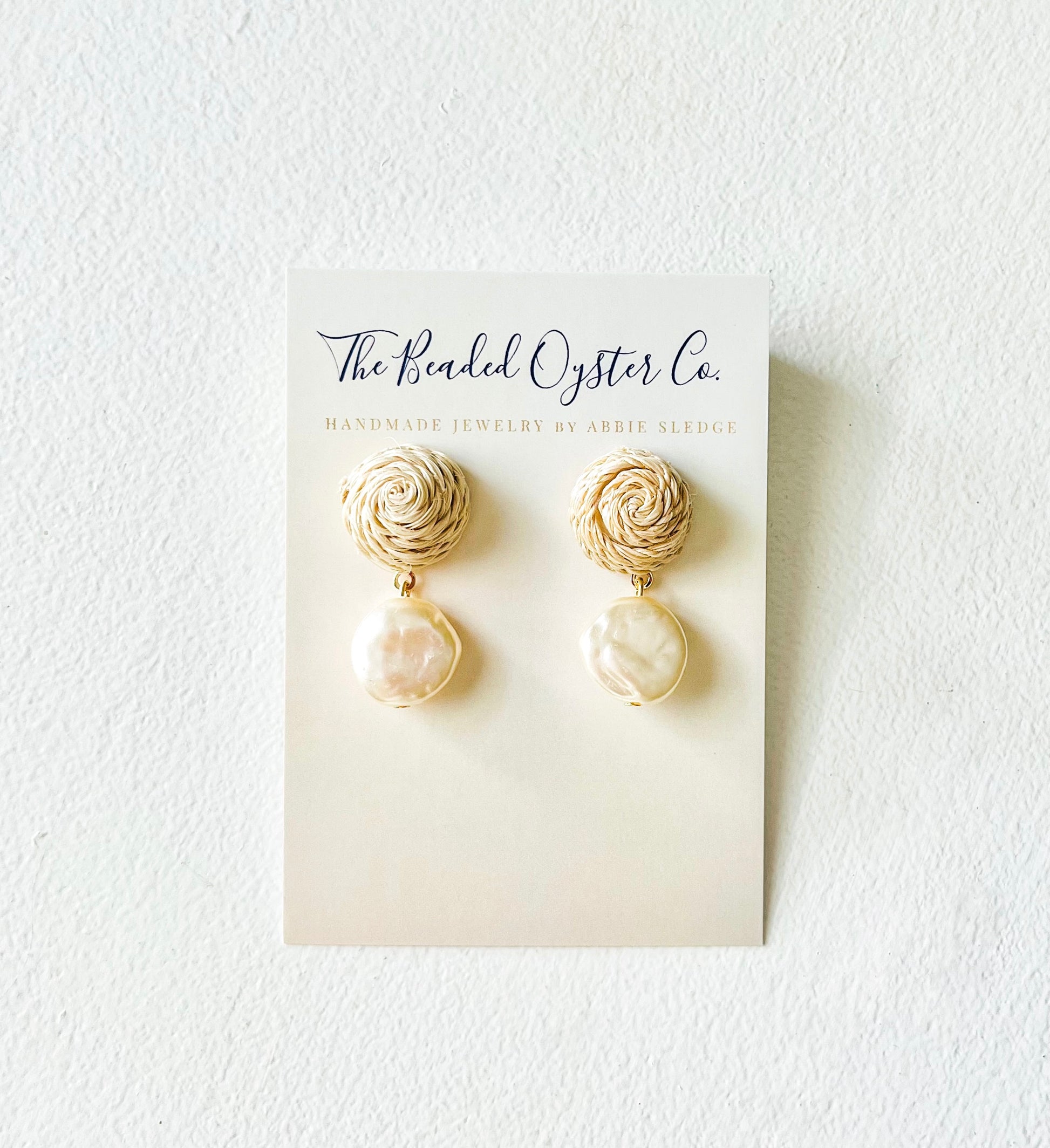 These earrings are made with a 15mm rattan hemisphere stud and a round freshwater pearl bead.
