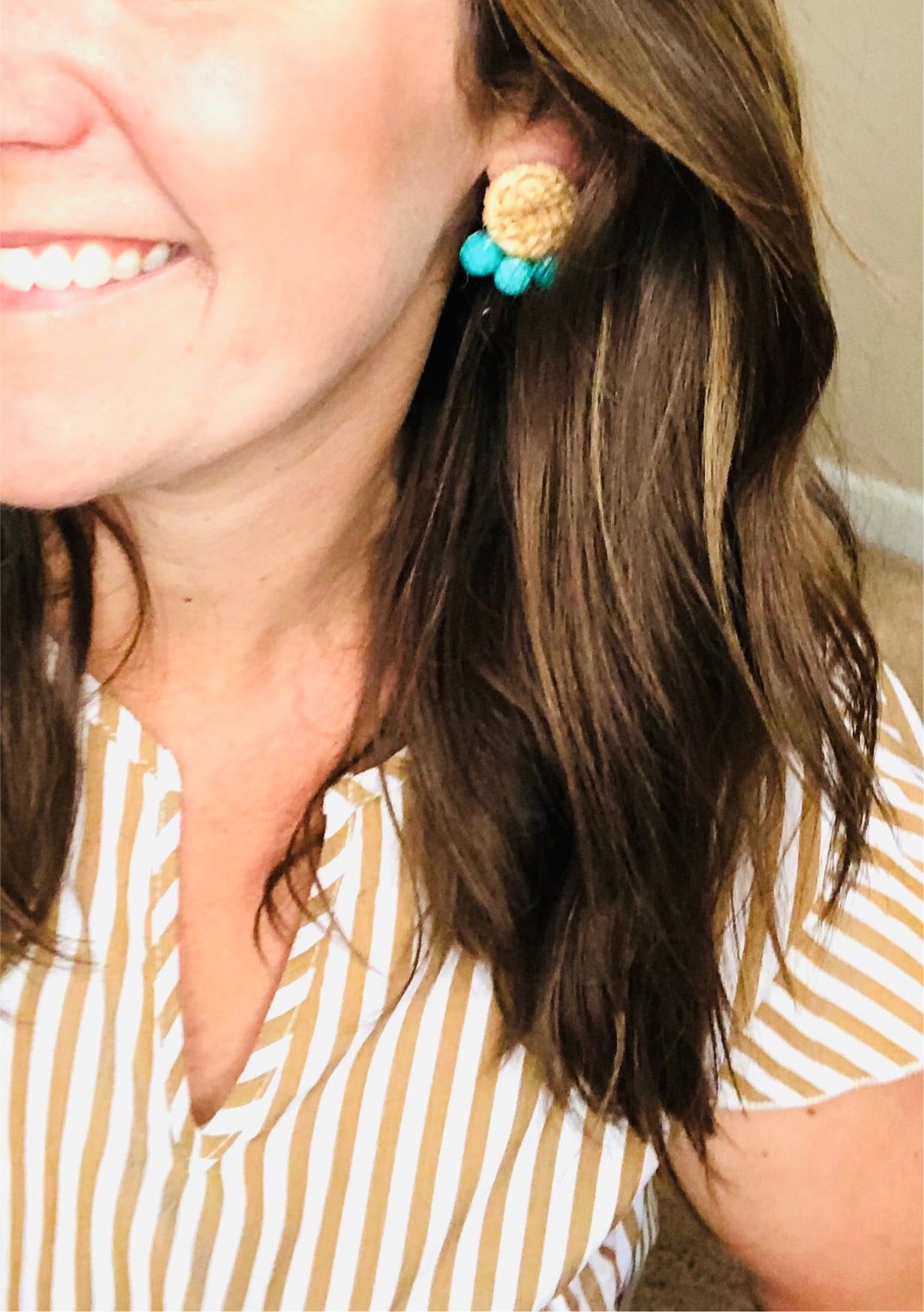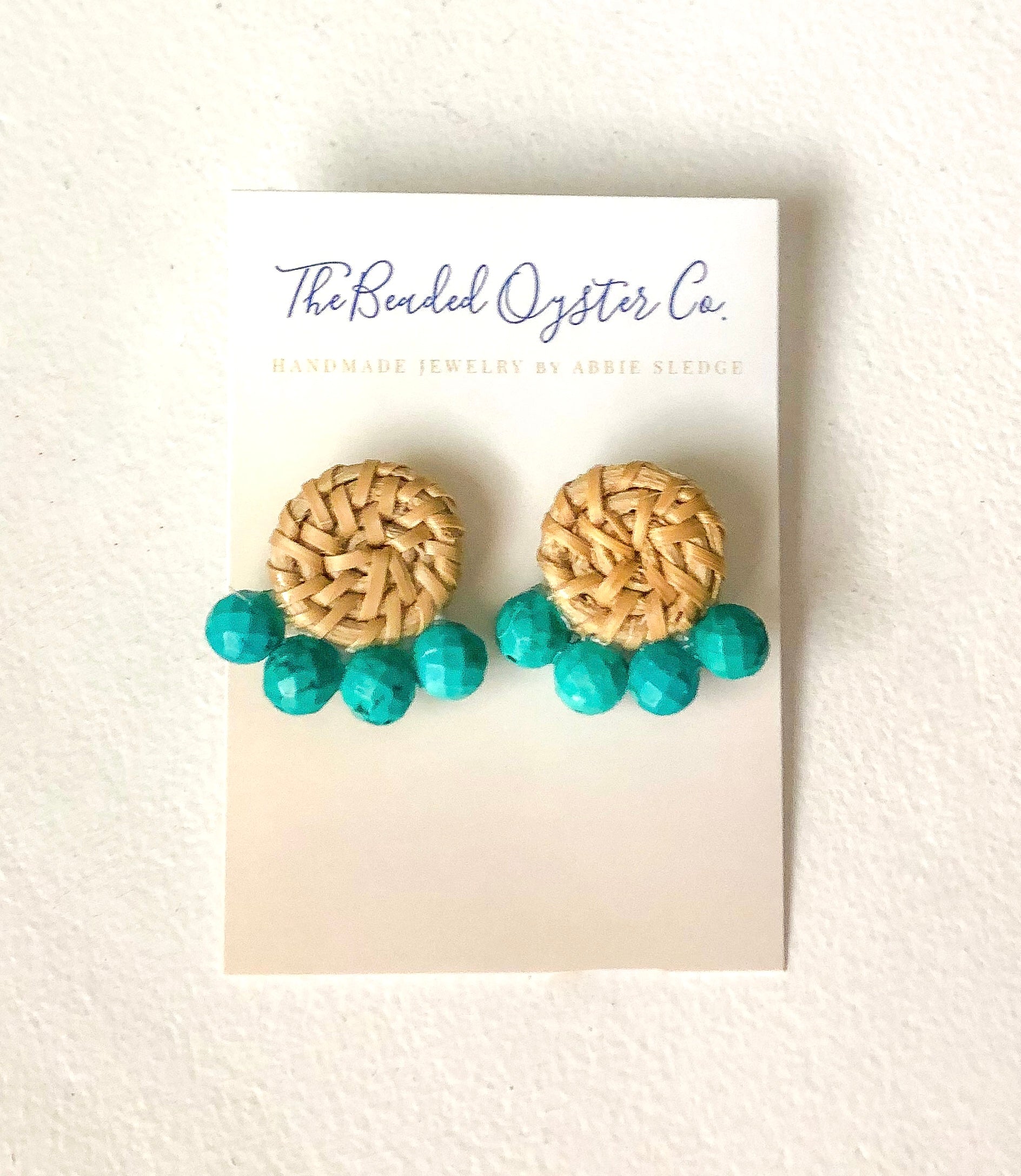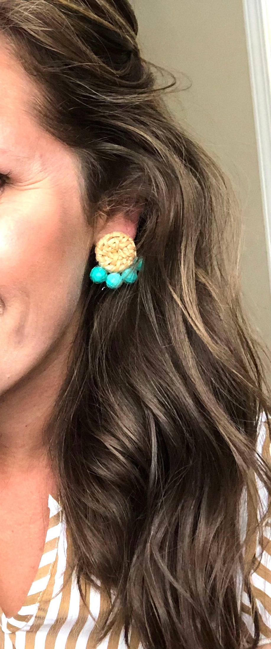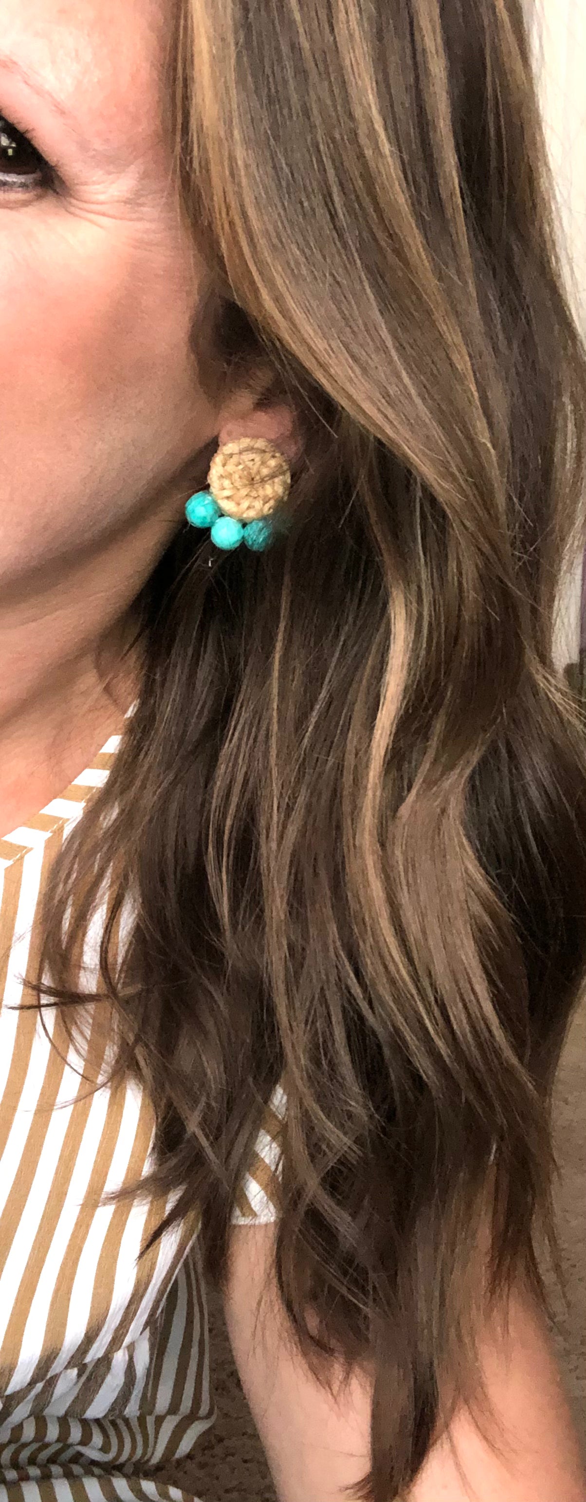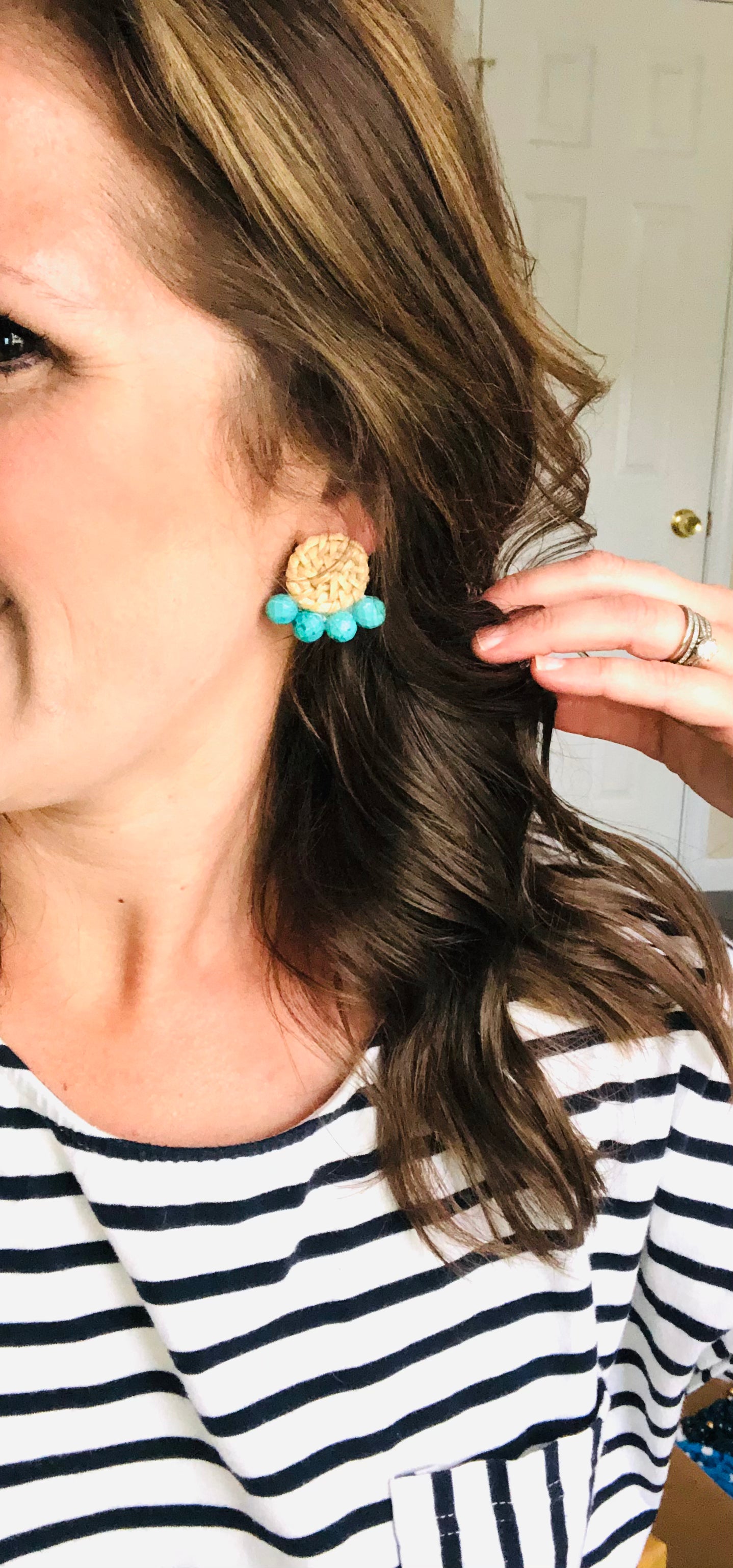 These earrings are made with a 20mm natural beige handwoven rattan wooden straw earring with stud and 4 turquoise faceted beads. The earrings measure about 1.5 inches long and about 1.5 inches wide.