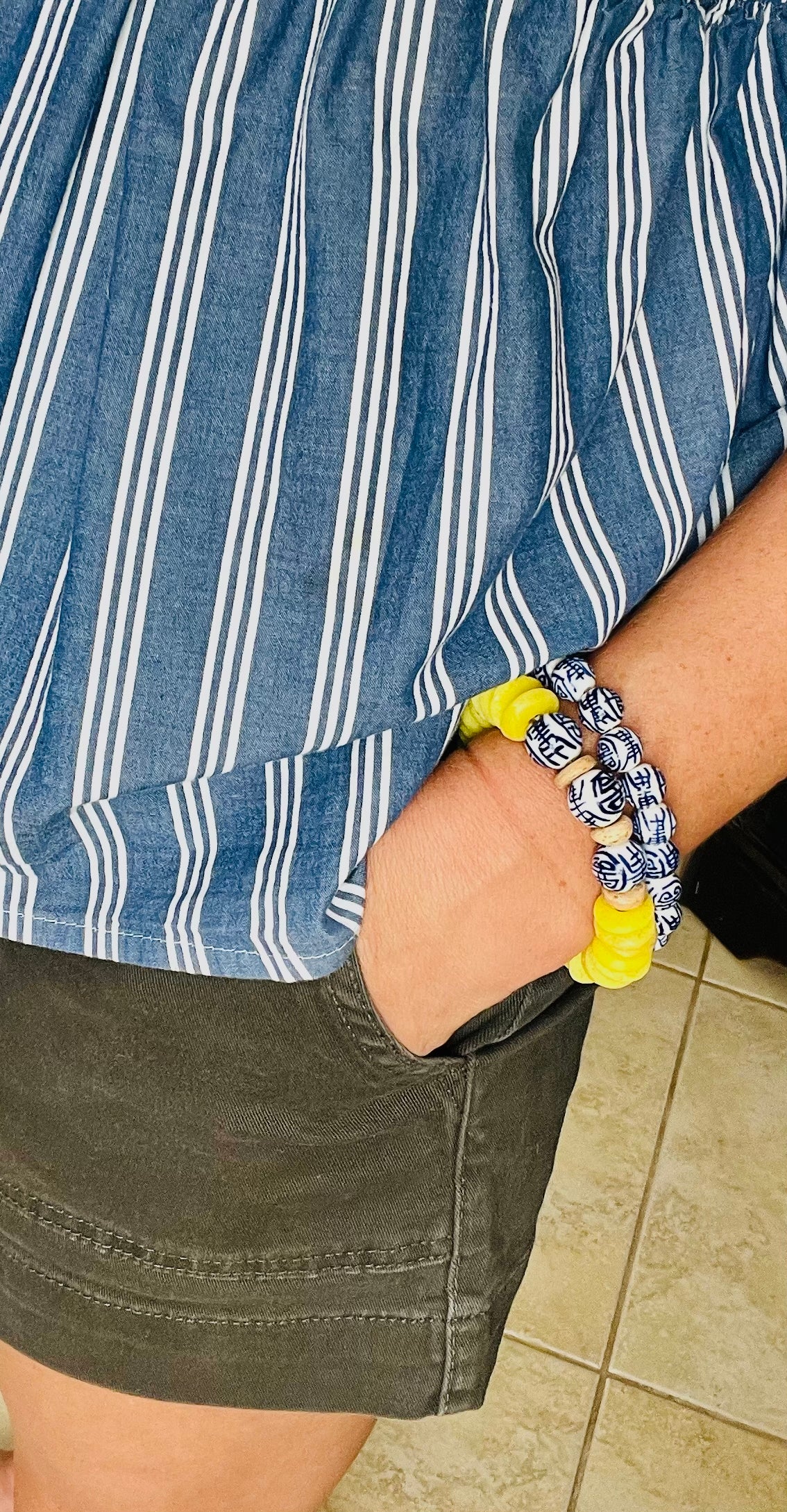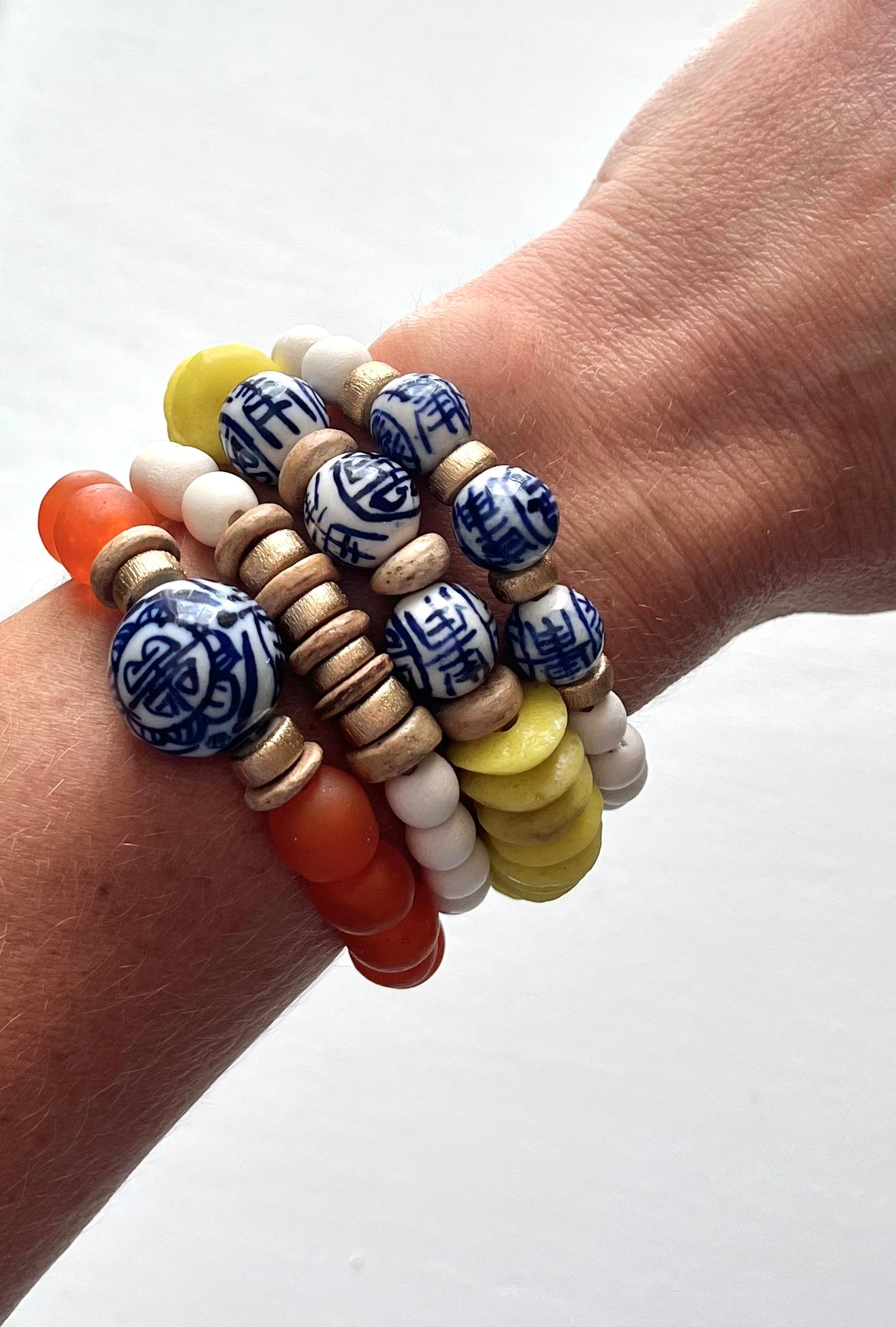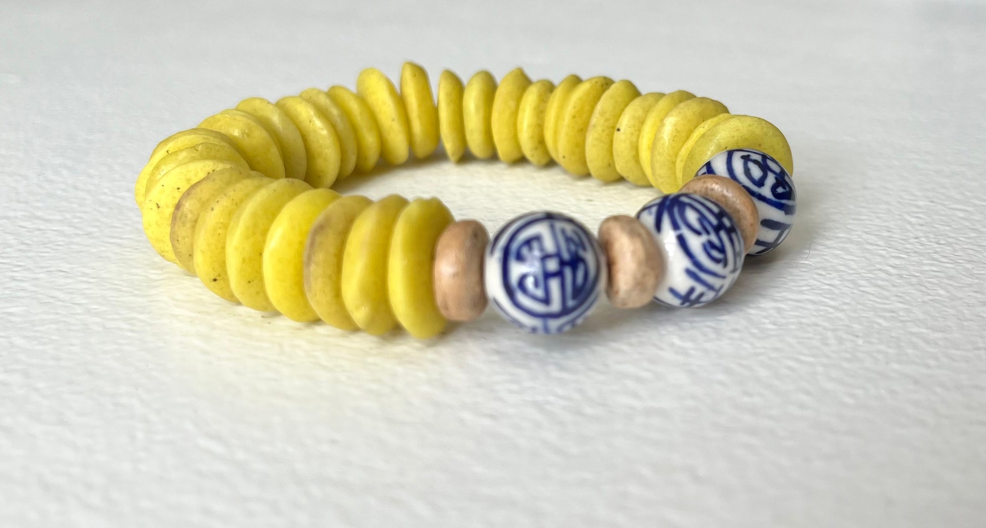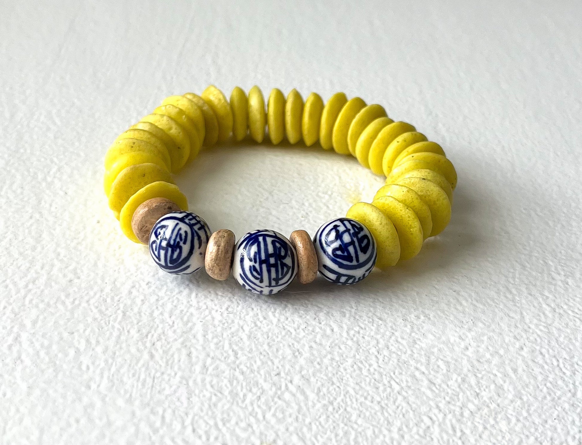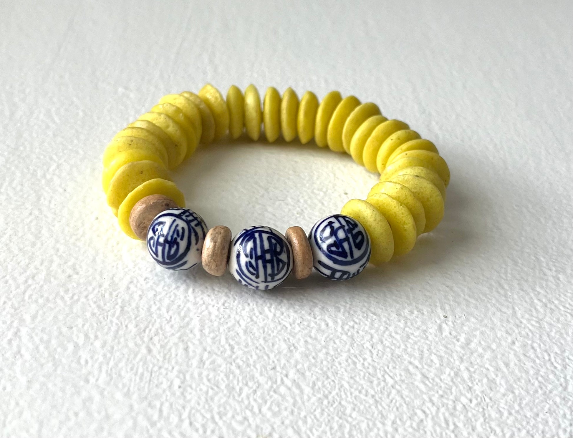 The Tatum bracelet is made with sunflower yellow Ashanti glass saucer beads, natural wood beads and blue and white chinoiserie beads.