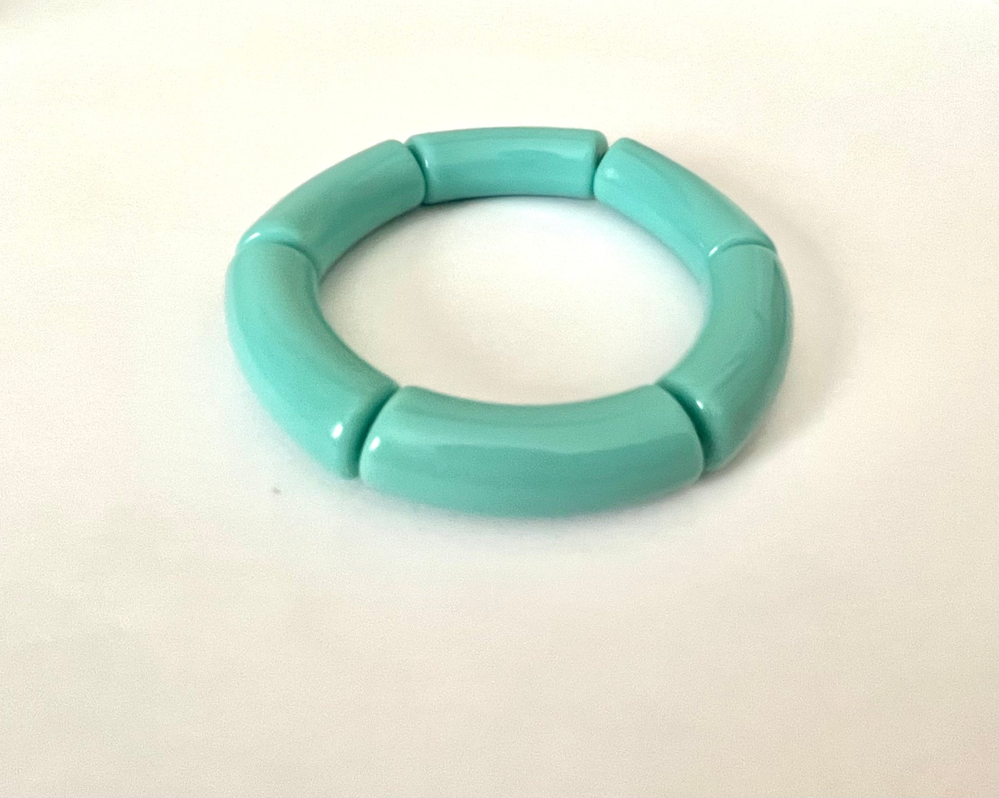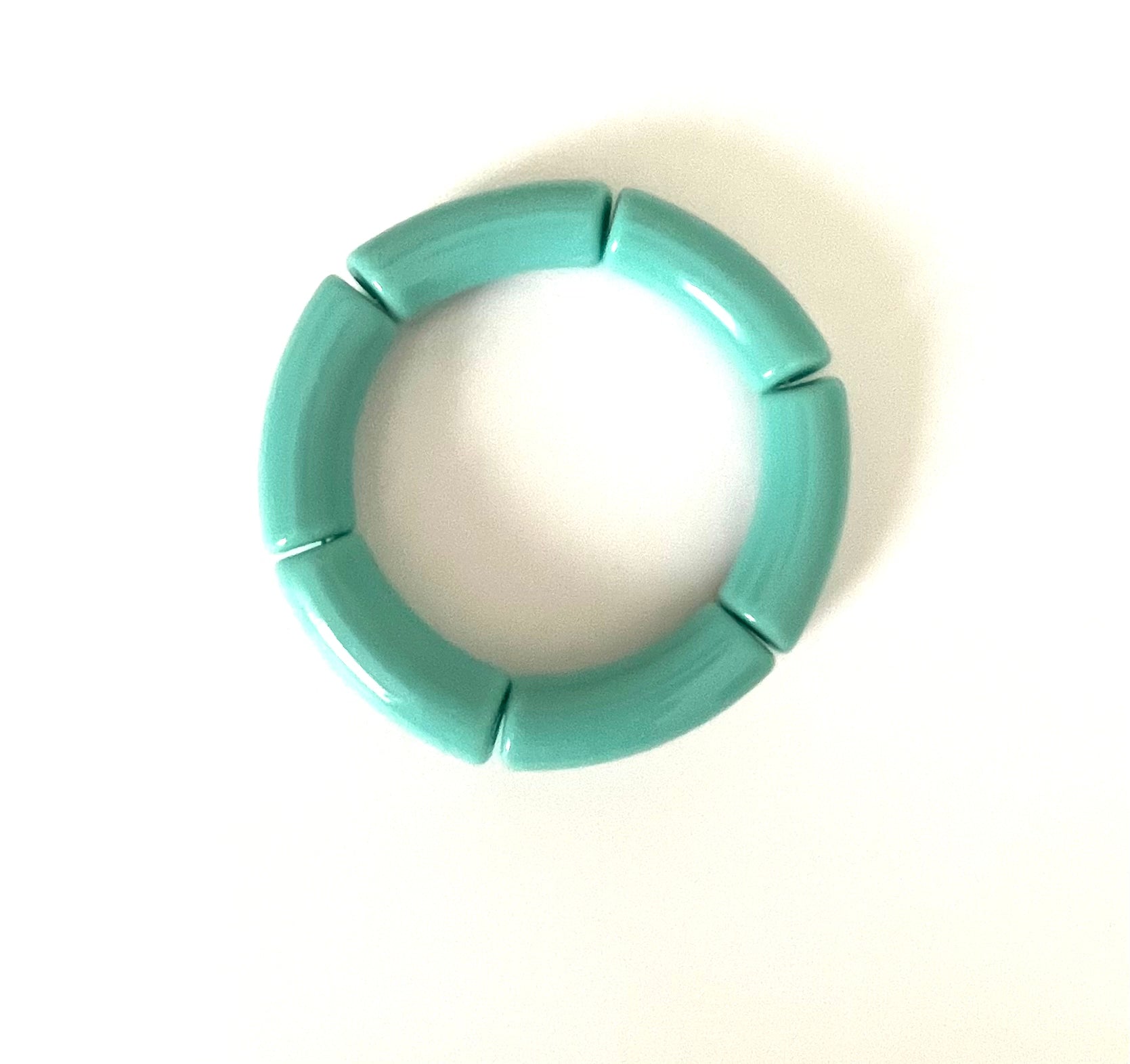 The Ella bracelet is made with a turquoise blue curved acrylic tube bead.