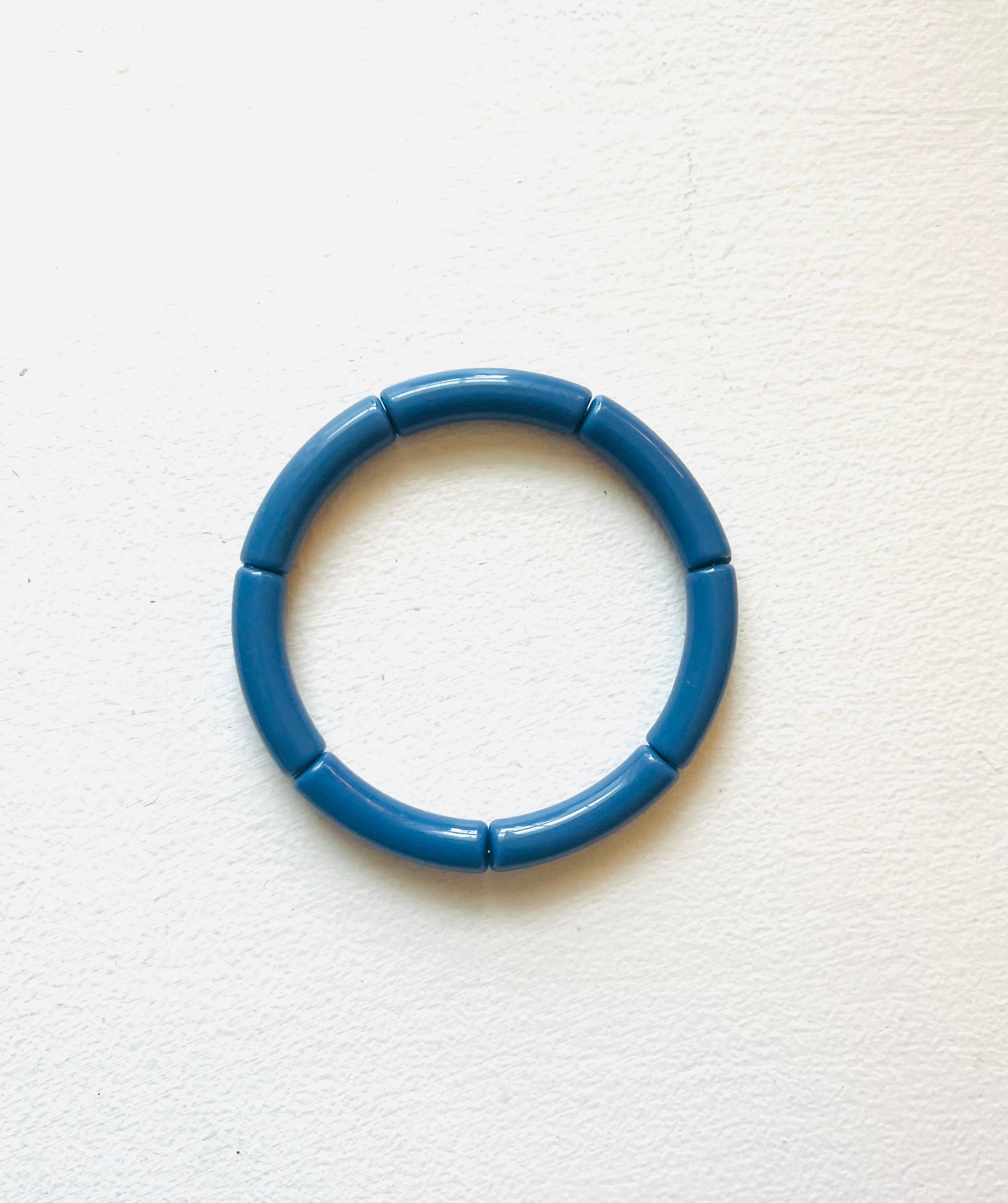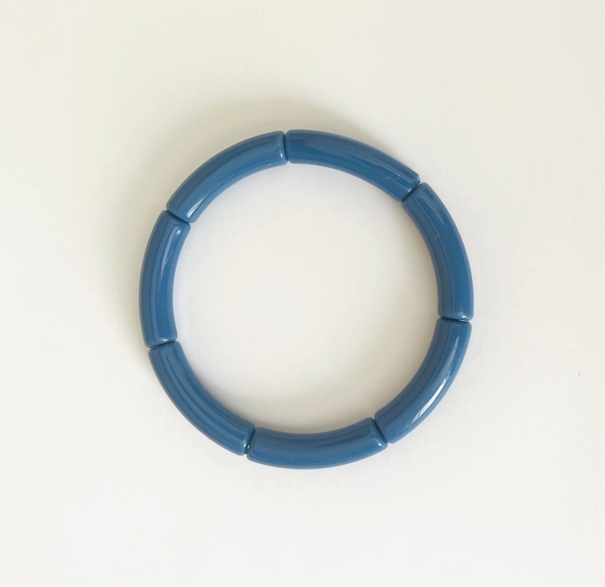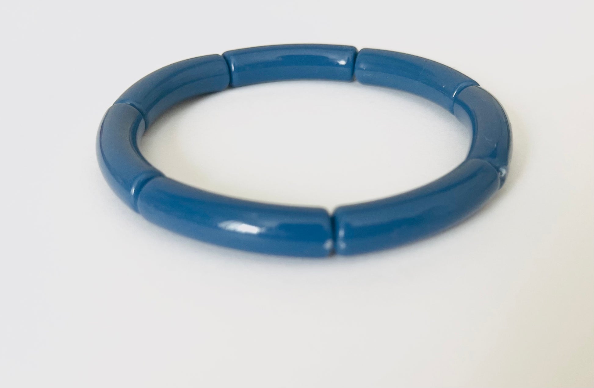 The Logan bracelet is made with a navy curved acrylic tube bead. The bead size is 32x10x8mm.
